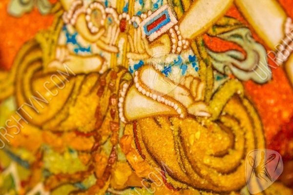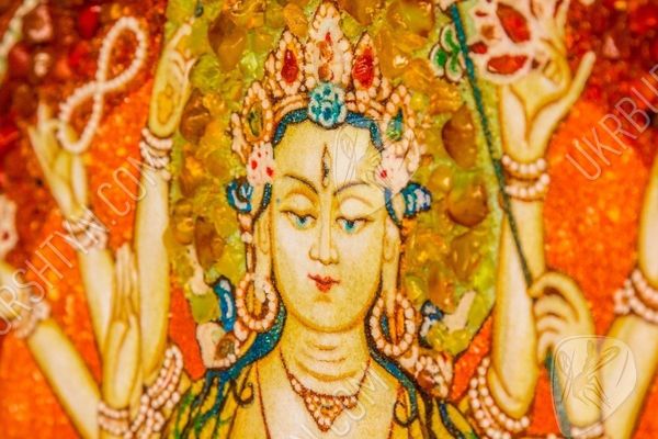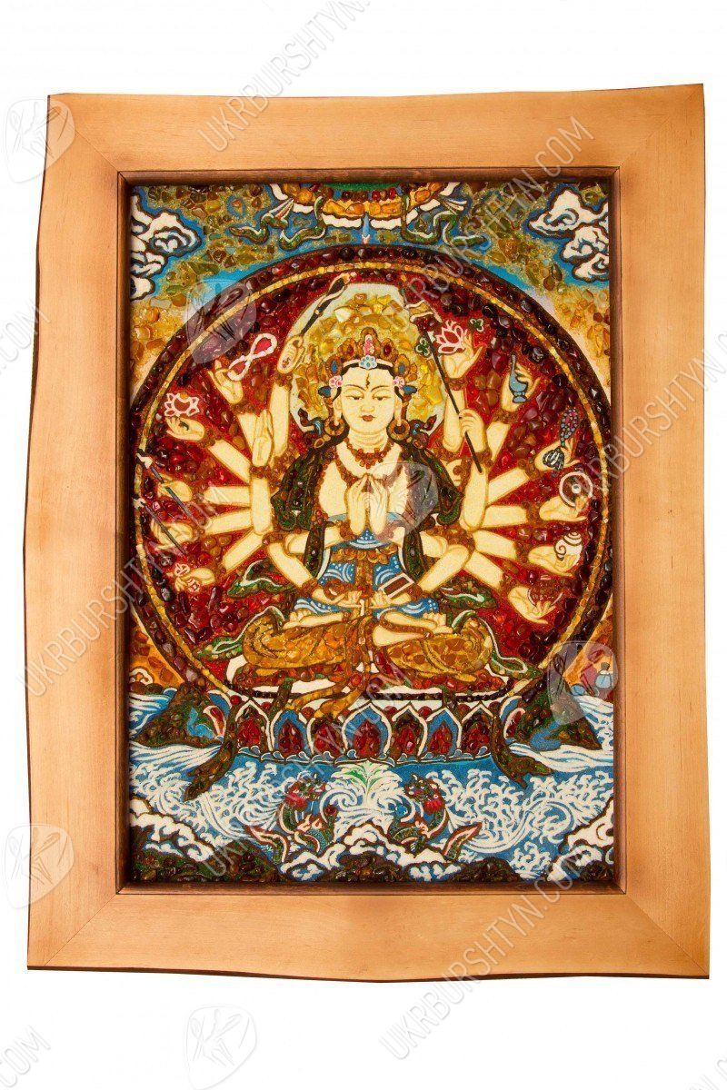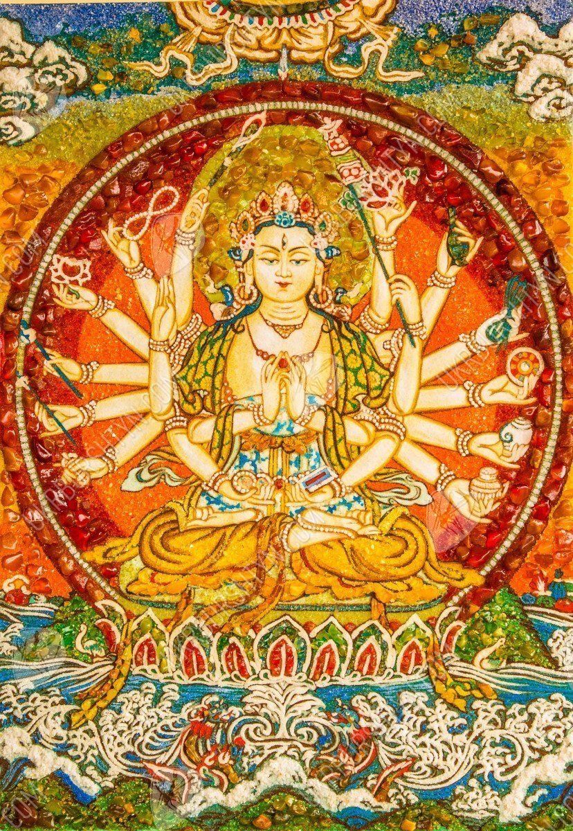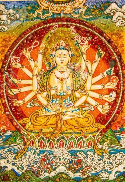 Перед нами Бодхисаттва, нарисованный по классическим традициям, многоруким божеством. Он олицетворяет заново родившегося человека, который прошел очень сложный и долгий путь познания. Он смог достичь понимания божества, приобрел то состояние духа, которое помогло ему так сильно изменить вид своего тела. Такое изменение и совершенствование позволили одновременно заниматься множеством разных дел.