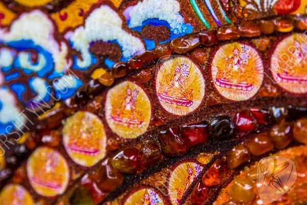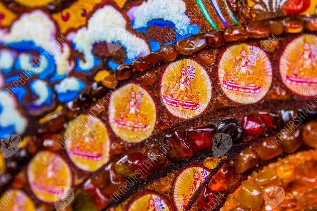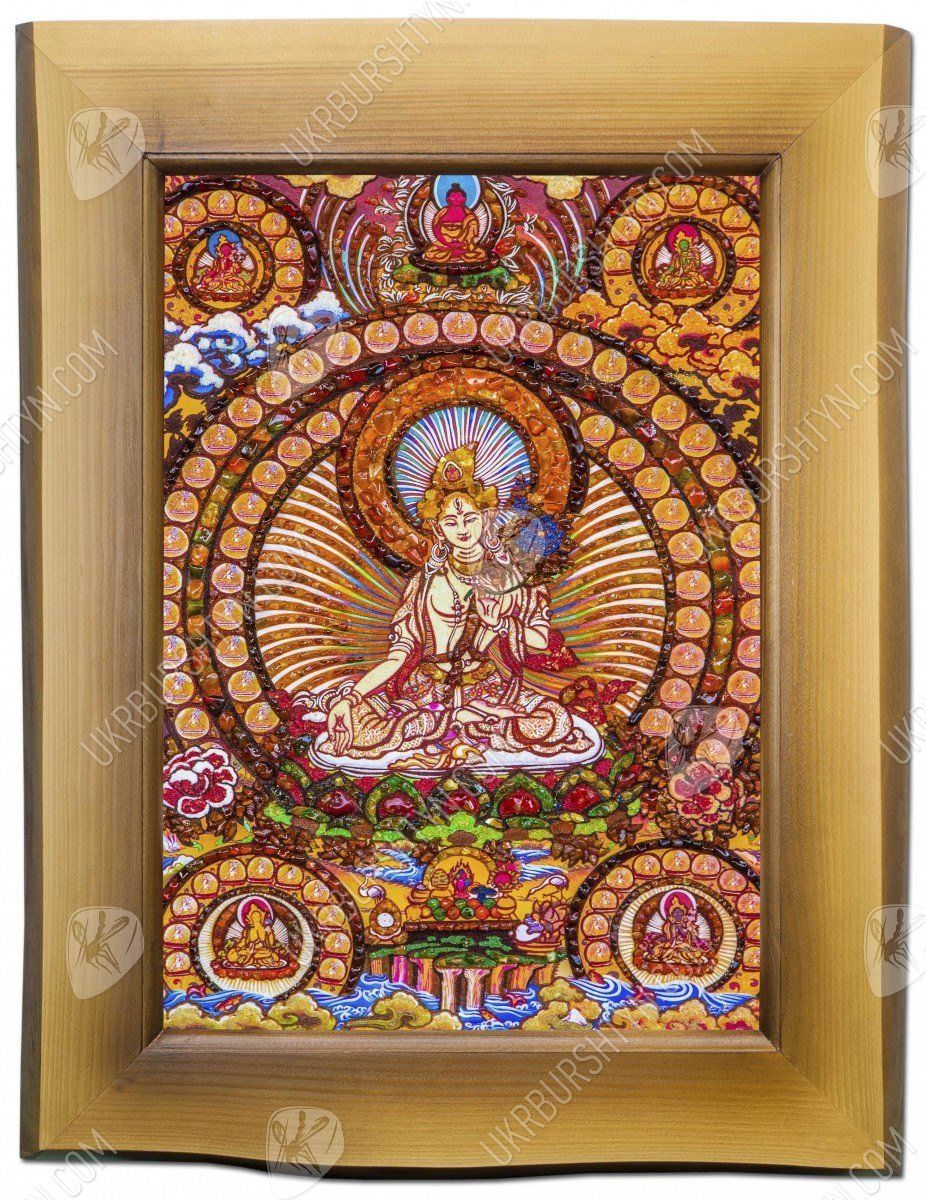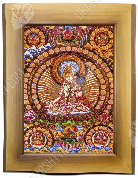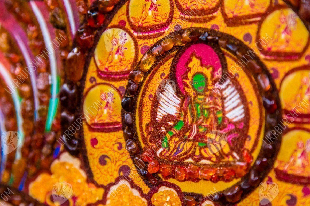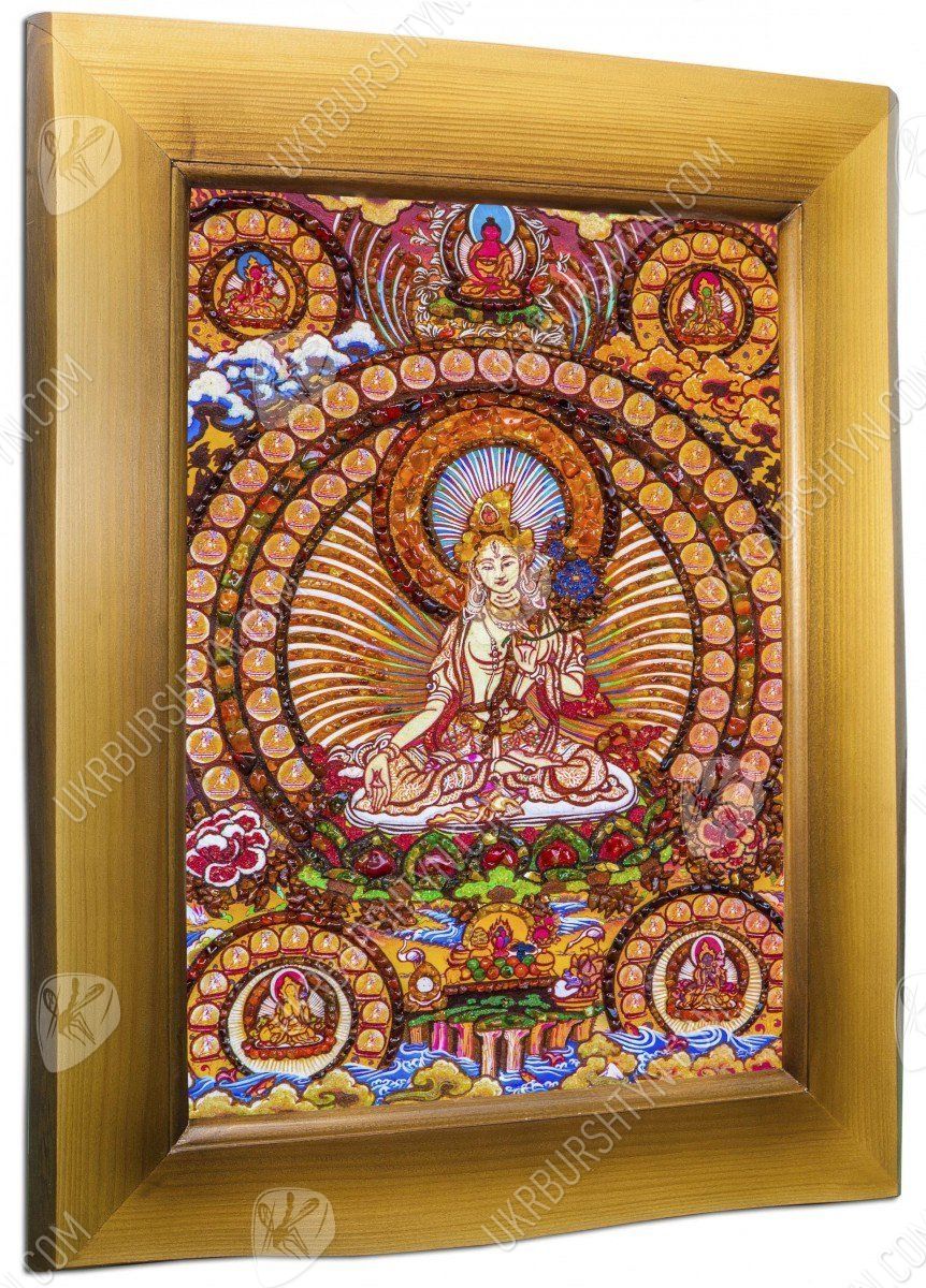 Это великолепное красочное панно, которое украшают янтарные камни редких размеров, отправляет нас во времена существования буддизма. «Просветленный», застыл на троне из лотоса, в позе медитации. Его рука касается земли, которая, дает ему истинное просветление. От Будды мы видим отходящее солнечное сияние, которое подчеркивают прозрачные янтаринки. За спиной «Просветленного, показано «Осьмеричное Колесо Закона», от которого исходит золотистое сияние. Вторым фоном на картине показан Будда в самых разных различных ипостасях. То его тело имеет золотистый оттенок, то оно совершенно зеленого цвета. Прямо перед Буддой поставлено блюдо из спелых фруктов.