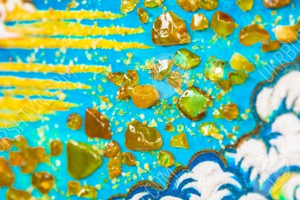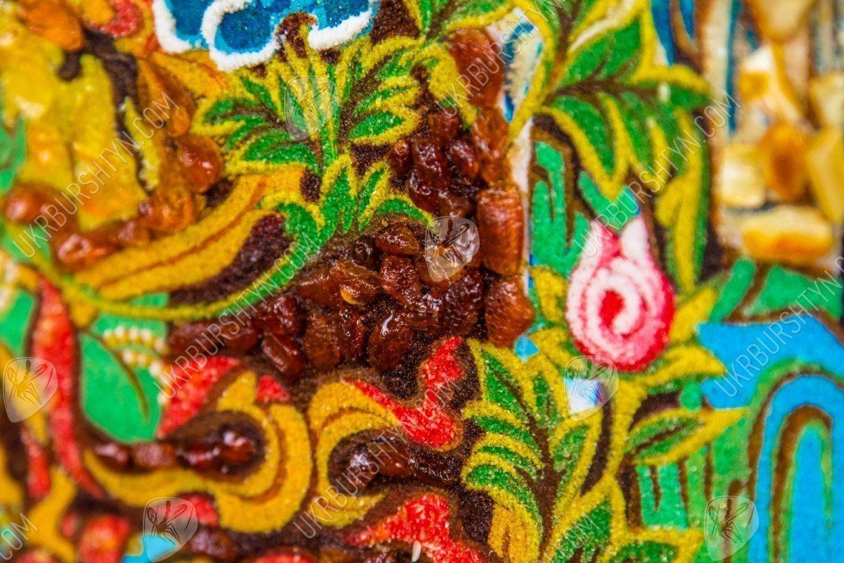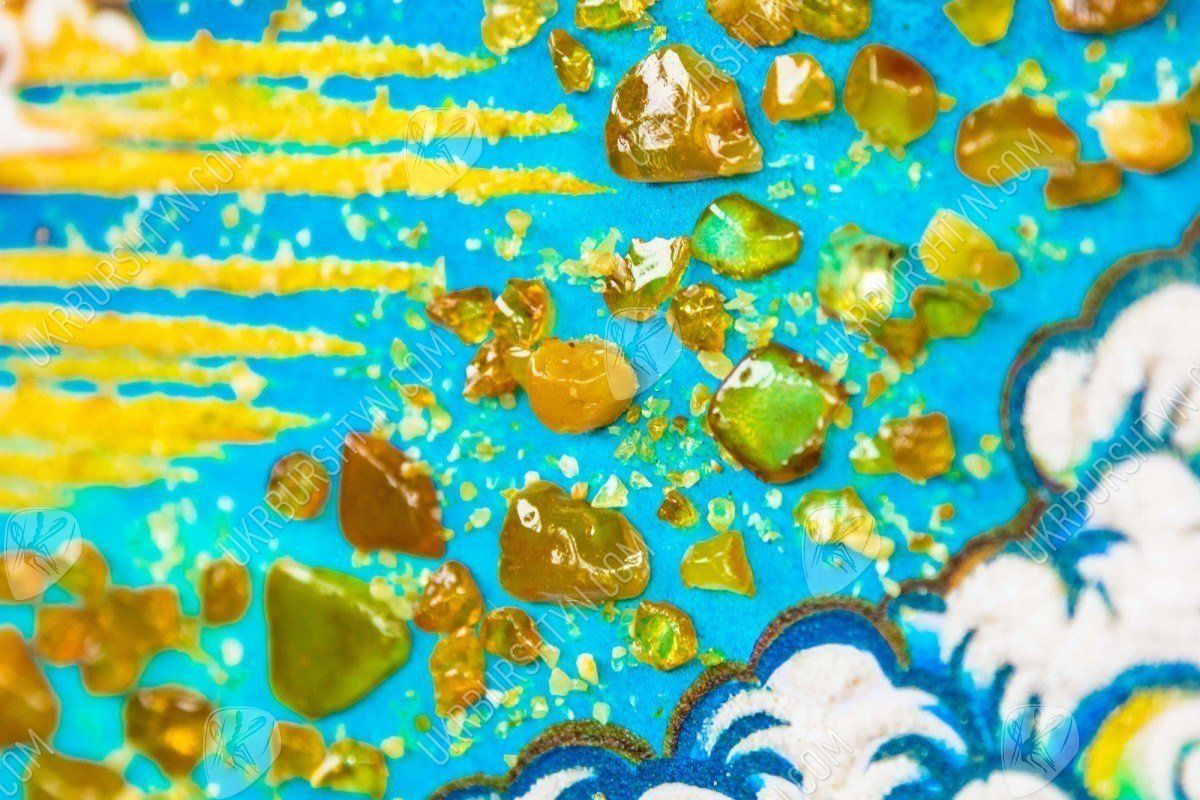 Красочно, очень ярко и оригинально. Чтобы описать это панно, нужны только позитивные и восхитительные слова. Сегодня самой актуальной и модной стала восточная тематика. Она используется в интерьере, чтобы привлечь богатство, сделать семью счастливой. Когда автор создавал это панно, он пользовался не только яркими красками. Главной деталью этой картины стал янтарь - солнечный и волшебный камень. Какие только названия ему не давали. В древние времена он использовался лекарями для излечения самых разных заболеваний.
