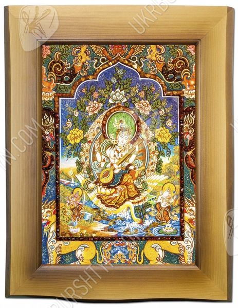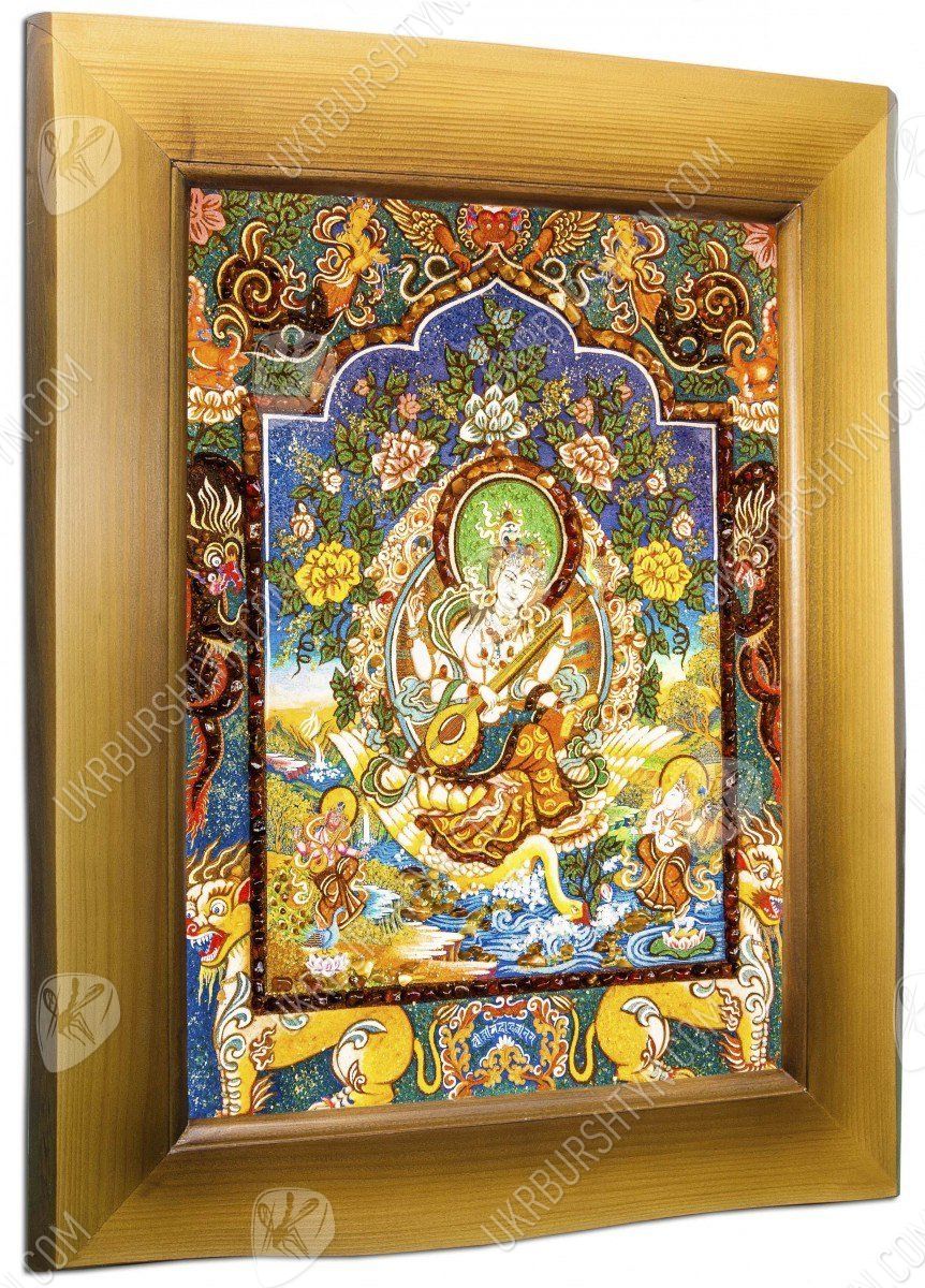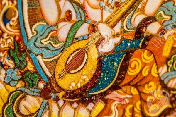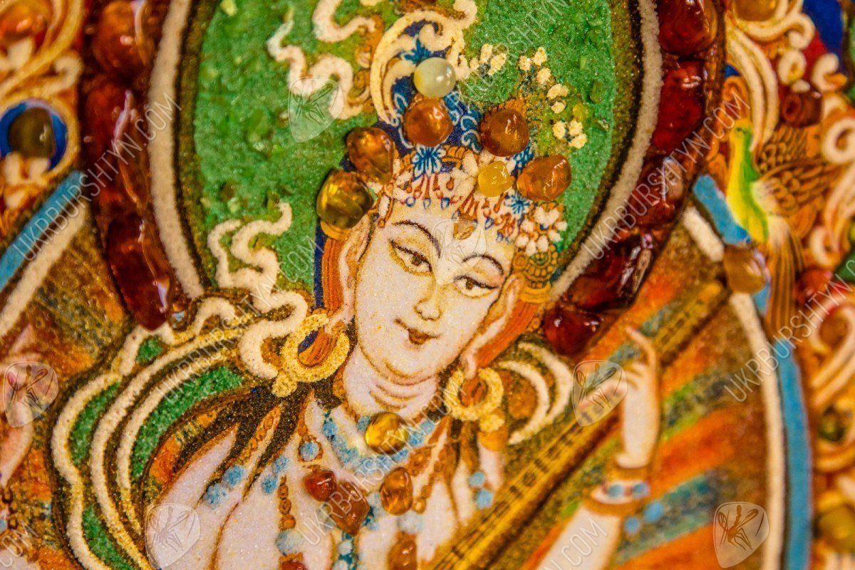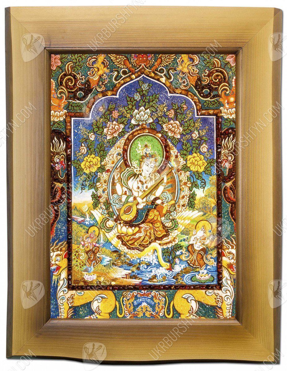 Ваша работа связана с творчеством, наукой, выступлениями на публике? Тогда это панно из янтаря, которое презентует наш интернет магазин подарков, точно создано специально для Вас! На нём изображена Сарасвати – покровительница мастерства, знаний, мудрости, красноречия и красоты. Автор тщательно высыпал из каменной крошки атрибуты богини – музыкальный инструмент-вину, олицетворяющий искусство, свиток – символ науки, чётки – прообраз духовности. А крупные самоцветы, переливающиеся золотыми, оранжевыми, терракотовыми искрами, помогли выделить важные детали и сделать изображение объёмнее. Подобные готовые картины – небанальный сюрприз и замечательное дополнение к интерьеру!