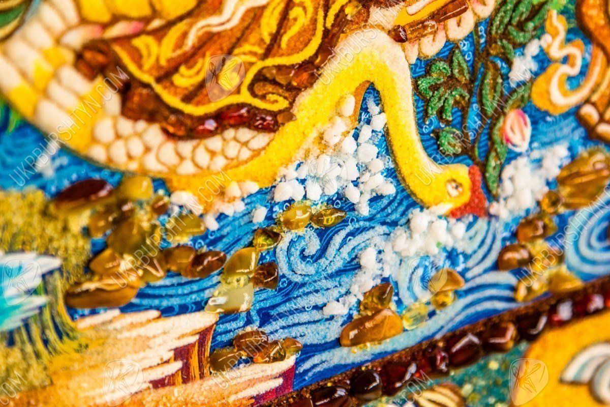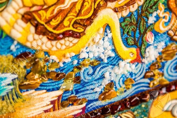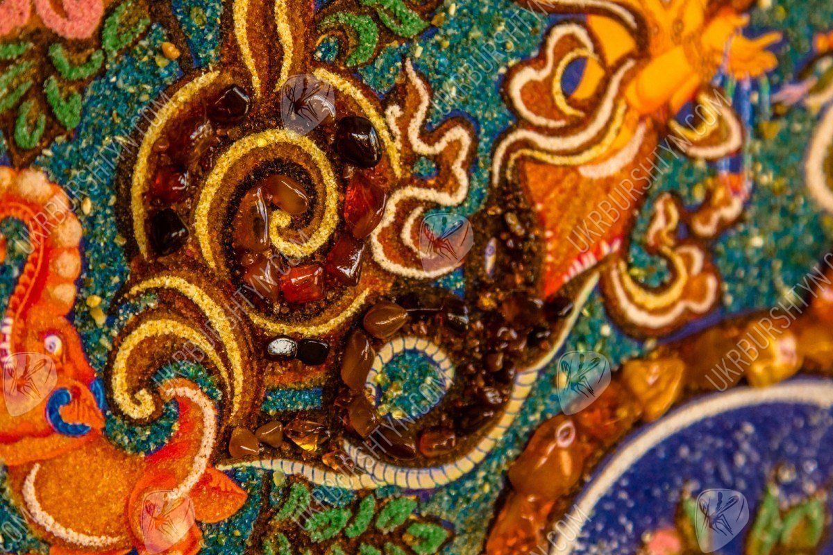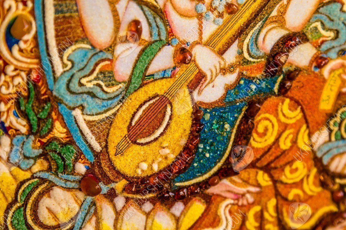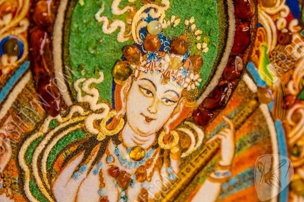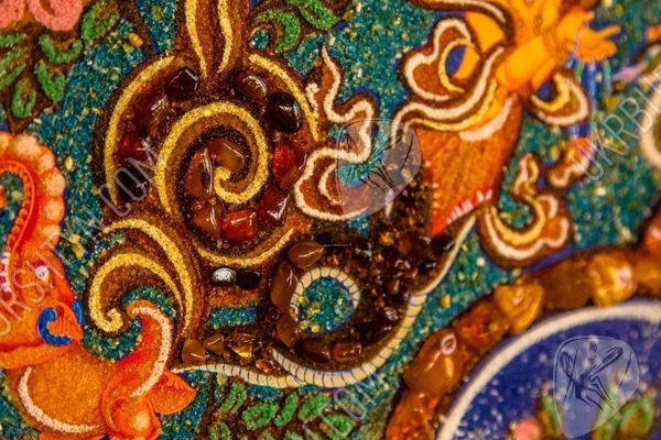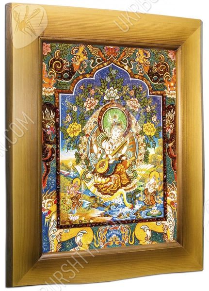 Ваша работа связана с творчеством, наукой, выступлениями на публике? Тогда это панно из янтаря, которое презентует наш интернет магазин подарков, точно создано специально для Вас! На нём изображена Сарасвати – покровительница мастерства, знаний, мудрости, красноречия и красоты. Автор тщательно высыпал из каменной крошки атрибуты богини – музыкальный инструмент-вину, олицетворяющий искусство, свиток – символ науки, чётки – прообраз духовности. А крупные самоцветы, переливающиеся золотыми, оранжевыми, терракотовыми искрами, помогли выделить важные детали и сделать изображение объёмнее. Подобные готовые картины – небанальный сюрприз и замечательное дополнение к интерьеру!