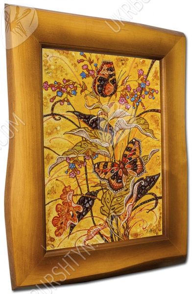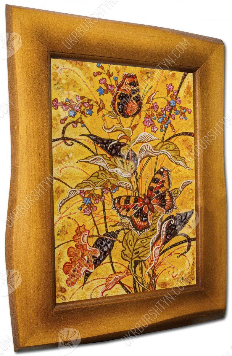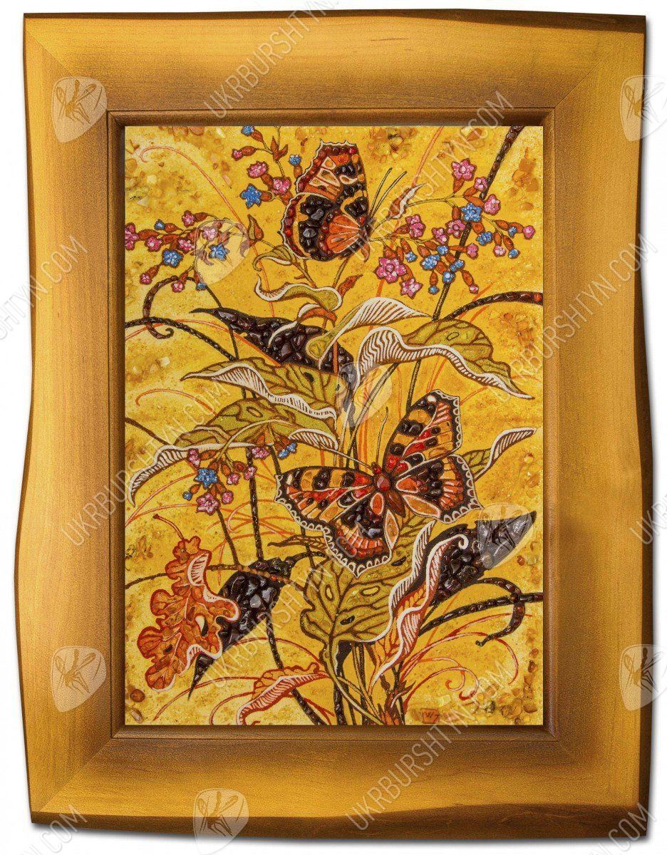 В последние годы стал весьма актуальным символ бабочки. Это связано с фэн-шуй, наукой, диктующей грамотную расстановку вещей, которая стала очень популярной. Это учение гласит, что бабочка это мощный талисман, способный притягивать настоящую любовь и дарить радость. Бабочки нарисованные на картине, украшенной янтарем, принесут в дом атмосферу спокойствия. Целительные свойства солнечного камня подарят хозяевам отличное здоровье.