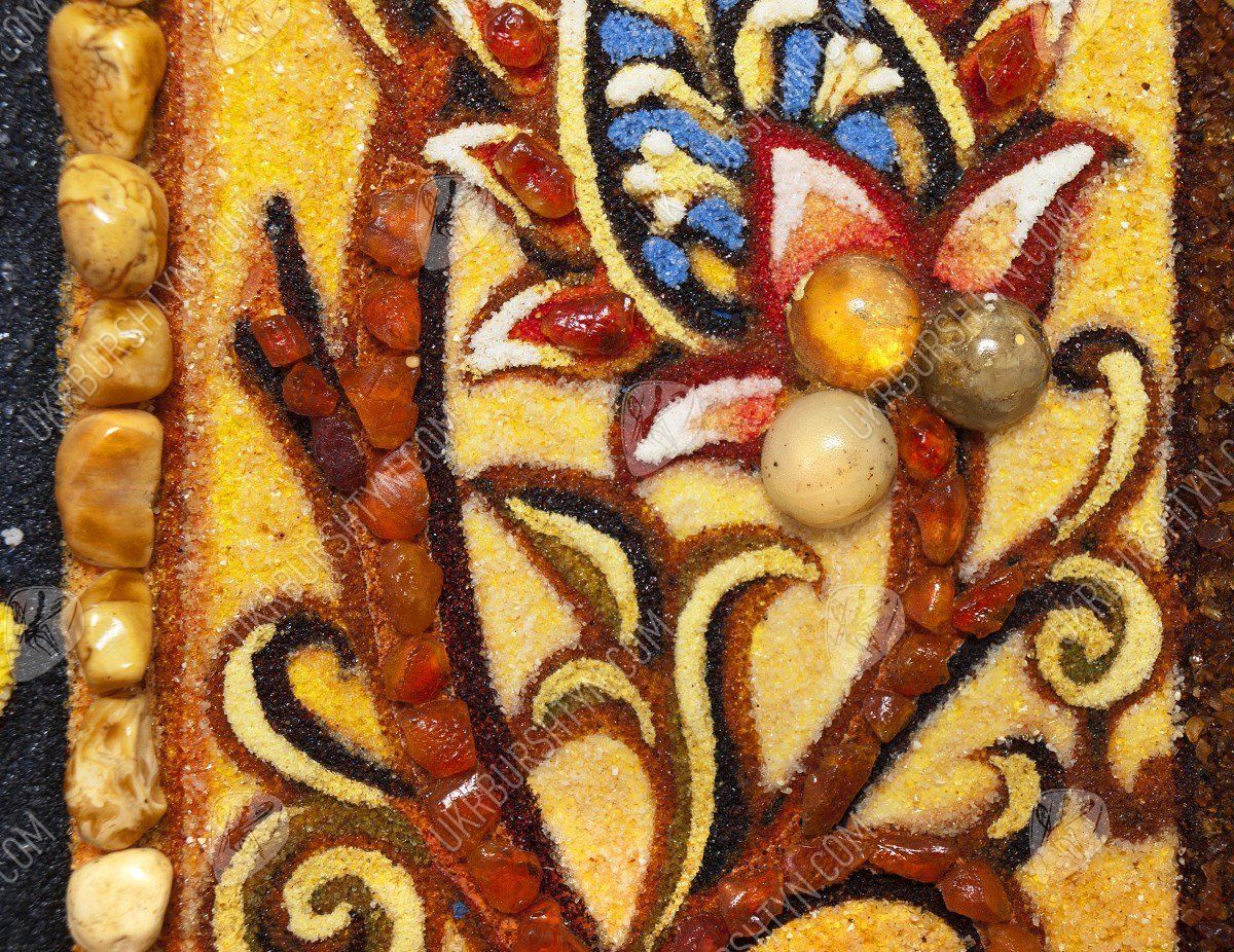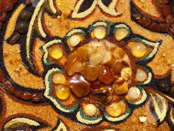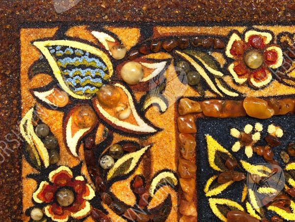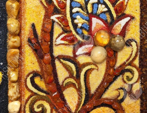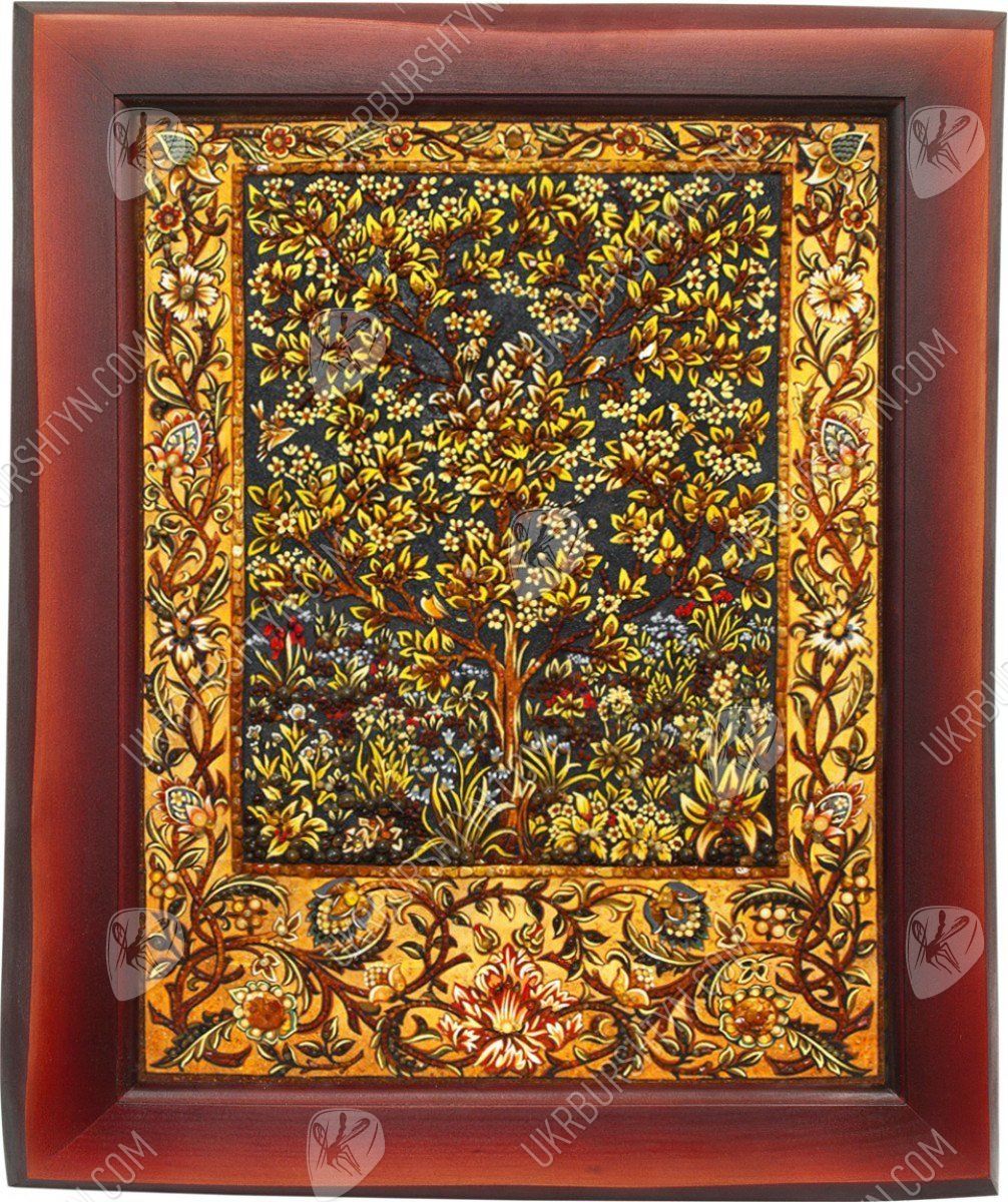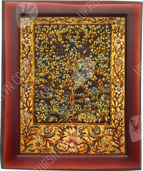 Современная китайская живопись порой наследует и переосмысливает европейские традиции, создавая уникальные произведения. И это янтарное панно, на котором запечатлено мифологическое древо жизни – отличный пример таких работ. Кажется, что Вы смотрите на страницу из древнего манускрипта – настолько замысловаты переплетения стилизованных ветвей. На выложенных из цельных самоцветов побегах и ростках распускаются фантастические цветы – они сияют и переливаются всеми оттенками золотого, жёлтого, оранжевого тонов. Изображение обрамляет растительный орнамент, высыпанный из каменной крошки. Подобные китайские картины – аксессуар для людей с тонким вкусом и развитым эстетическим чутьём.