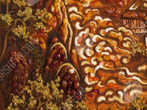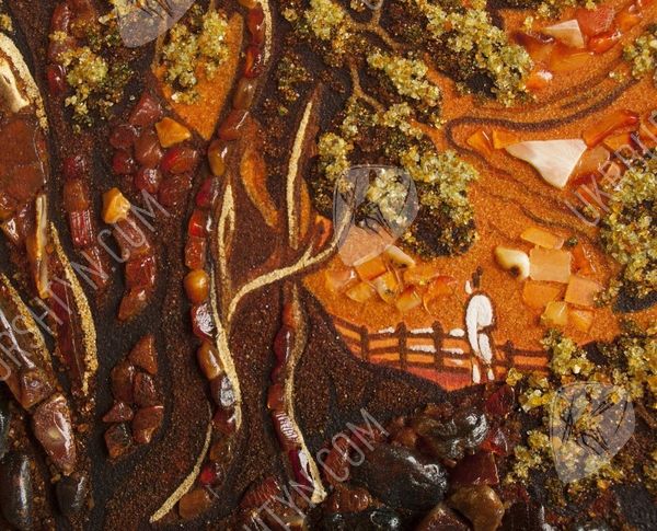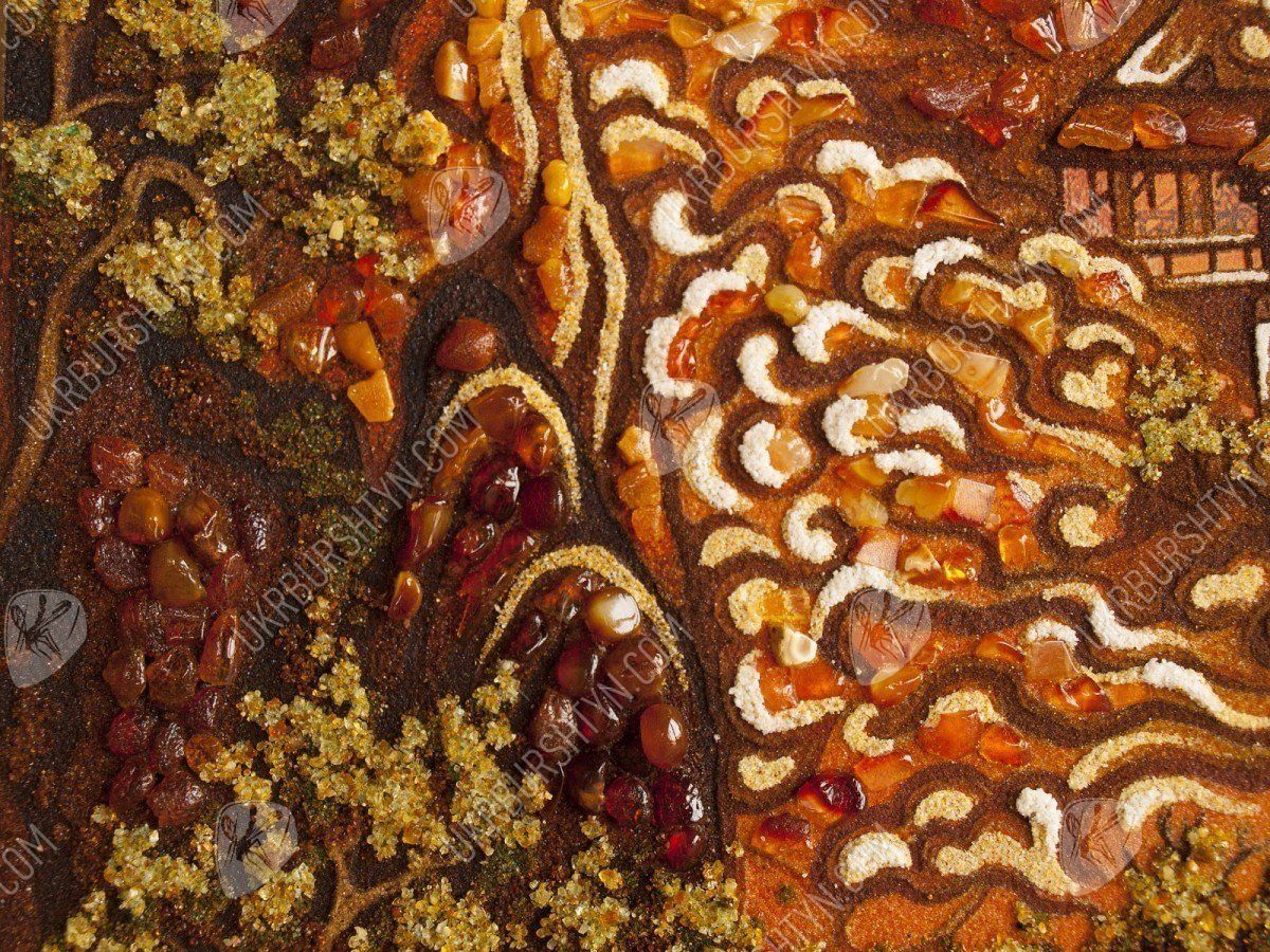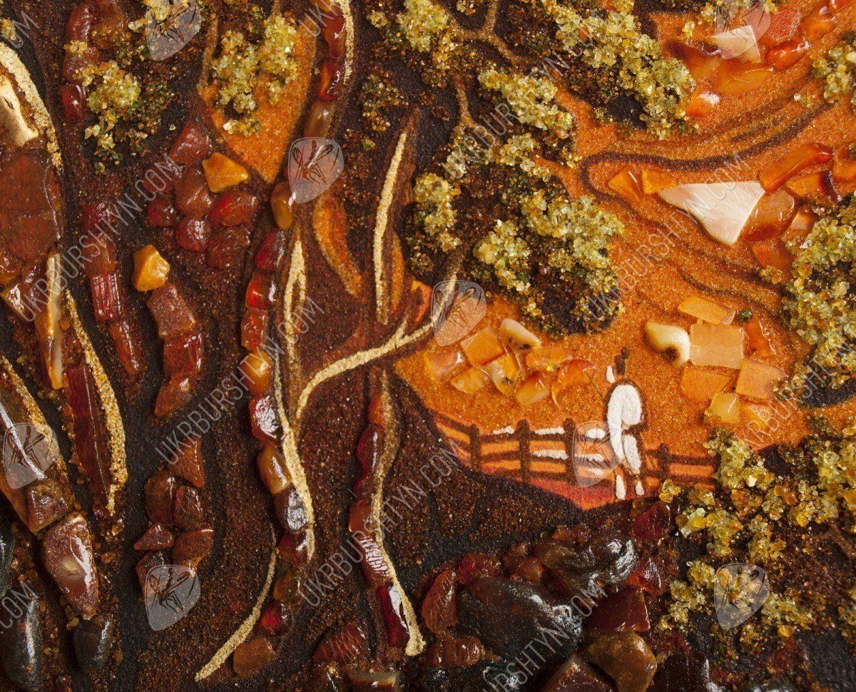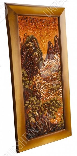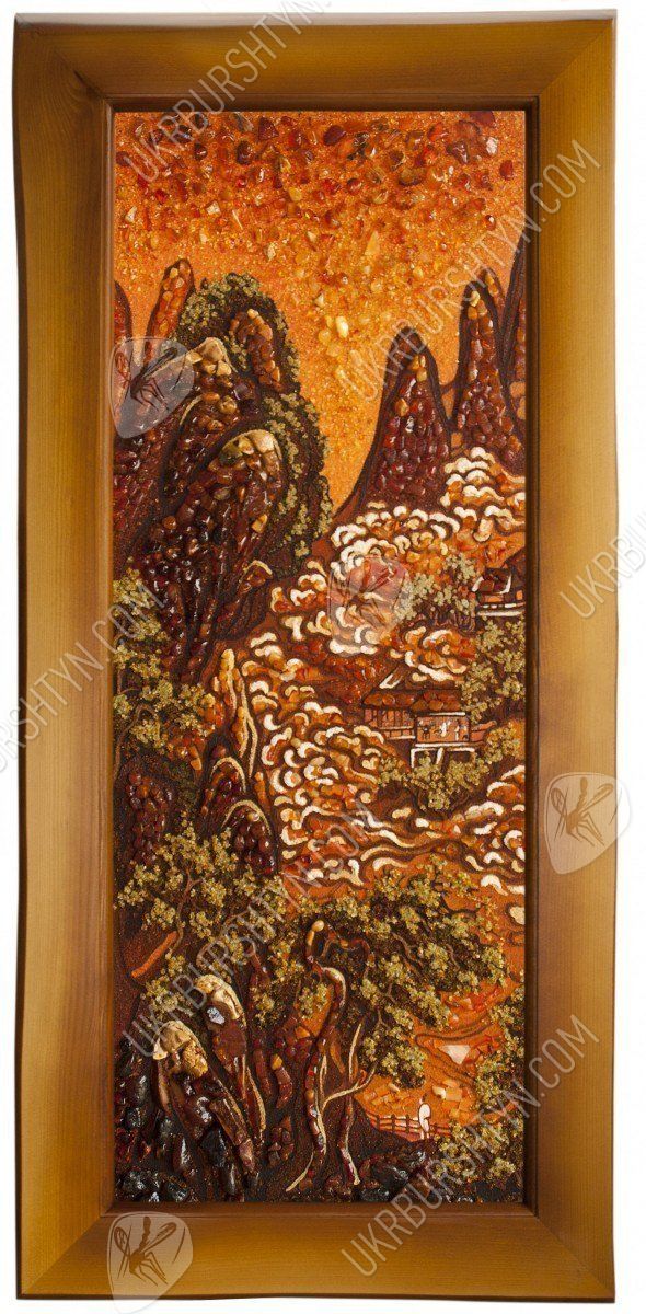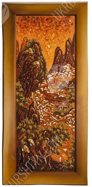 В Китае считается, что внутри каждой горы существует божество, от которого зависят жизни людей, живущих поблизости. Именно поэтому одним из мотивов их живописи стали горы, ведь изобразить обиталище духа – значит задобрить его. Но эта работа, которую представляет наш каталог картин из янтаря, может похвастаться не только интересной легендой, но и потрясающим мастерством исполнения. Традиционную китайскую манеру живописи дополняет инкрустация янтарными пластинами и крошкой, придающая рисунку удивительную живость, объёмность и выразительность. Этот прекрасный горный пейзаж будет хорошо смотреться на стене гостиной либо столовой, оживляя помещение и придавая ему неуловимый восточный колорит.