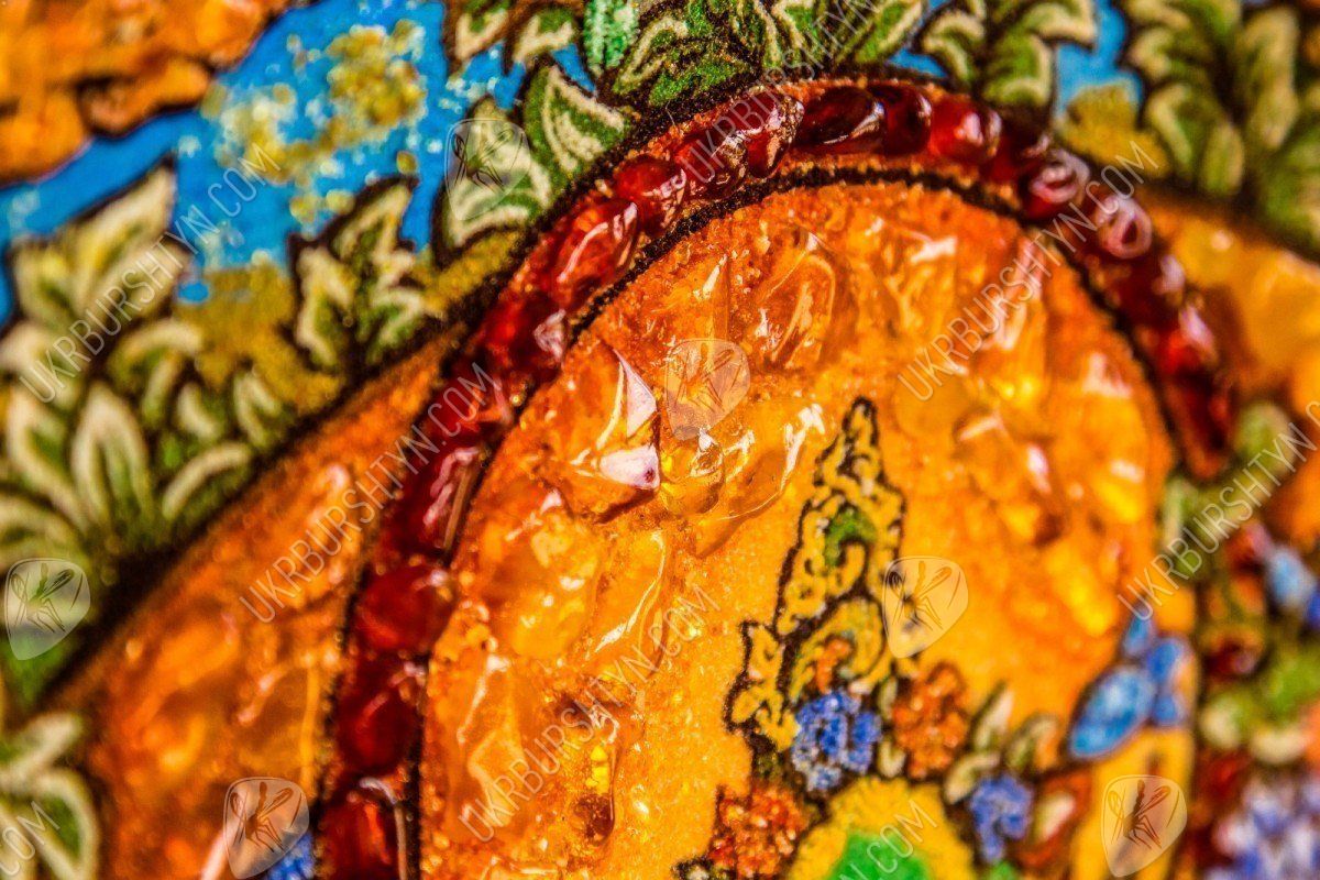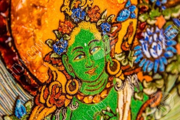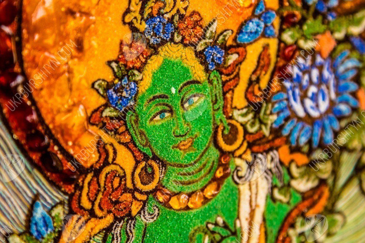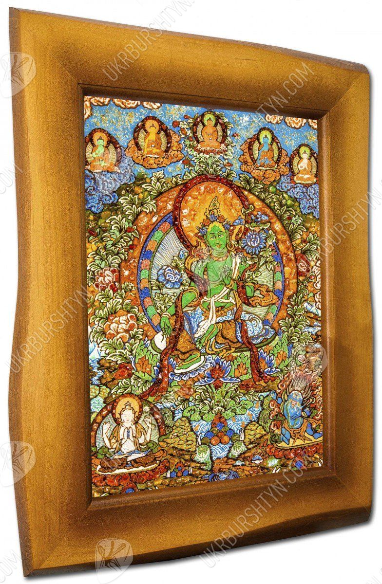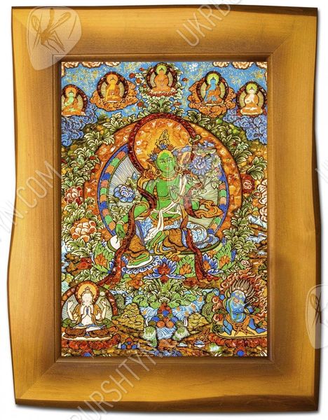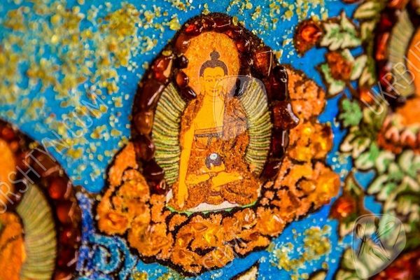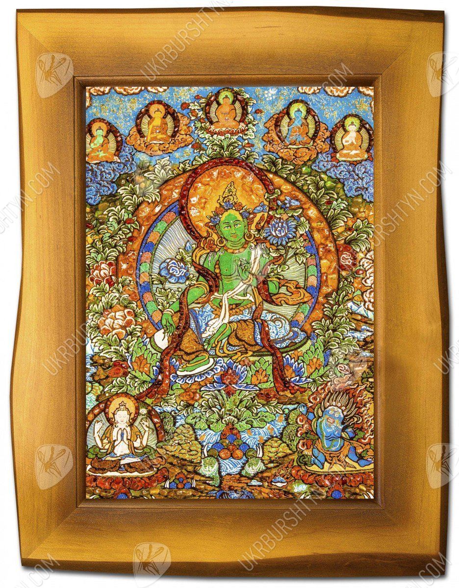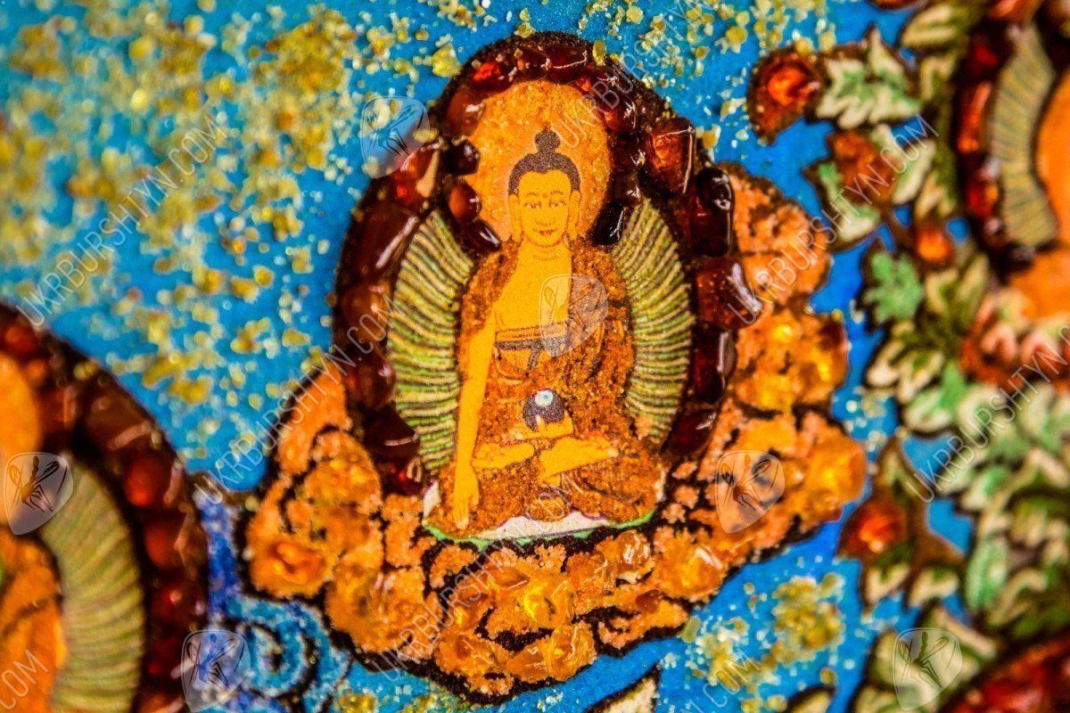Перед нами янтарное панно, где изображен Будда - блаженный Амогхасиддхи, который появился из холодного северного воздуха. Все его тело окрашено зеленым цветом, он показан в сопровождении шести таких же Будд. Просветленный сидит на троне, застыв в одной из поз медитации - лотоса. Это яркое и красочное панно, сделанное талантливым художником, поможет забыть все насущные проблемы, оно принесет в дом благополучие и уют. Картина инкрустирована янтарными камнями, которые переливаются тысячами искорок в лучах солнца.