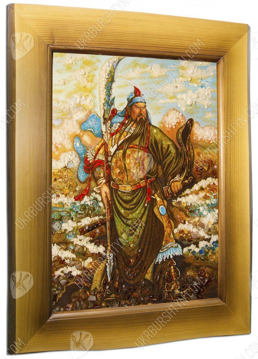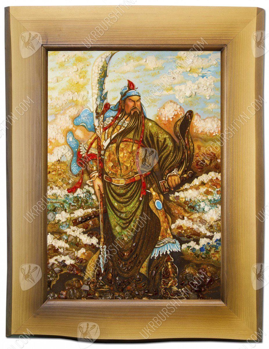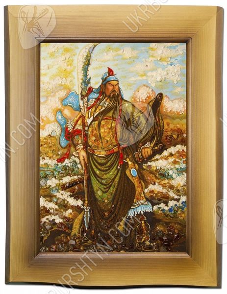 Вам нравятся китайские картины, на которых запечатлены сказочные герои, действовавшие в мифах и легендах этой древней страны? Тогда и это авторское панно, демонстрирующее справедливого и умного воина Гуань Юя, наверняка придётся Вам по вкусу. Изображение выдержано в традиционной восточной манере, вот только вместо красок и шёлка использована самоцветная крошка и кусочки алого, золотого и коричневого натурального янтаря – ими украшены одежды и оружие полководца, а также окружающий пейзаж. Но это ничуть не портит произведение – наоборот, делает его ярче, насыщеннее и колоритнее. А освещённые солнцем, драгоценные камни начинают переливаться и сверкать, преображая и оживляя всю сценку!