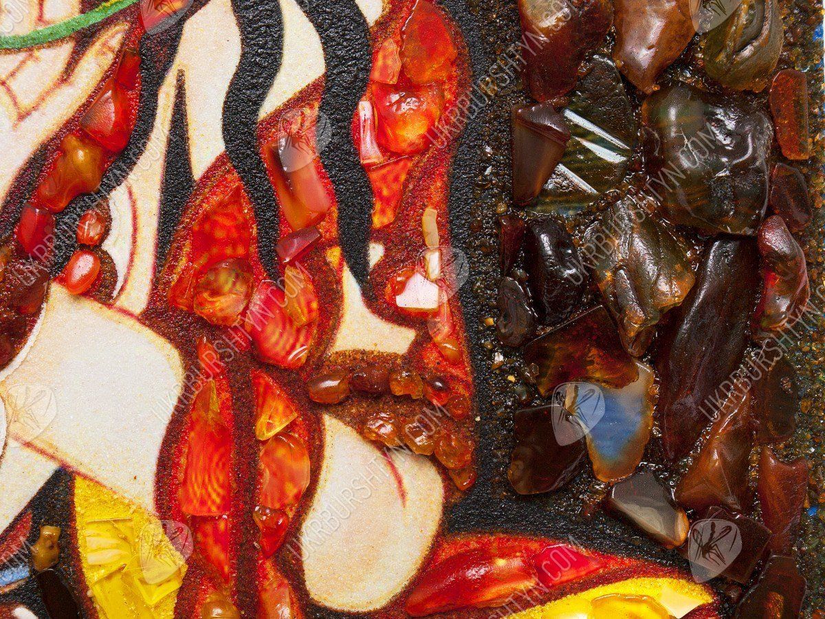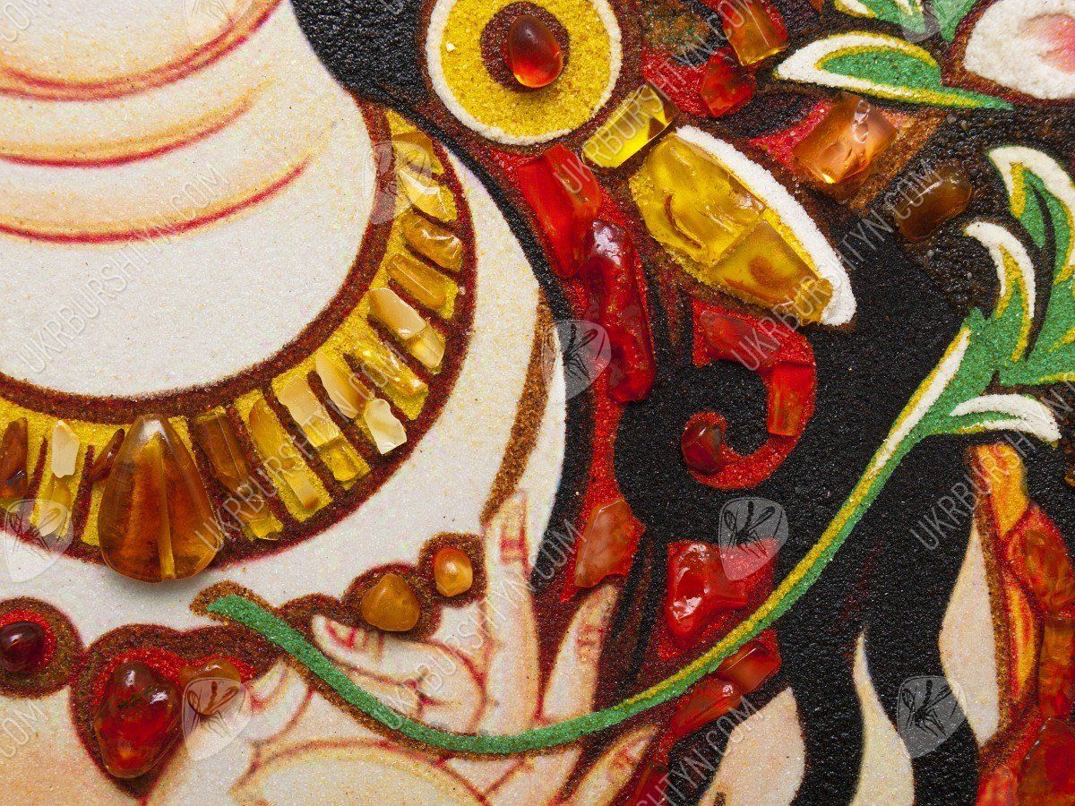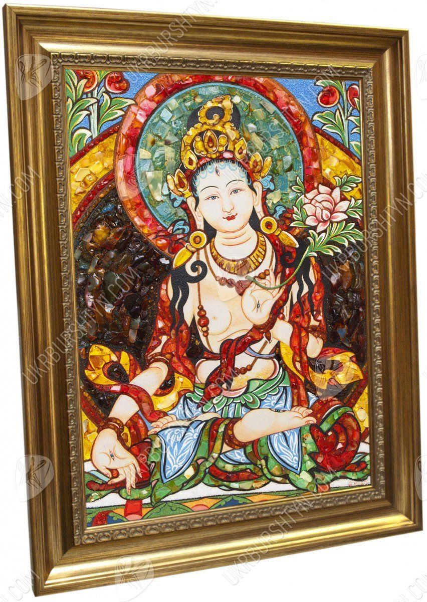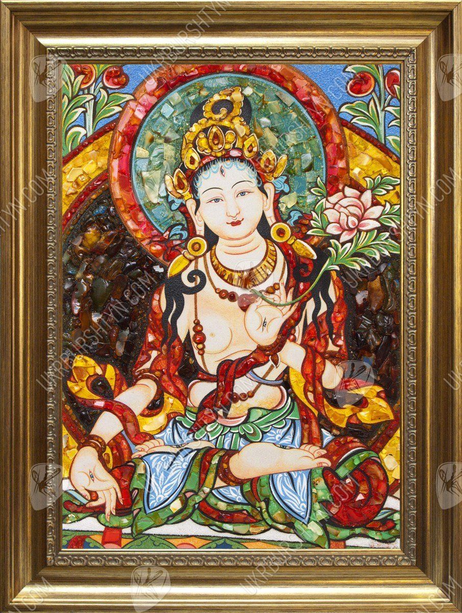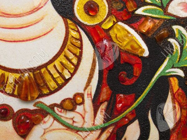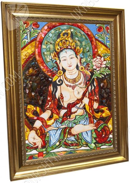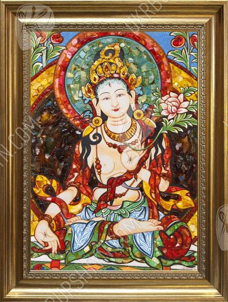 В индуизме и буддизме женские божества – важная часть пантеона. Некоторые из них воинственны и храбры, защищая человека от демонов и соблазнов, а другие, наоборот, дарят людям мир, любовь и радость. И изображенная на этой работе Белая Тара явно относится к последним! Её ласковая улыбка дарит надежду на лучшее, а пальцы на руках сложены в жестах успокоения и гармонии, которыми она наделяет того, кто пожелает купить панно из янтаря. Одежды богини инкрустированы пластинами, изготовленными из редкого зелёного самоцвета – на Востоке ему приписывают магические и целебные свойства, как и ореол за её спиной. А другие камешки создают тёмный фон, на котором центральное изображение становится ещё ярче и насыщеннее.