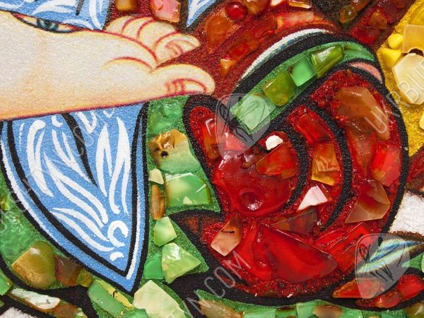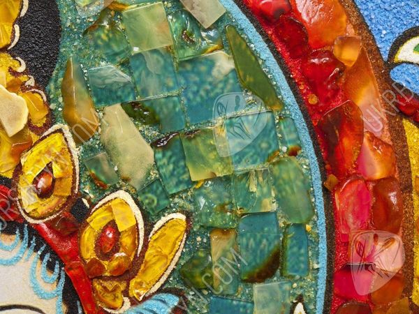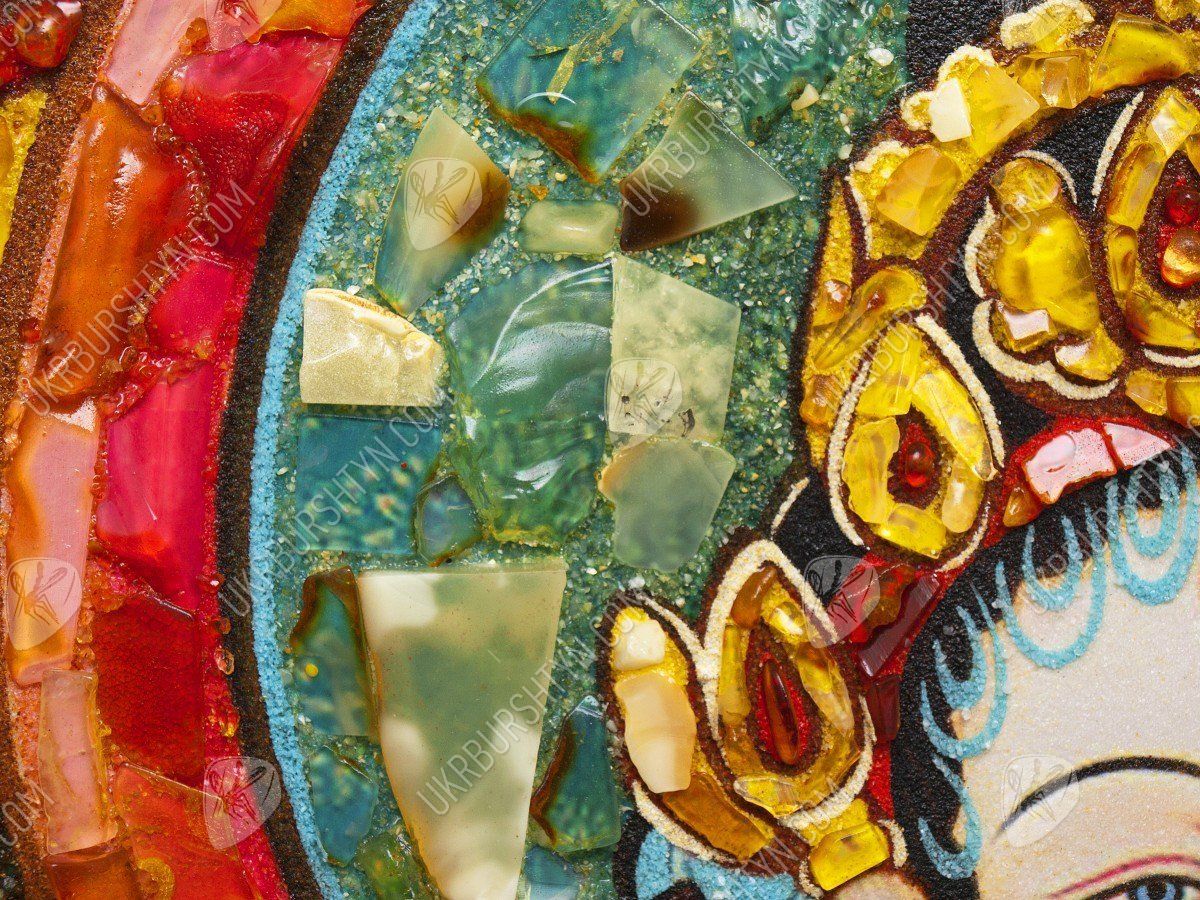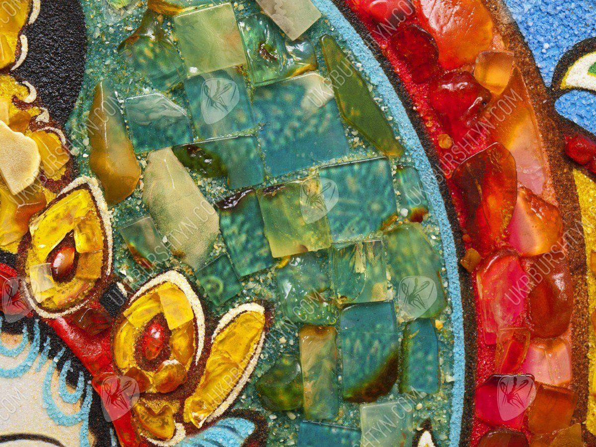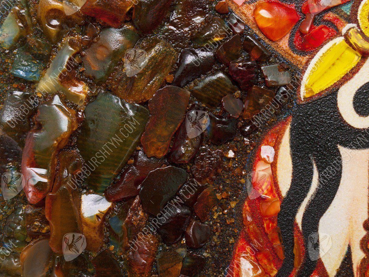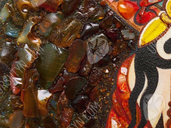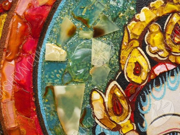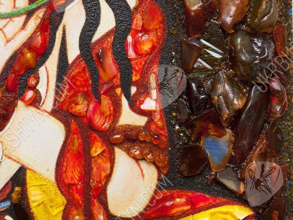 В индуизме и буддизме женские божества – важная часть пантеона. Некоторые из них воинственны и храбры, защищая человека от демонов и соблазнов, а другие, наоборот, дарят людям мир, любовь и радость. И изображенная на этой работе Белая Тара явно относится к последним! Её ласковая улыбка дарит надежду на лучшее, а пальцы на руках сложены в жестах успокоения и гармонии, которыми она наделяет того, кто пожелает купить панно из янтаря. Одежды богини инкрустированы пластинами, изготовленными из редкого зелёного самоцвета – на Востоке ему приписывают магические и целебные свойства, как и ореол за её спиной. А другие камешки создают тёмный фон, на котором центральное изображение становится ещё ярче и насыщеннее.