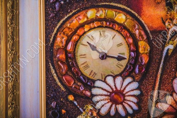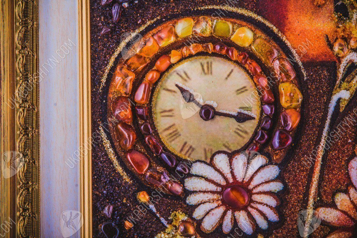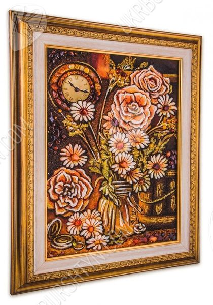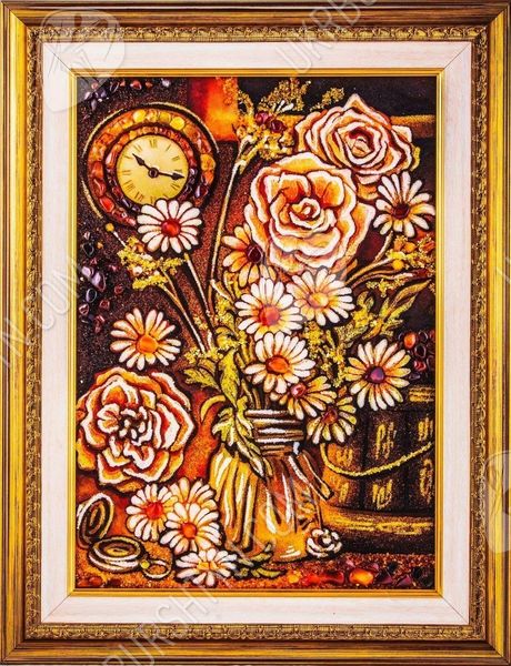 Тысячи лет потребовалось для того, чтобы застывшая хвойная смола доставила человеку радостные мгновения и принесла большую удачу. Часы говорят нам, что время течет очень быстро, и совсем неважно, кто занимается его отсчетом, большие напольные, или маленькие миниатюрные часики. Лишь цветы, изображенные на картине остаются, не подвластны времени.