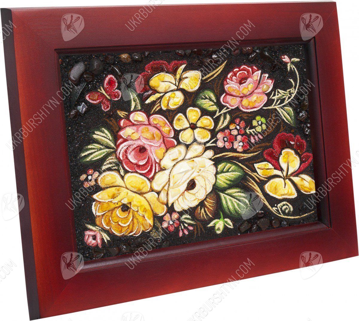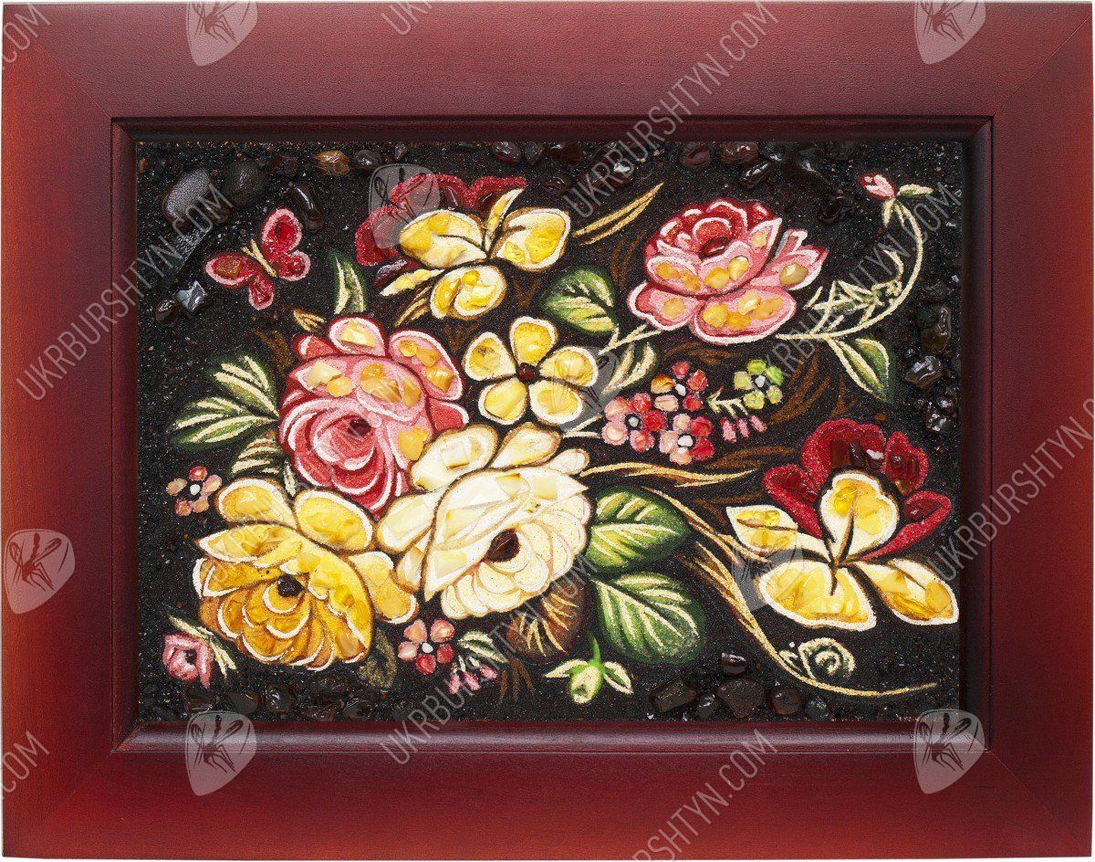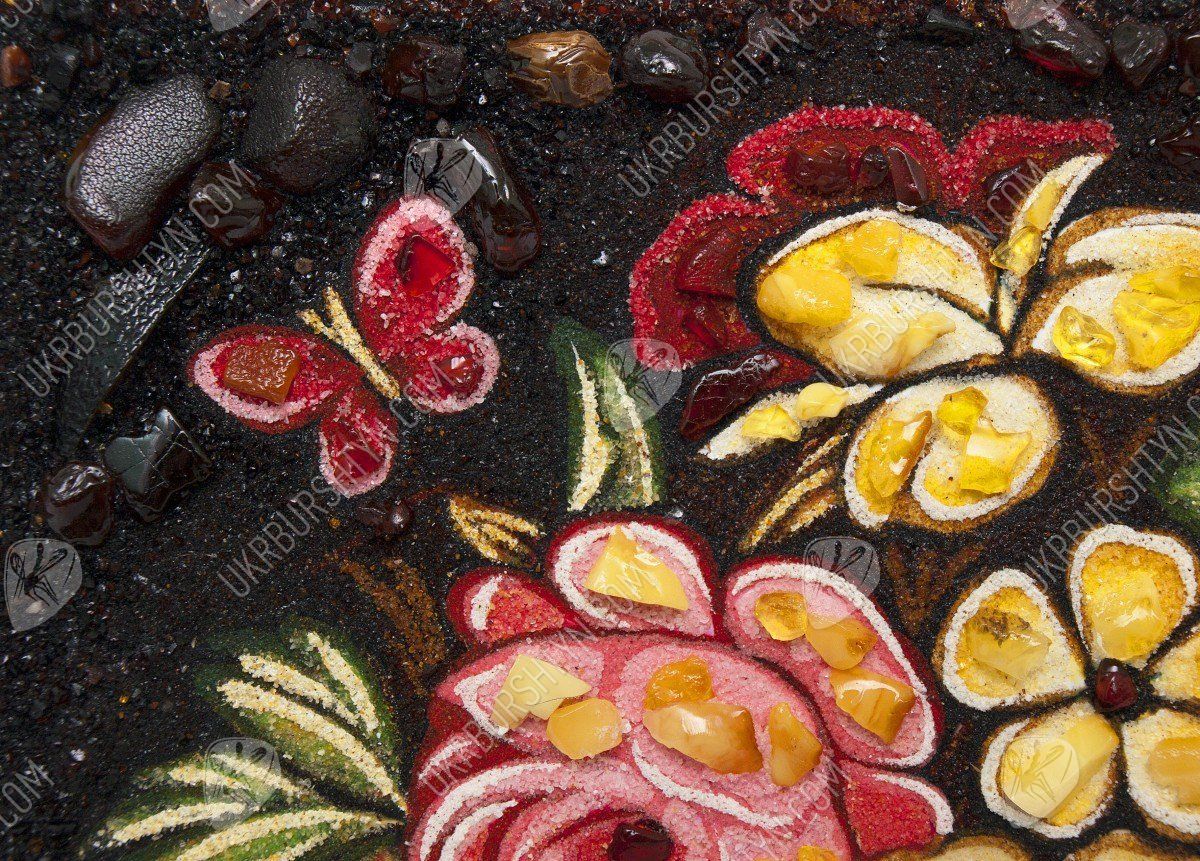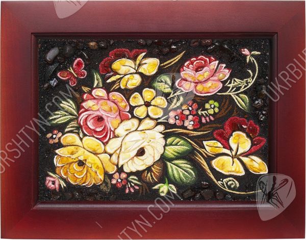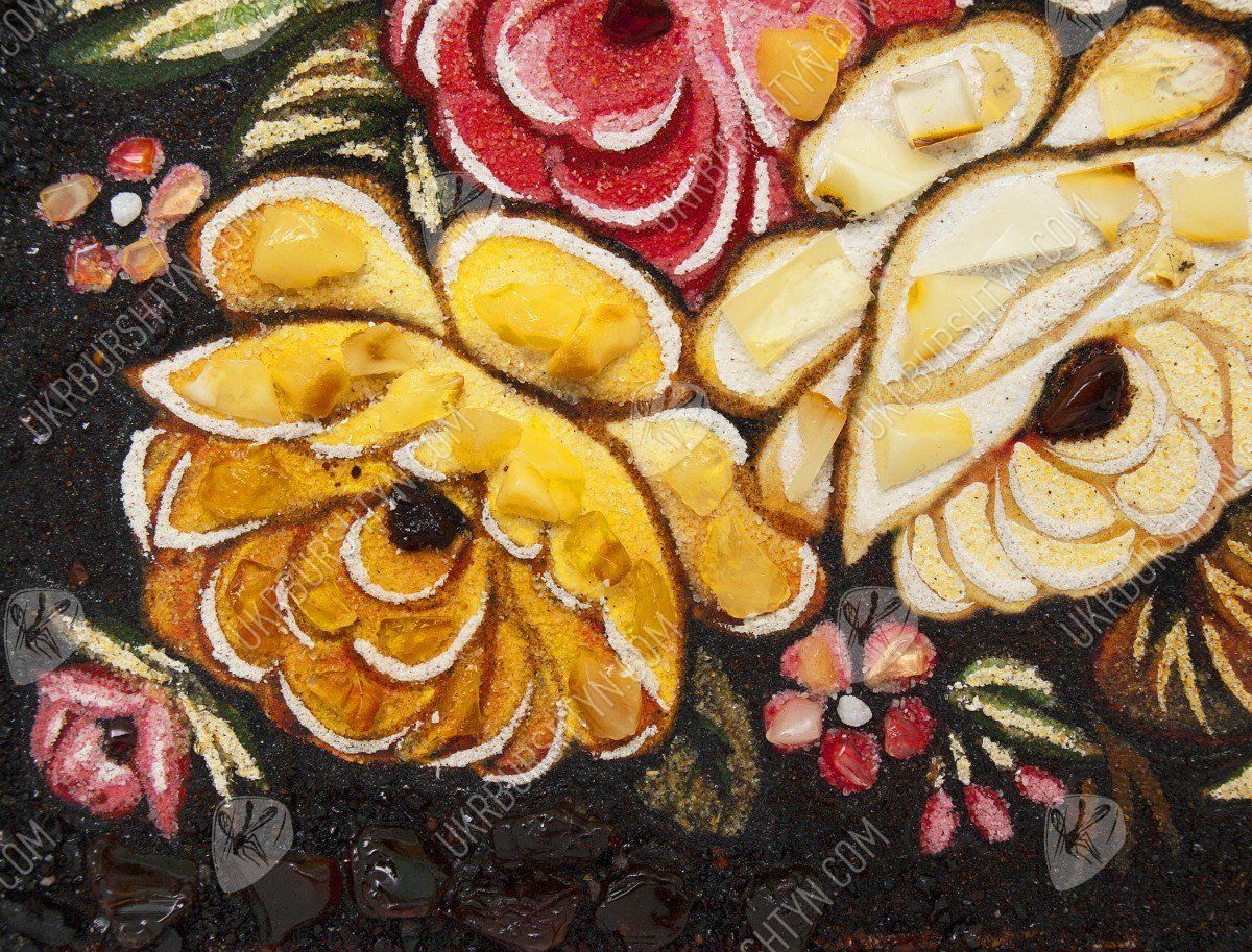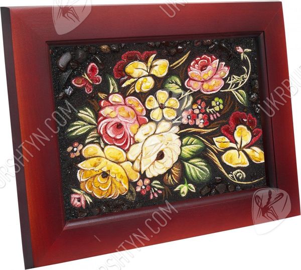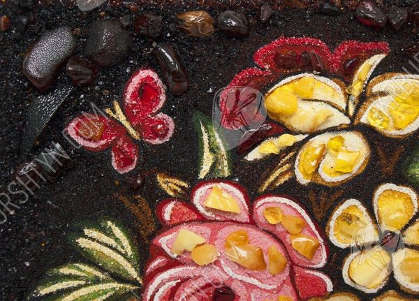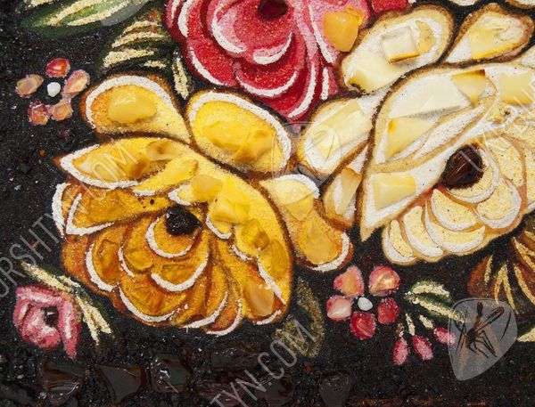 Подыскиваете необычные и привлекательные картины для спальни? Не упустите возможность заказать картину из янтаря, представленную на этой странице. С помощью мелкой каменной крошки мастер воспроизвёл великолепную и самобытную роспись, стилизованную под народные орнаменты. Царственные розы переливаются всеми оттенками алого, багряного, золотого, жёлтого, лимонного и кремового тонов. Их красоту подчёркивают другие цветы, нежно-оливковые листья, а также тёмно-коричневый фон – на нём все краски смотрятся ещё ярче! Инкрустация из цельных полесских самоцветов делает произведение рельефным и эффектным – так и хочется провести пальцами по гладким, тёплым кусочкам окаменевшей смолы.