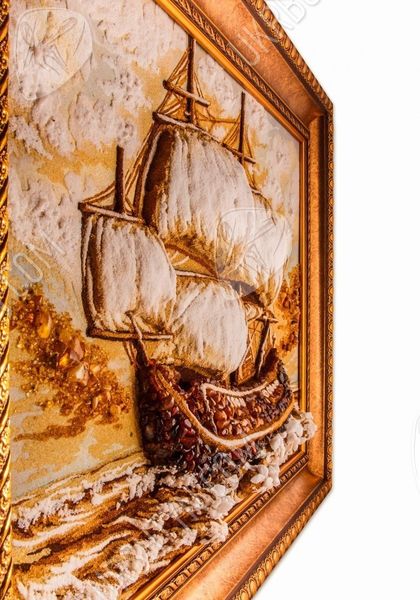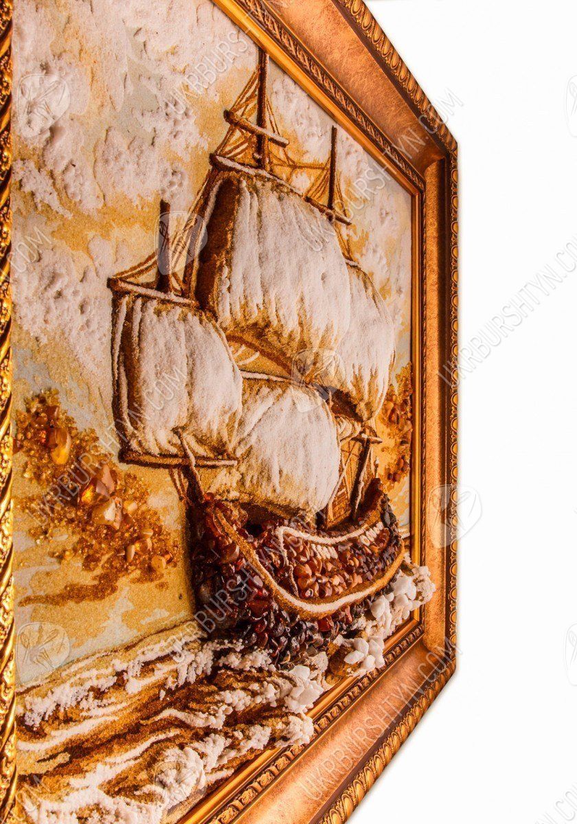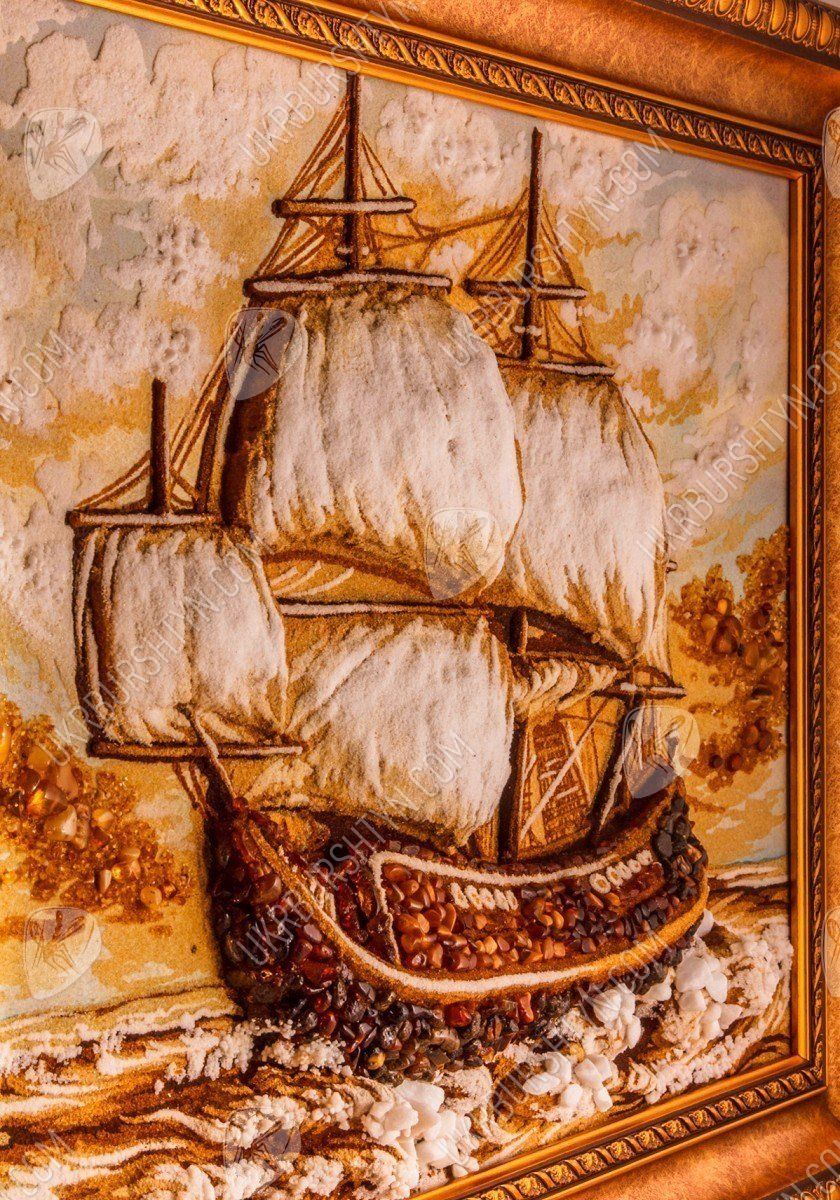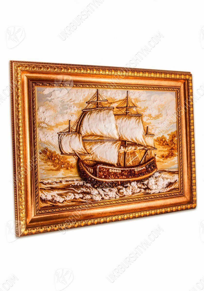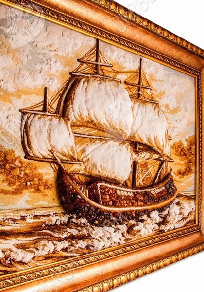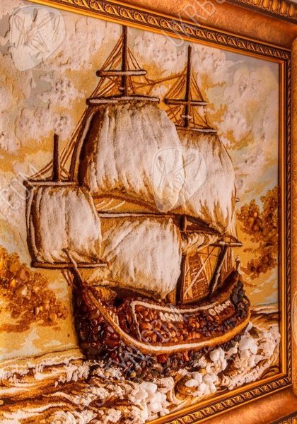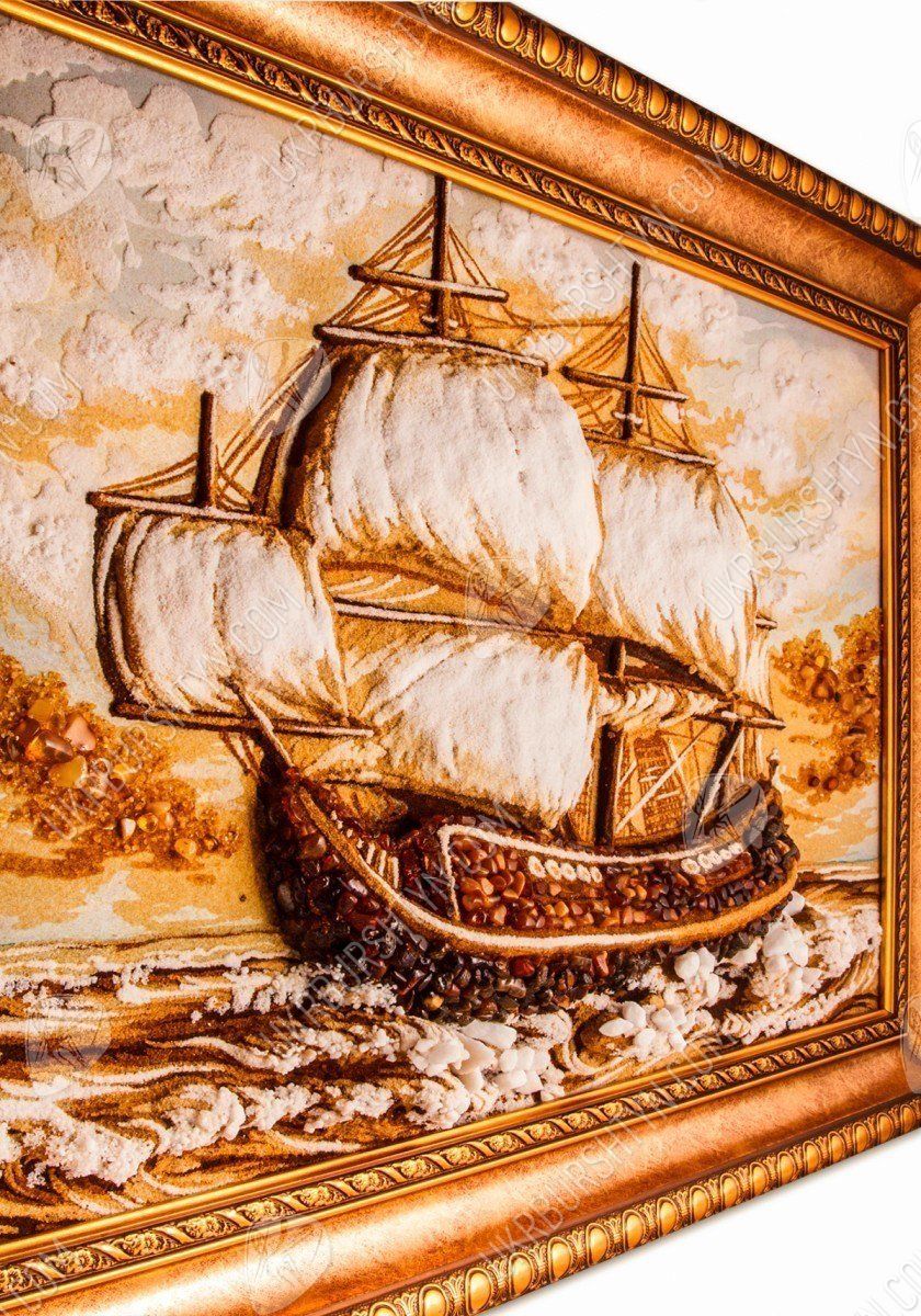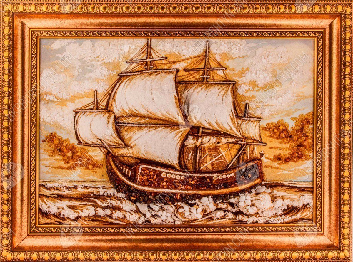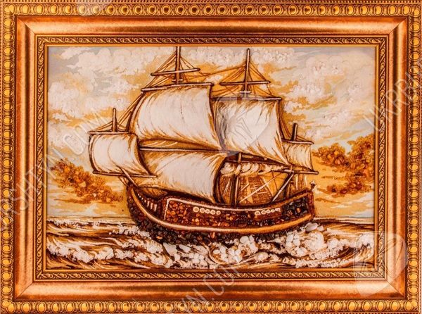 Янтарная картина, на которой нарисован корабль, идущий на всех парусах, всегда будет украшением любой коллекции мореплавателя. Она может стать великолепным подарком любому, кого волнует морская тематика.