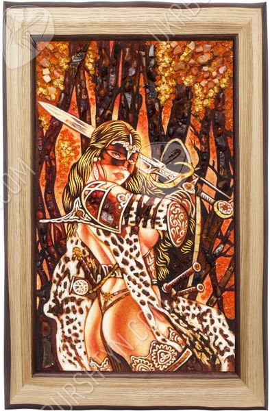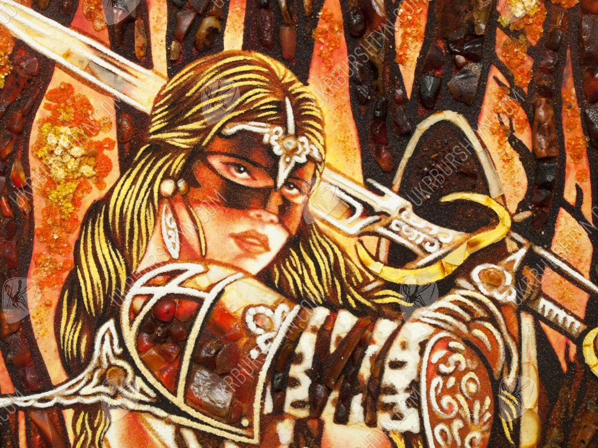 Сила, воинственность и уверенность в себе – вот что исходит от этой картины. Девушки, похожие на её героиню, известны как амазонки – племя женщин, которые сами сражались с врагами и не терпели никаких оскорблений. Тщательно проработанные детали – меч, занесённый в грозном взмахе, замысловатые доспехи, маска, прикрывающая лицо модели и объёмный пейзаж – делают изображение особенно запоминающимся и эффектным.