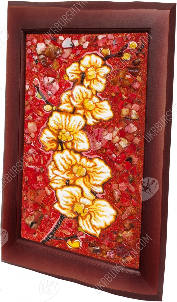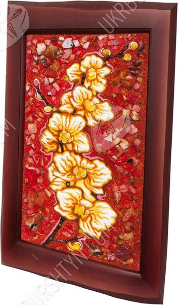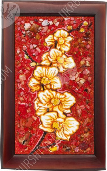 Символичные и неординарные картины с цветами – превосходный сюрприз для коллег и знакомых. К примеру, эффектная золотисто-кремовая орхидея, запечатленная на показанном здесь панно ручной работы, служит воплощением роскоши, элегантности, благородства, а ещё – весны, молодости и любви. Поэтому подобный подарок можно преподнести и друзьям, которые недавно вступили в брак, и опытной руководительнице проекта. Яркие, насыщенные тона натурального полесского янтаря, из которого высыпано изображение, делают его заметным и привлекательным, инкрустация из цельных самоцветов обеспечивает объёмный и реалистичный вид, а контрастный фон не позволит изделию затеряться среди другого декора.