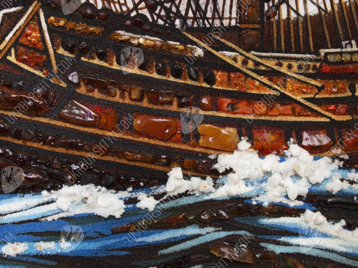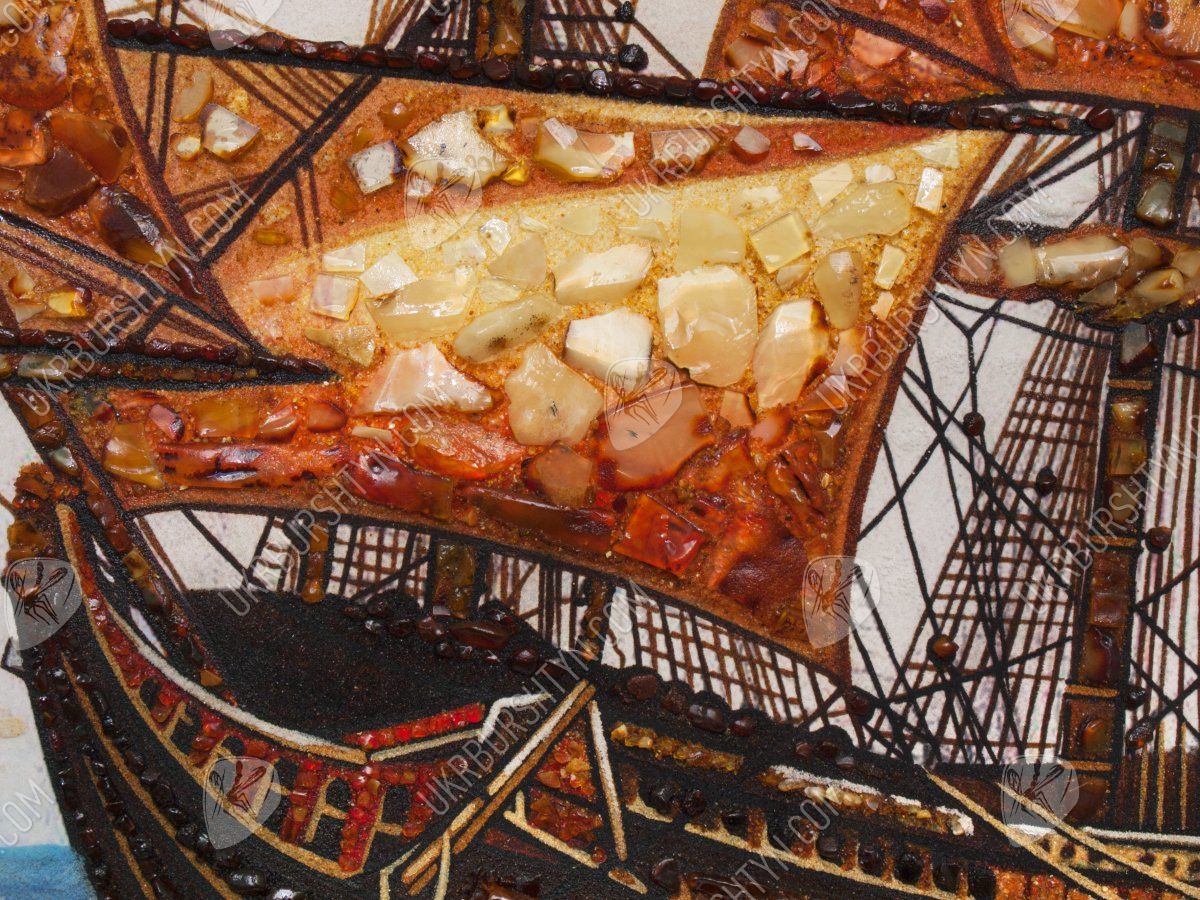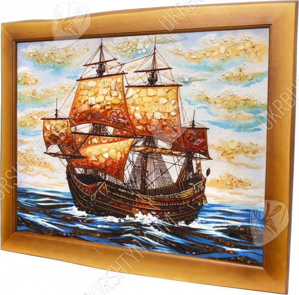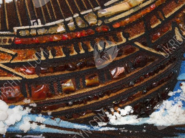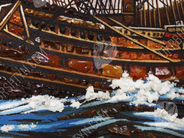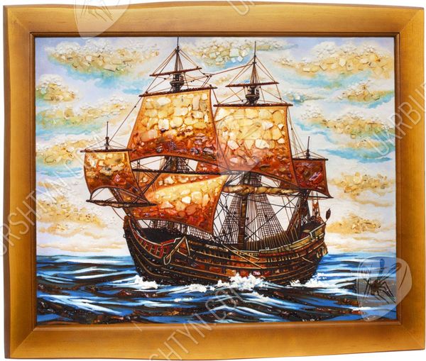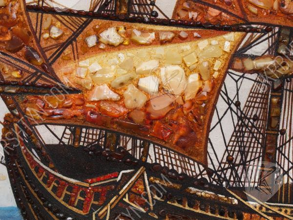 Всем кто не равнодушен к морской теме, представленное янтарное панно сможет напомнить о путешествиях в дальние страны. Эта работа украшена янтарной крошкой, которая переливается на свету разнообразными оттенками. Корабли и огромное море с перекатывающимися волнами, прекрасно смотреться при любом освещении. Такая живописная и объемная картина будет превосходным подарком любителям морских путешествий в дальние страны.