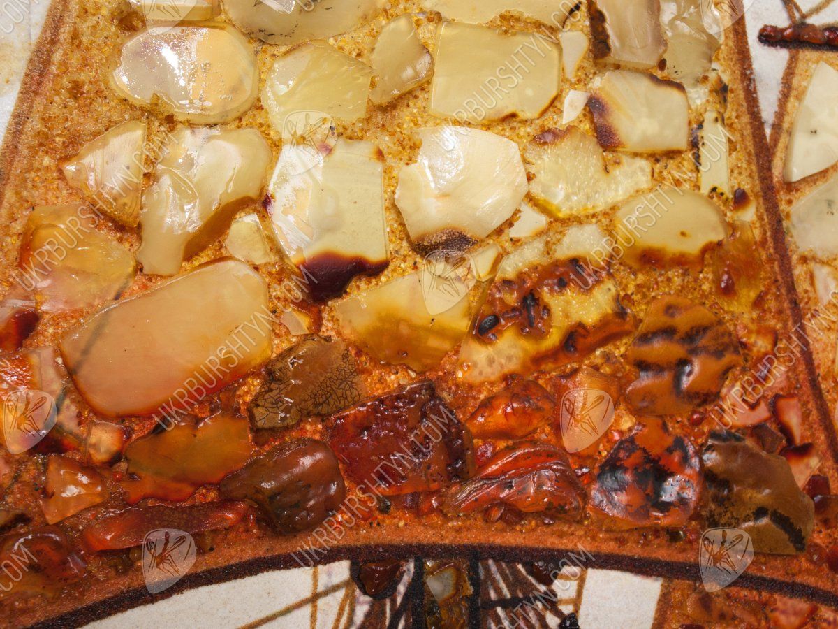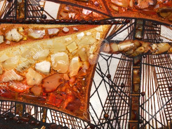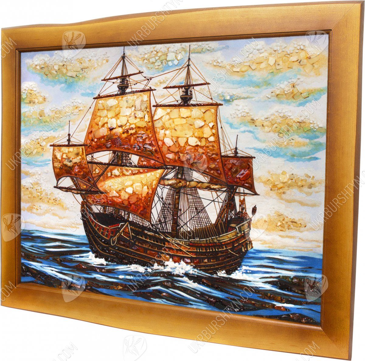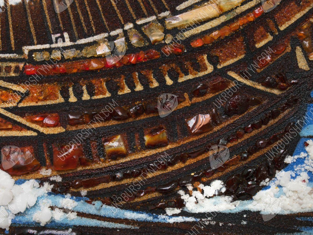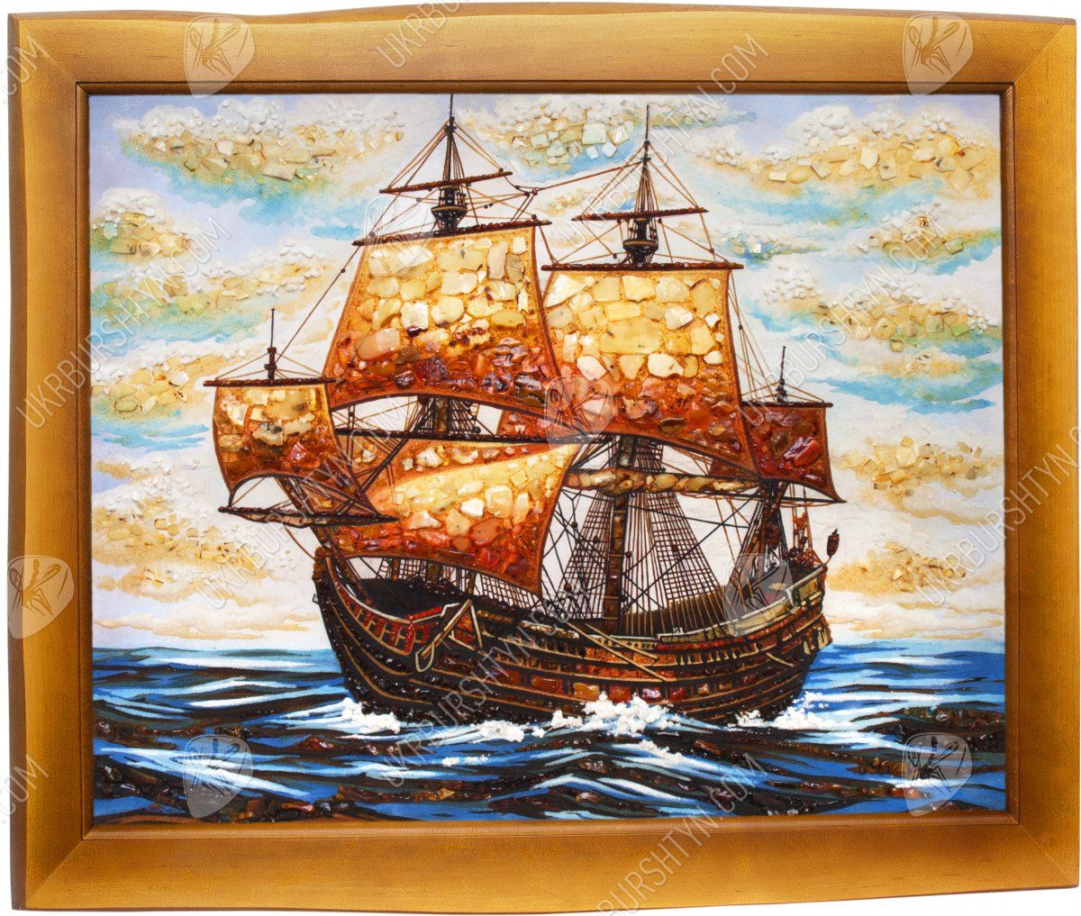 Всем кто не равнодушен к морской теме, представленное янтарное панно сможет напомнить о путешествиях в дальние страны. Эта работа украшена янтарной крошкой, которая переливается на свету разнообразными оттенками. Корабли и огромное море с перекатывающимися волнами, прекрасно смотреться при любом освещении. Такая живописная и объемная картина будет превосходным подарком любителям морских путешествий в дальние страны.