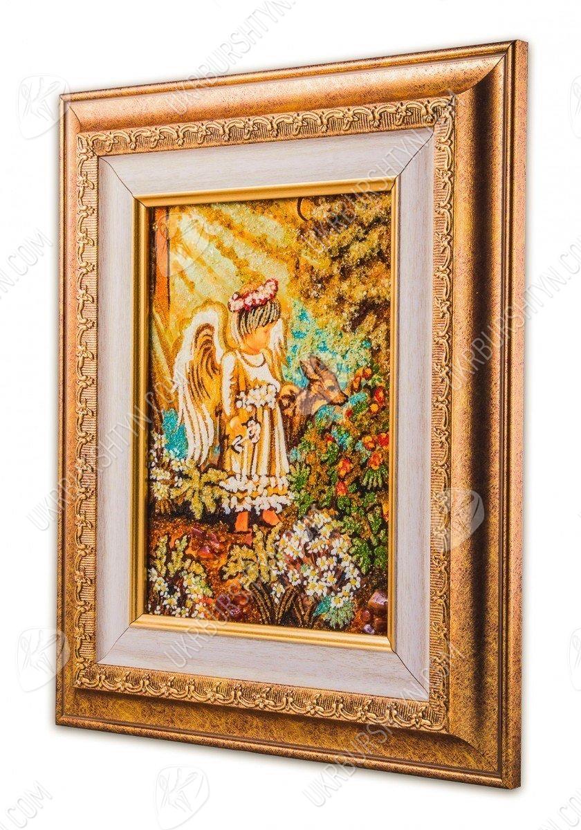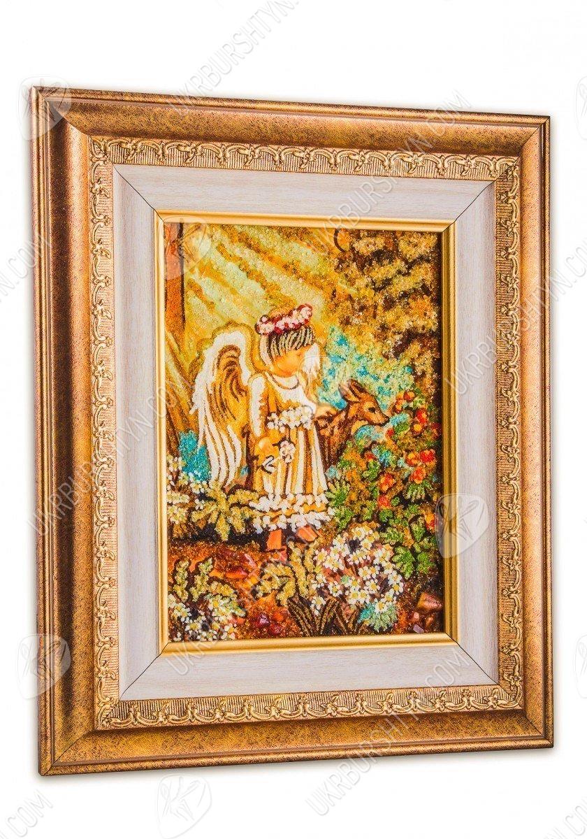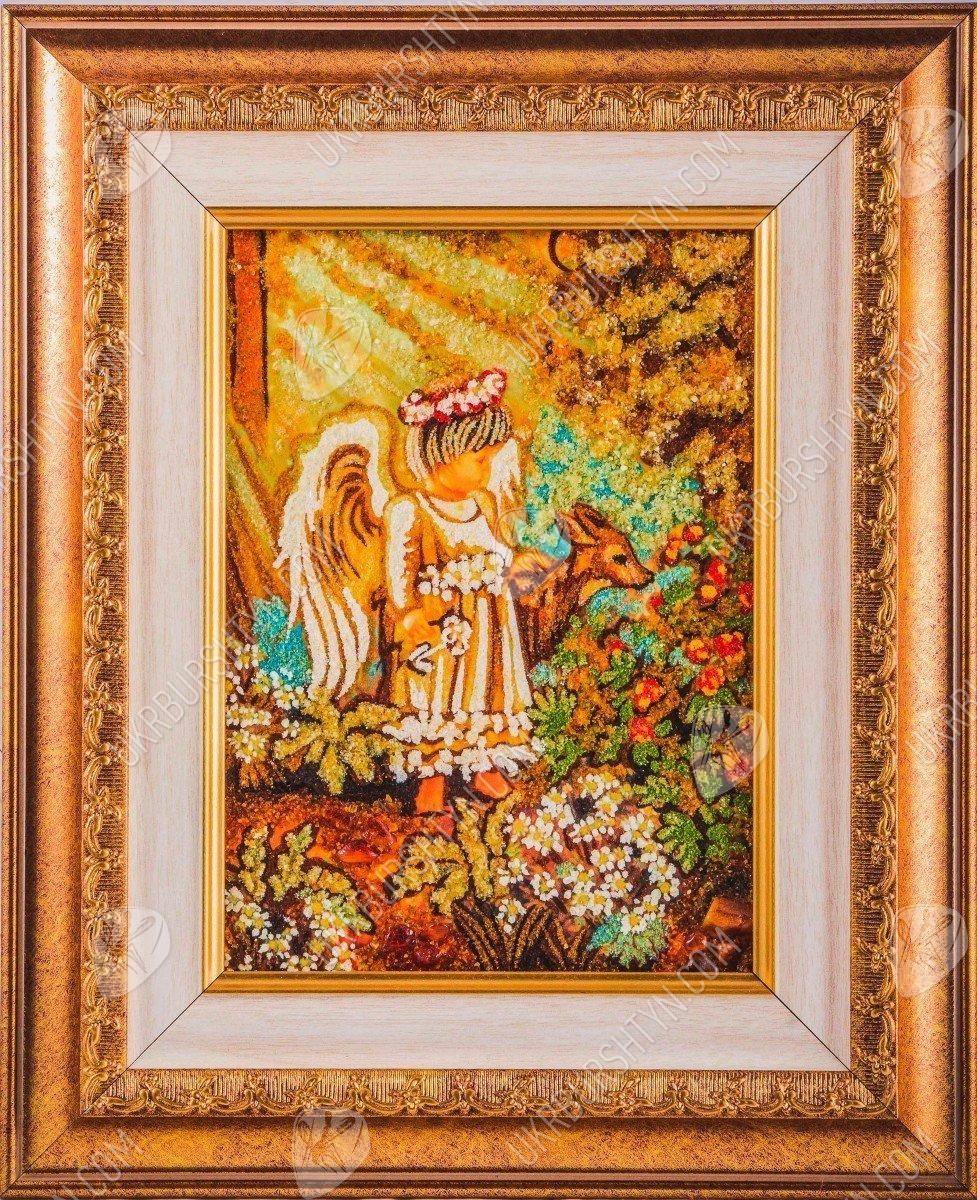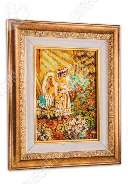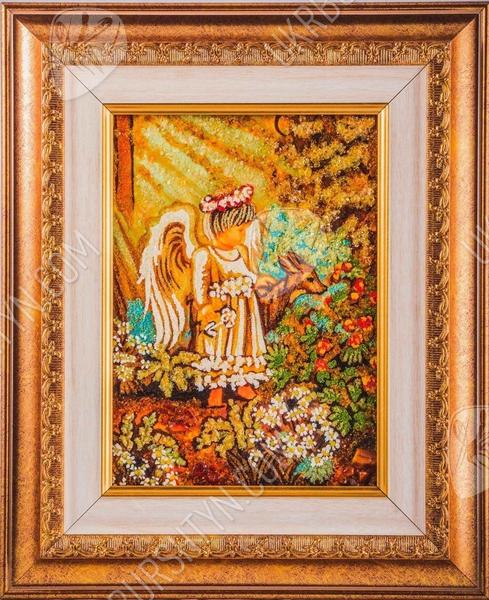 Перед нами картина, относящаяся к группе детских картин. На нас смотрит Ангелок и олененок, изображение пришедшие из детских сновидений. На янтарной картине мы видим не простого ангелочка, перед нами один из эпизодов жизни ангелов. Как только они появляются, все вокруг озаряется солнечным светом, кругом торжествует счастье и радость. Янтарь, это камень, способный передать такой свет. Лесная полянка озаряется яркими лучами.