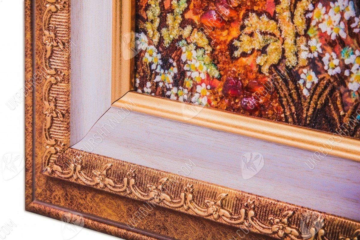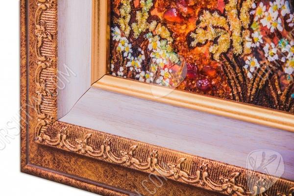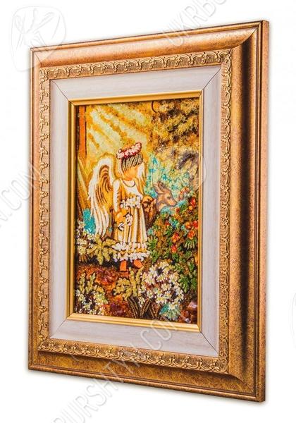 Талантливые руки художника смогли создать этот неповторимый шедевр, на радость взрослым и детям. Картину наполняют оттенки леса и цвета янтаря. Аккуратно подобранные, хорошо отшлифованные солнечные камешки, украшающие все панно, образуют ветку дерева, переливаются в руке ангела. Такое панно можно подарить молодой маме или на день рождения малыша.