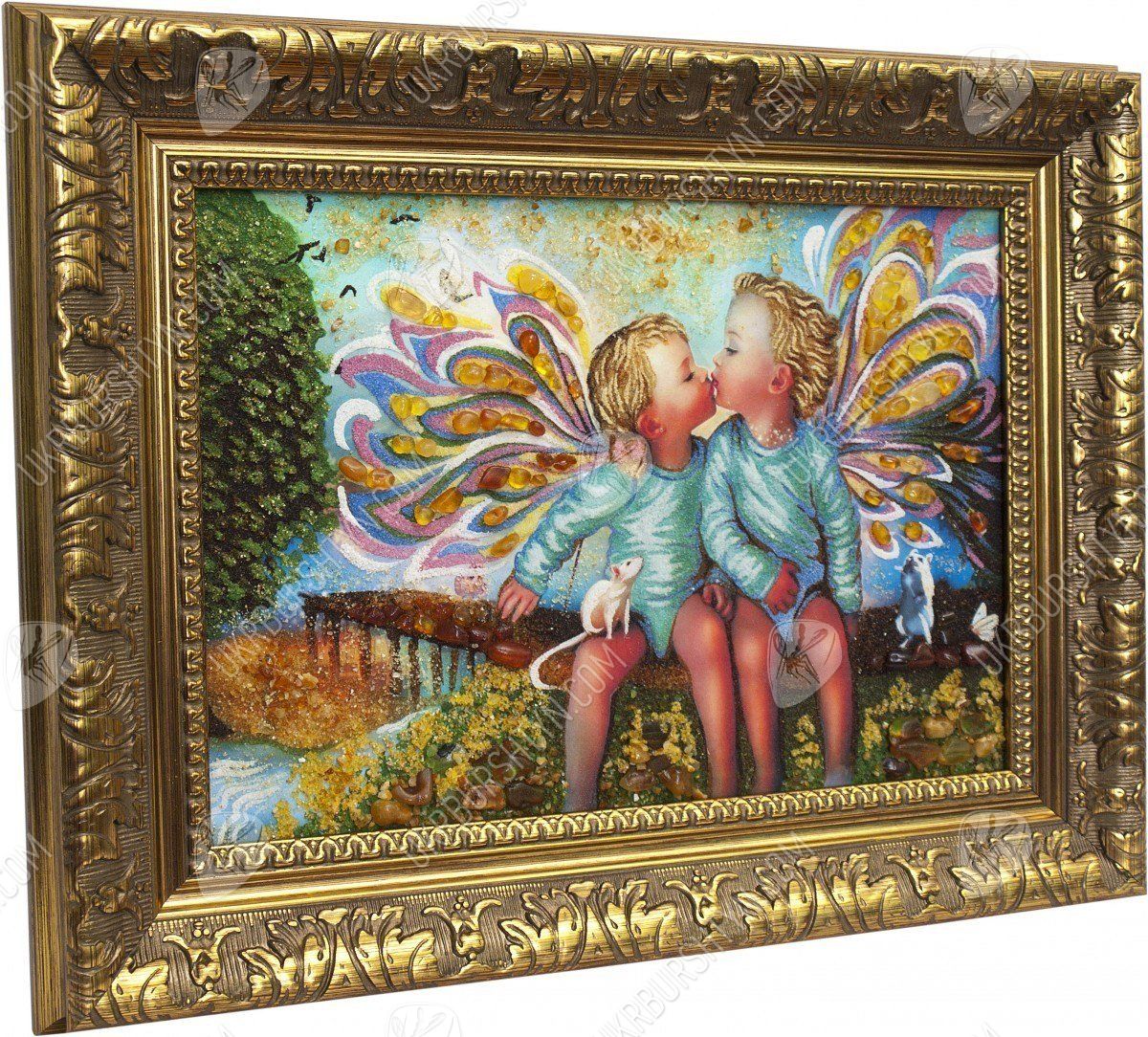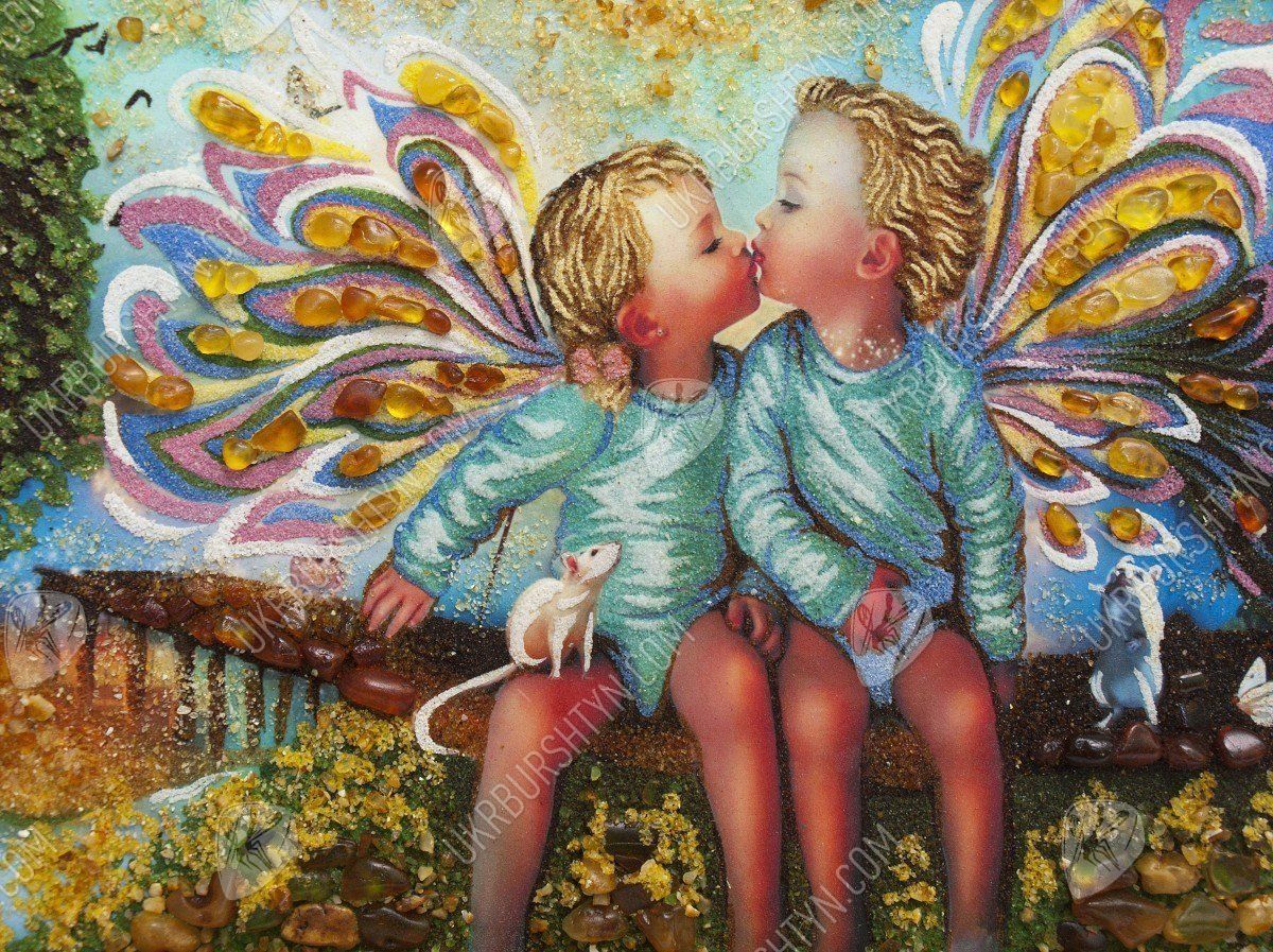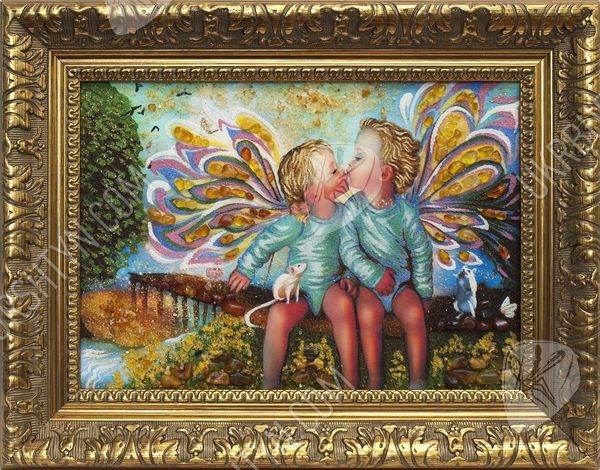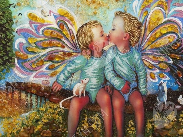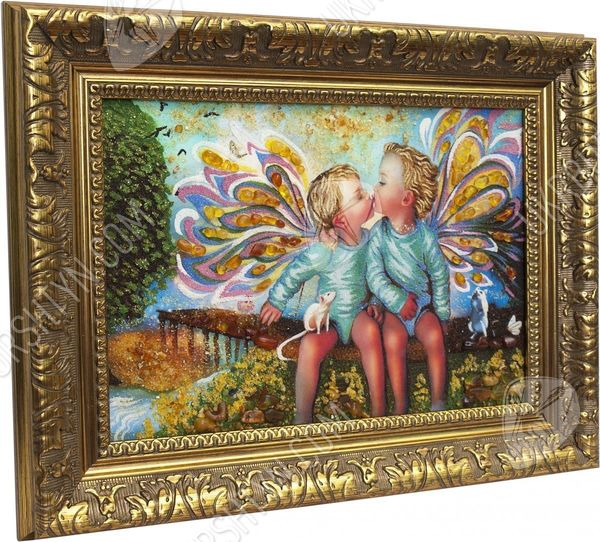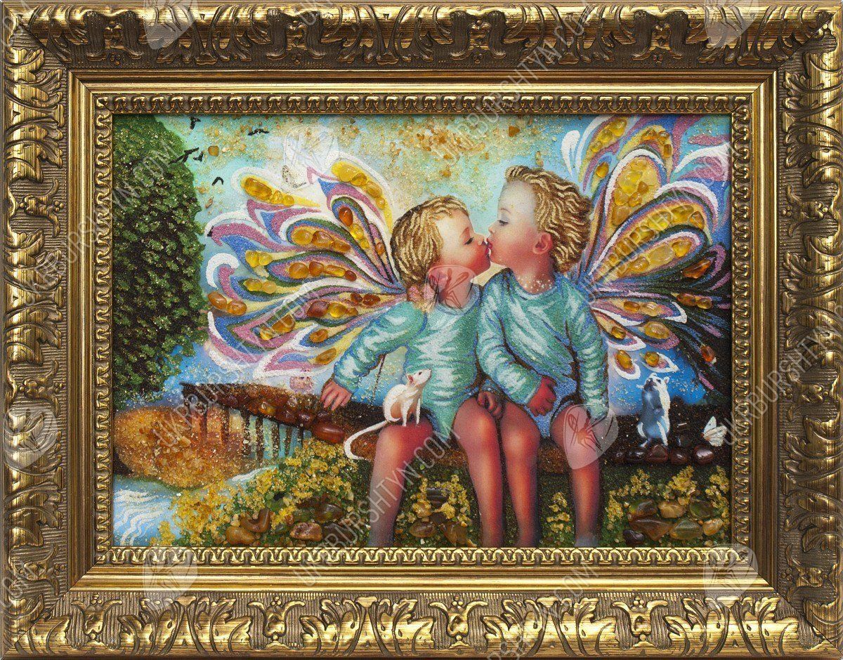 Художники, рисующие картины с ангелами, часто изображают небесных посланников в виде детей, чтобы воочию передать их чистоту, невинность и радость от единения с Господом. Именно такой приём использовал и мастер, создавший это панно. На нём запечатлены двое ангелочков, которых сопровождают ручные зверьки. Вдали виднеется удивительный пейзаж – пристань, ведущая к морю, песчаный берег и раскидистое дерево. Лучистые драгоценные камни придают произведению объём, фантастический колорит и живость, а самоцветная крошка позволила воспроизвести даже самые тонкие нюансы цвета и формы. Такие изделия из янтаря преобразят интерьер, сделав любое помещение уютным, стильным и неординарным.