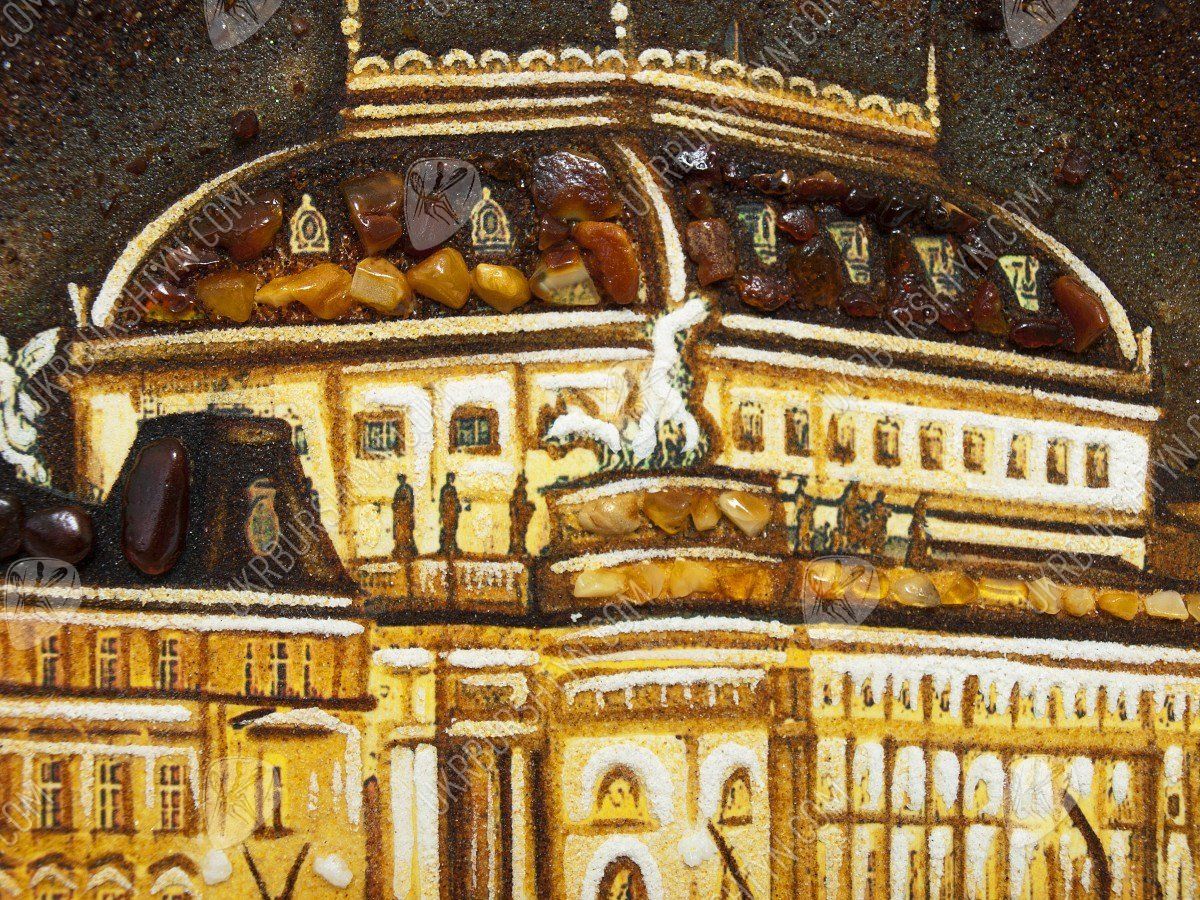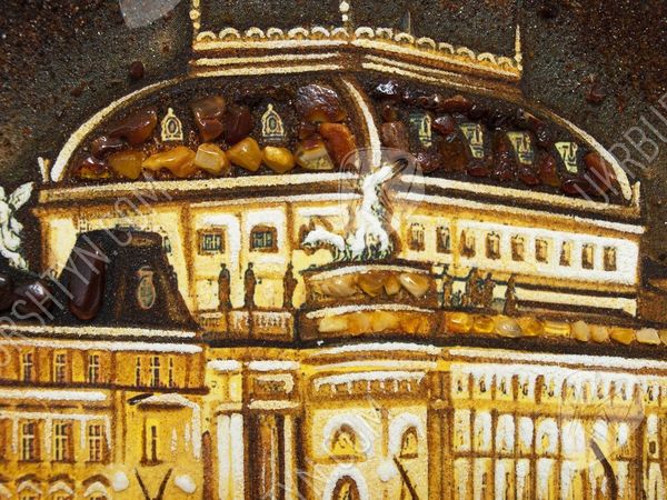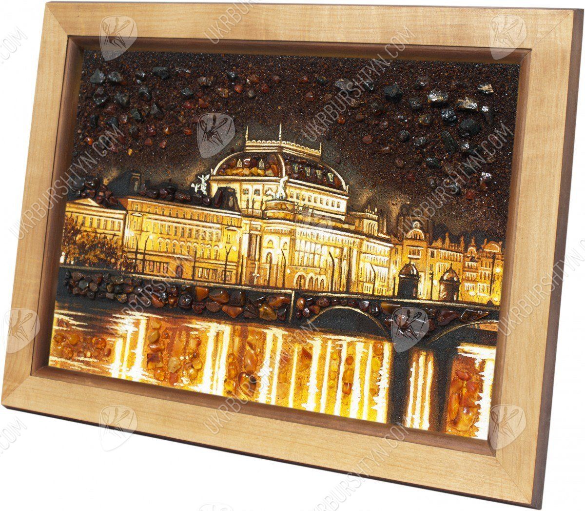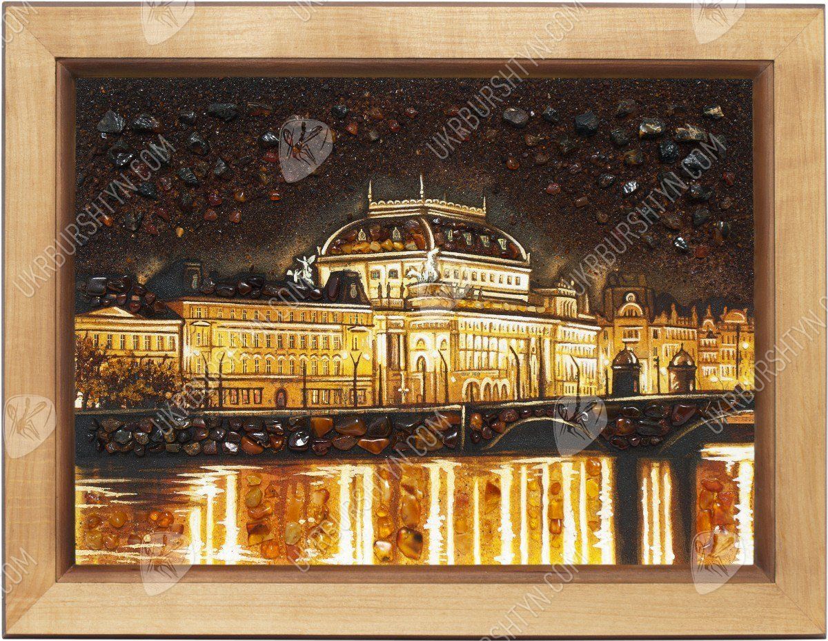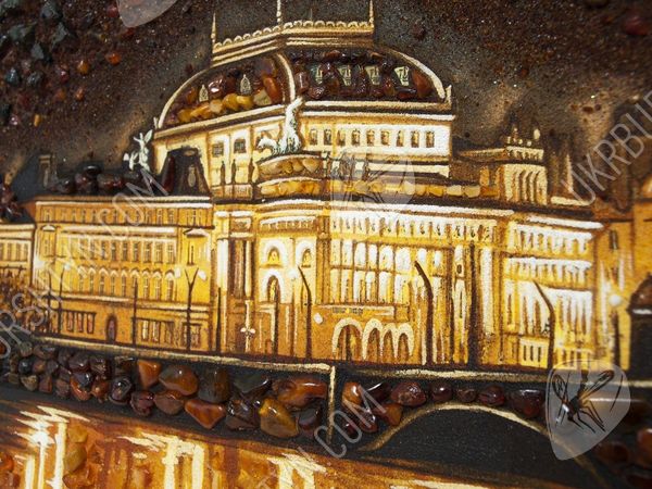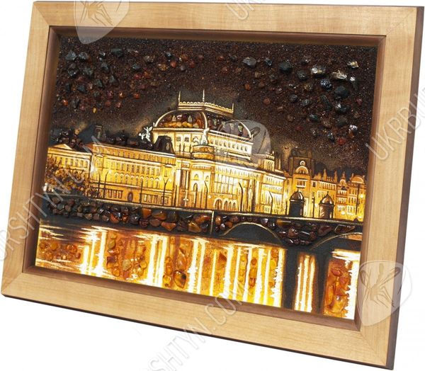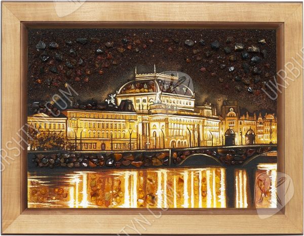 Как Вы думаете, что за сооружение запечатлел мастер на этом панно? Королевский дворец? Величественный храм? Здание парламента? Нет, это – Национальный театр. Прага по праву гордится этим строением, ведь деньги на его реставрацию после пожара собирали всей страной. Об этом до сих пор напоминает надпись в зрительном зале «Нация – себе». Мастер тщательно воспроизвёл все архитектурные особенности, высыпав мелкие детали из самоцветной крошки, а затем украсив изображение россыпью цельных драгоценных камней. В нашем интернет-магазине Вы можете купить изделия из янтаря, на которых изображены столь же интересные и неординарные места – чтобы узнать о них больше, свяжитесь с нашим менеджером.