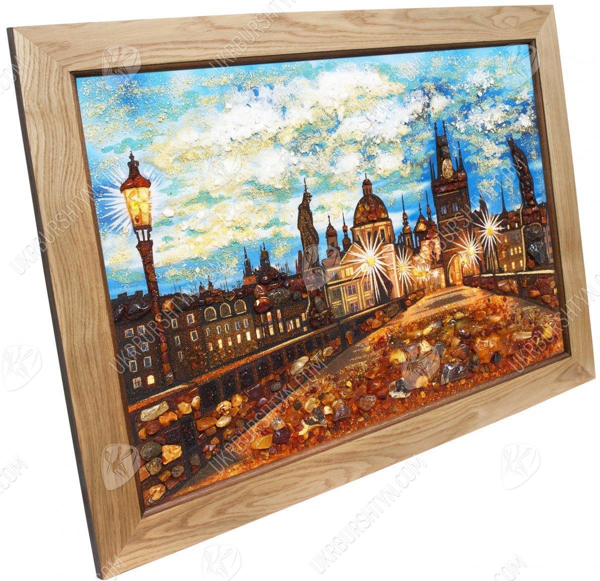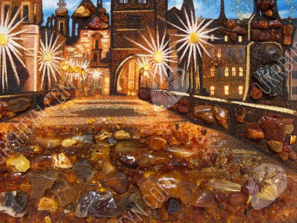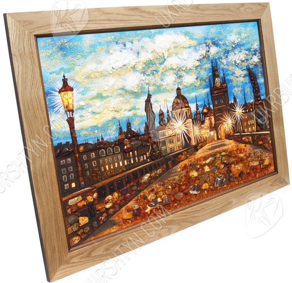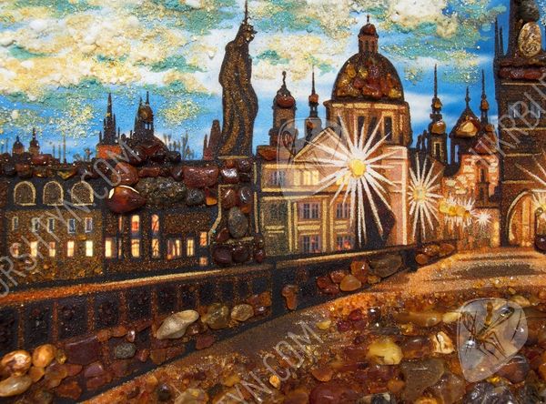 Панорамы далёких стран и городов – лучшее дополнение к декору гостиной, оформленной в стиле «Классика», «Конструктивизм» или «Эклектика». Поэтому, если Вы собираетесь придерживаться одного из этих направлений – это декоративное панно окажется как нельзя кстати. На нём запечатлён один из прекраснейших видов Старого Света – Карлов мост в Праге. На фоне вечернего неба чётко и рельефно выделяются силуэты скульптур, крыш, башен и шпилей, высыпанные из янтарной крошки. Вставки из цельных самоцветов делают их более объёмными и колоритными – как и мостовую на переднем плане. Наш интернет магазин картин может предоставить Вам и другие схожие произведения – понадобится лишь связаться с менеджером.