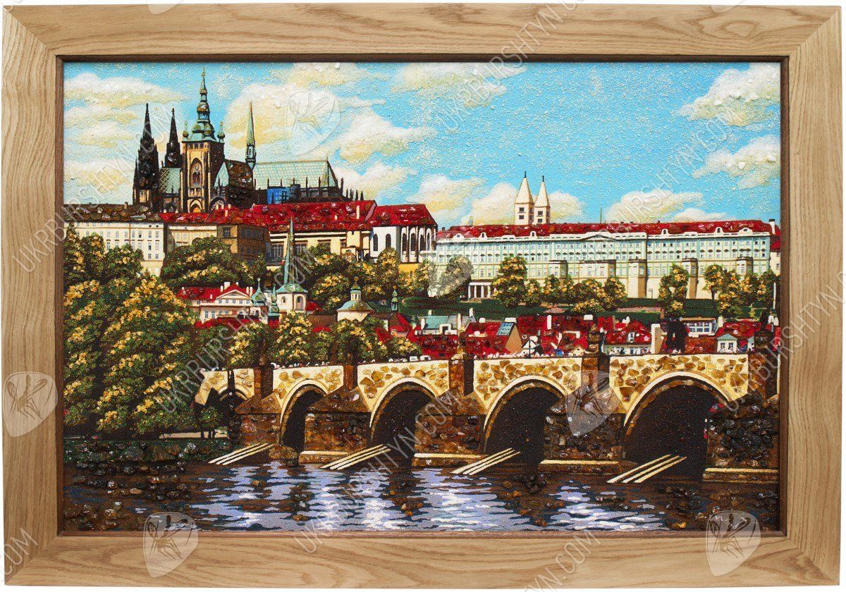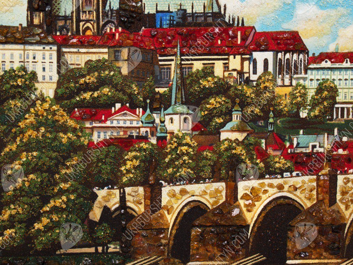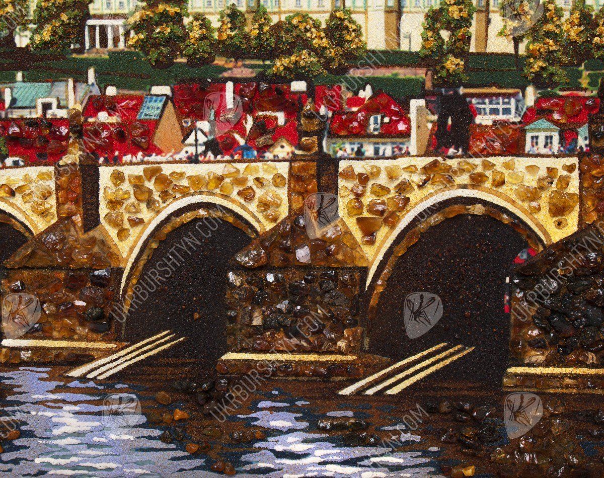 Вы побывали в туристической поездке по Европе, а теперь хотите купить картину на память о путешествии? Это декоративное панно являет зрителю один из самых знаменитых и прекрасных уголков Старого Света – Карлов мост в Праге. Мастер запечатлел его мощные и вместе с тем изящные арки, опоры и пролёты, используя цельные коричневатые, бежевые и терракотовые самоцветы. Алые драгоценные камни украсили черепитчатые крыши старинных домов. А для передачи более мелких деталей – пышных, раскидистых деревьев, окон, стройных шпилей и башенок – применялась мелкая янтарная крошка. Подобная комбинация делает произведение красочным, рельефным и уникальным – то, что нужно для интерьерного аксессуара!