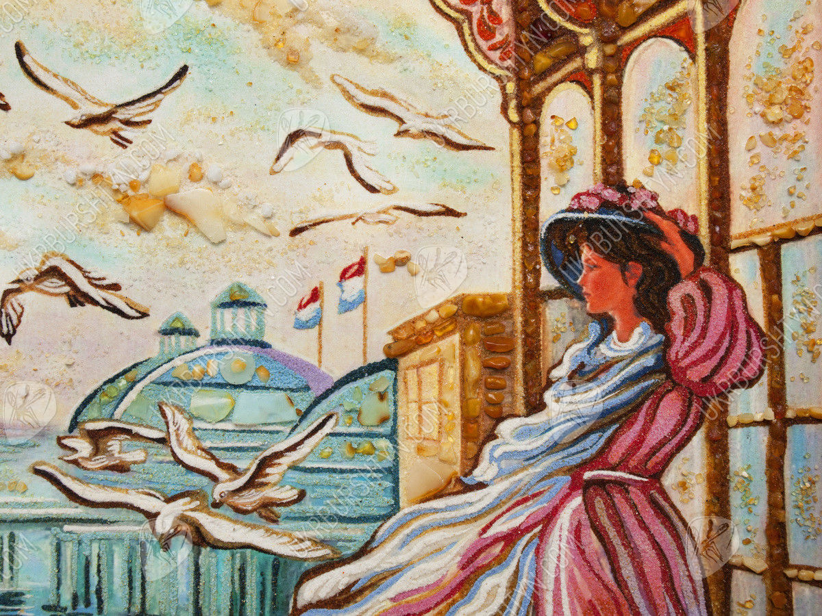 В центре композиции – девушка в старинном наряде. Платье с оборками и широкая шаль развеваются на свежем морском бризе, а рукой красавица придерживает аккуратную шляпку. Юная леди, у чьих ног послушно сидят две борзые, стоит на просторной террасе – оттуда открывается превосходный вид на море и сказочный город на его берегу. А чайки, парящие в небесной выси, делают изображение живым и динамичным.