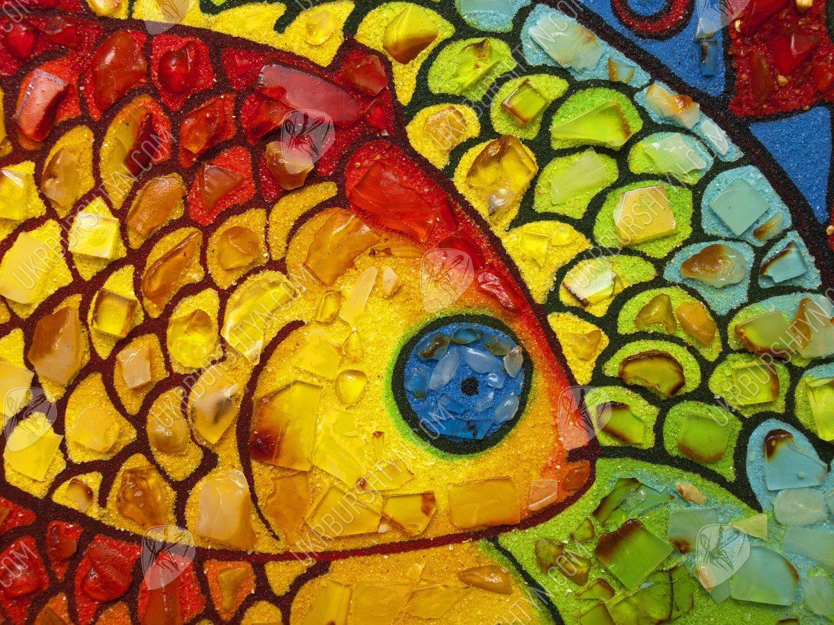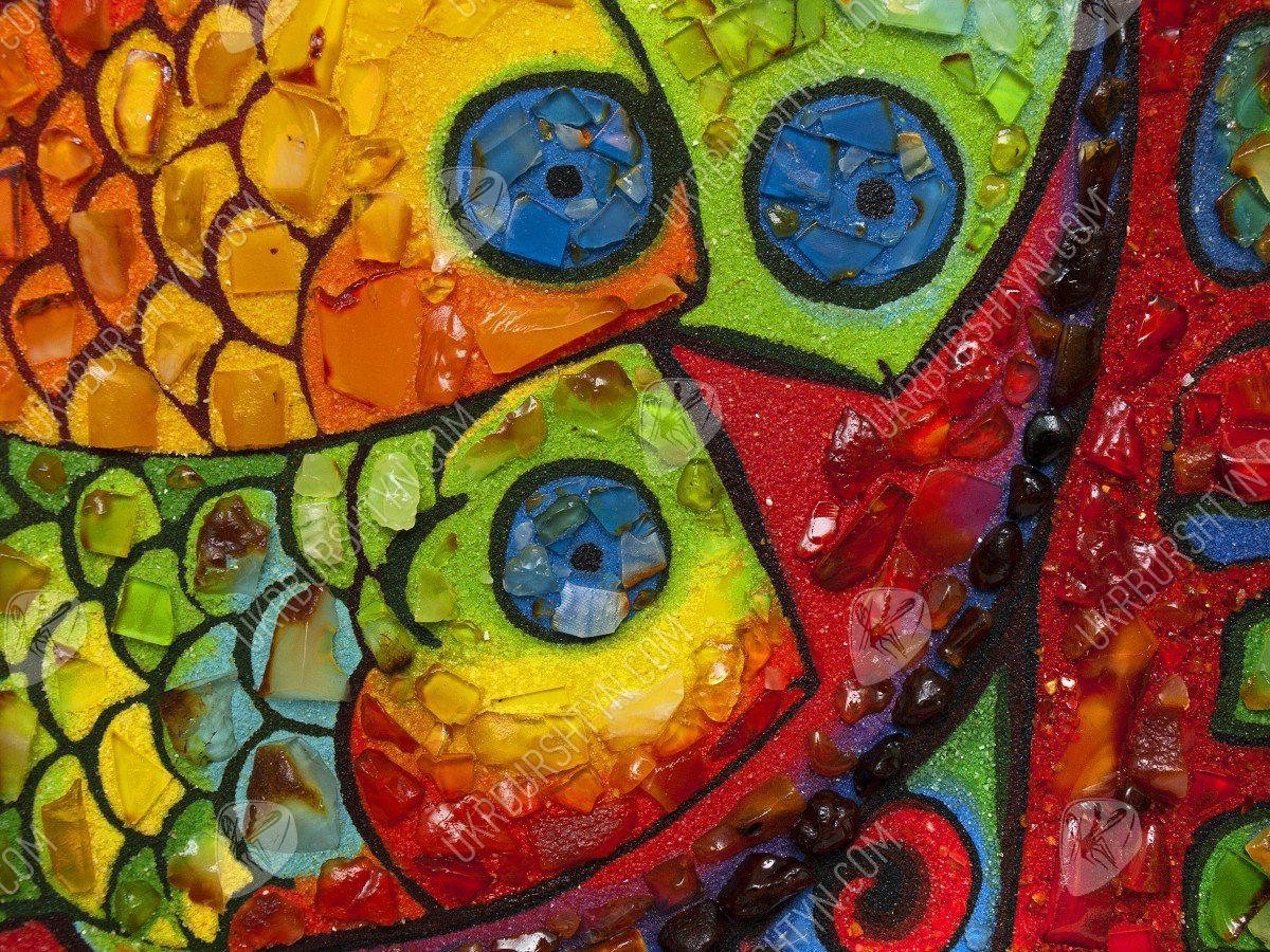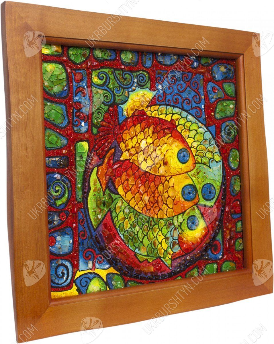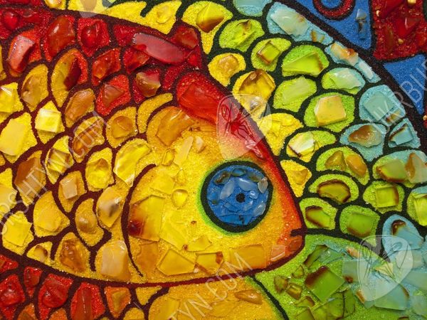 Картины для спальни ребёнка должны быть красивыми, привлекательными и яркими – и это авторское панно в точности соответствует всем требованиям! Симпатичные рыбки высыпаны из золотистой, оливковой, шафрановой и оранжевой каменной крошки. Их крошечные чешуйки, декорированные цельными натуральными самоцветами, играют мягкими солнечными отблесками, и такими же огоньками переливается украшенный миниатюрными кусочками окаменевшей смолы фон. Необычные сочетания тонов, оригинальный сюжет, забавный и милый вид – это произведение гарантированно станет любимым аксессуаром малыша! А заказать картину из янтаря очень просто – нужно лишь обсудить с менеджером желаемый размер и рамку.
