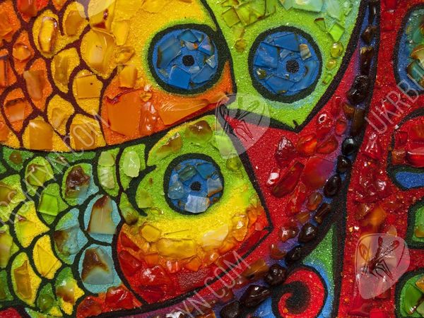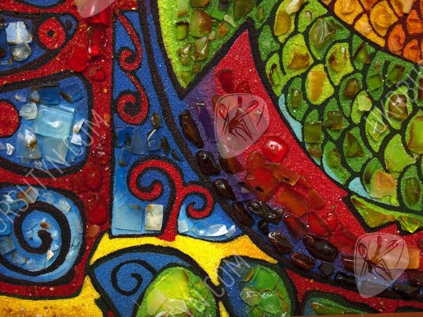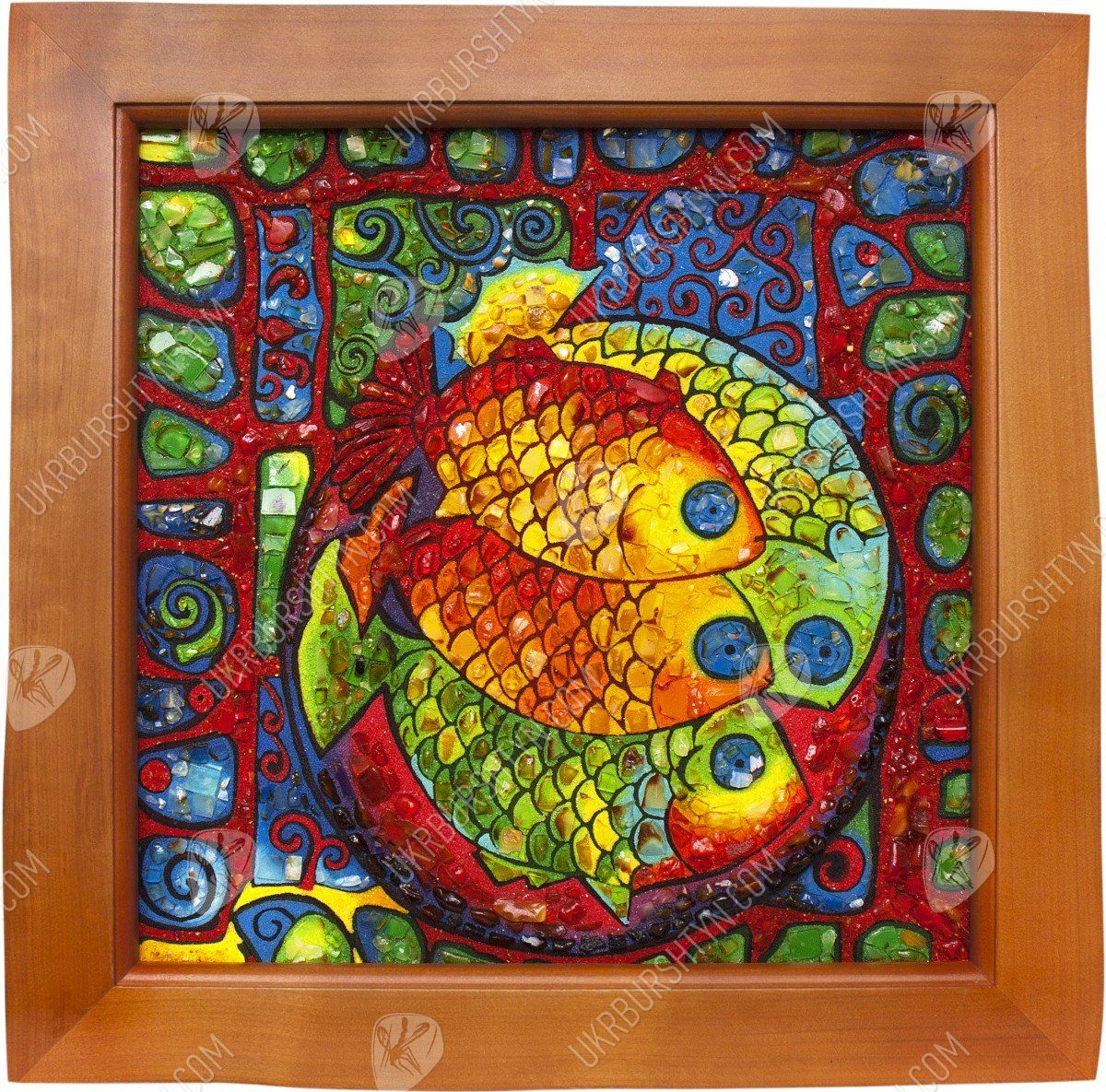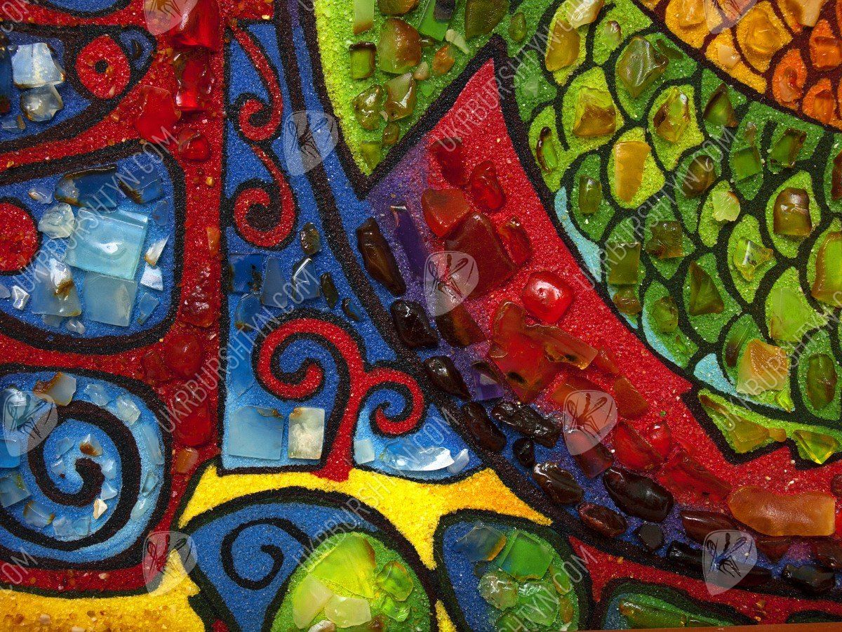Картины для спальни ребёнка должны быть красивыми, привлекательными и яркими – и это авторское панно в точности соответствует всем требованиям! Симпатичные рыбки высыпаны из золотистой, оливковой, шафрановой и оранжевой каменной крошки. Их крошечные чешуйки, декорированные цельными натуральными самоцветами, играют мягкими солнечными отблесками, и такими же огоньками переливается украшенный миниатюрными кусочками окаменевшей смолы фон. Необычные сочетания тонов, оригинальный сюжет, забавный и милый вид – это произведение гарантированно станет любимым аксессуаром малыша! А заказать картину из янтаря очень просто – нужно лишь обсудить с менеджером желаемый размер и рамку.