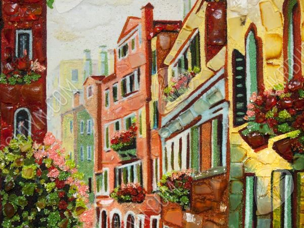 Из сияющей каменной крошки высыпана улочка-канал – вода струится прямо между домами, и по ней скользят изящные лодки-гондолы. Мастер тщательно воспроизвёл атмосферу «жемчужины моря» – пастельные тона, в которых выдержано панно, смотрятся мягко и романтично, вставки из цельных полесских самоцветов идеально подошли для передачи объёма и рельефности, а мелкие детали – от цветущих вазонов на подоконниках до замысловатых элементов архитектуры – добавляют произведению достоверности.