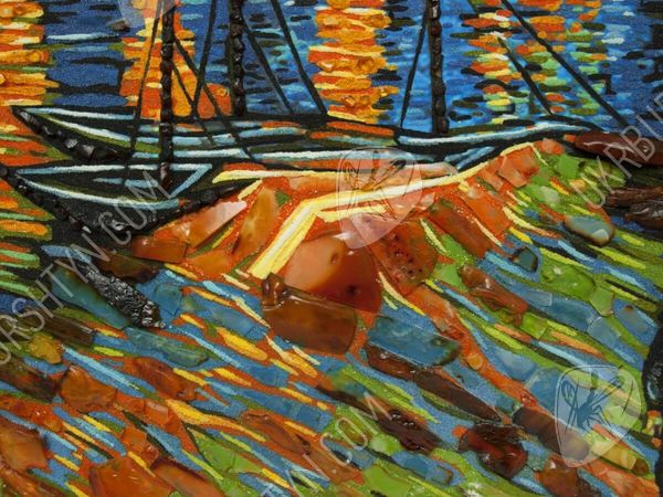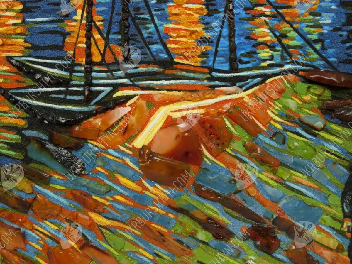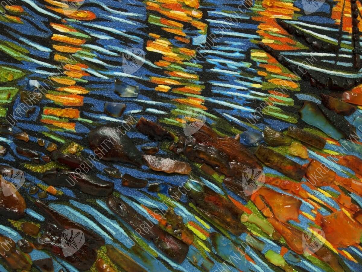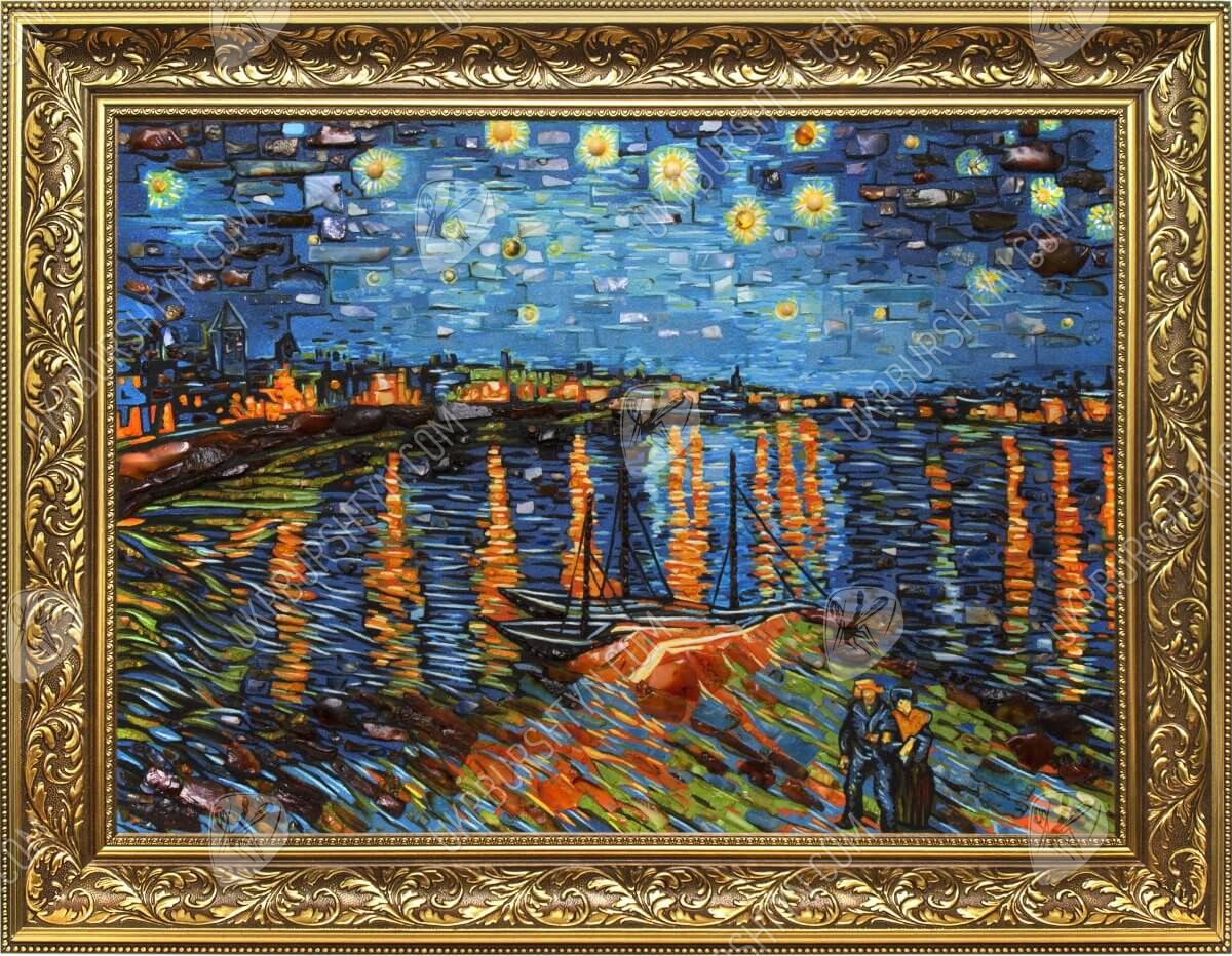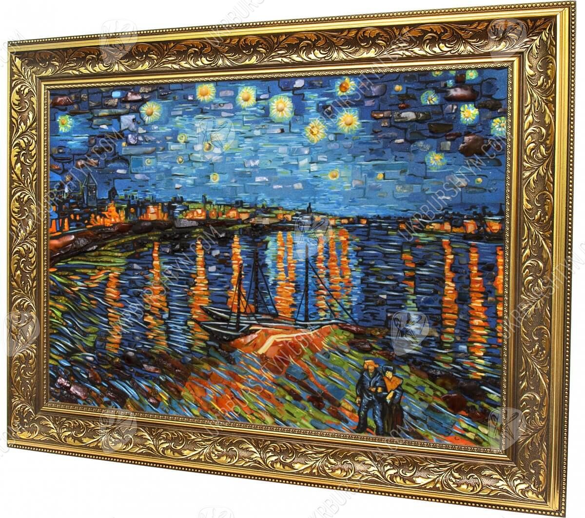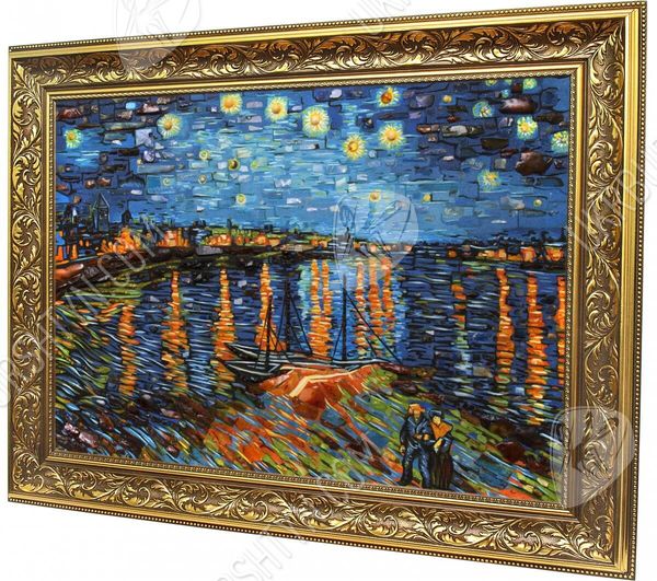 Репродукция ван Гога – отличный интерьерный аксессуар для рабочего кабинета либо офиса. Не станет исключением и это янтарное панно, выполненное по мотивам знаменитой картины «Звёздная ночь над Роной».