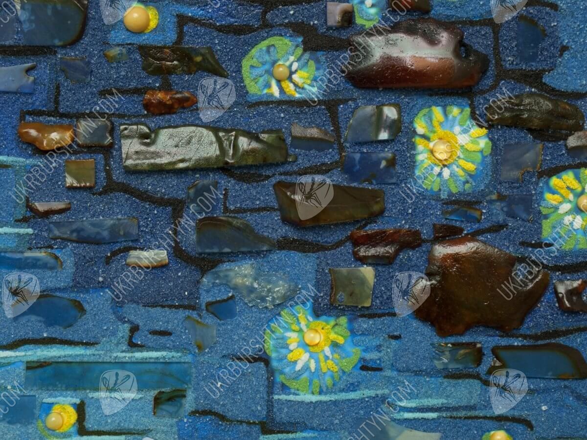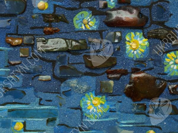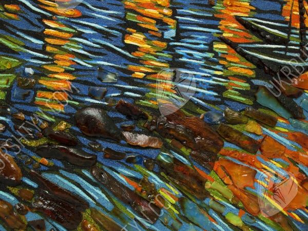 Широкая река струится меж берегов, выложенных из цельных кусочков застывшей смолы. Каменная крошка и цельные полесские самоцветы, которые мерцают золотистыми, шафрановыми и оранжевыми бликами, позволили изобразить таинственное сияние ночных светил, отражённых в спокойной воде. Вдали искрятся городские огни – они привносят в рисунок тепло и умиротворение. А показанная на переднем плане пара влюблённых, которые отправились на вечернюю прогулку, делает произведение живым и динамичным.