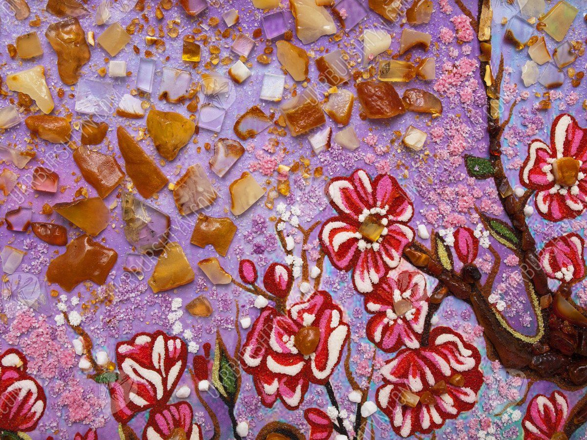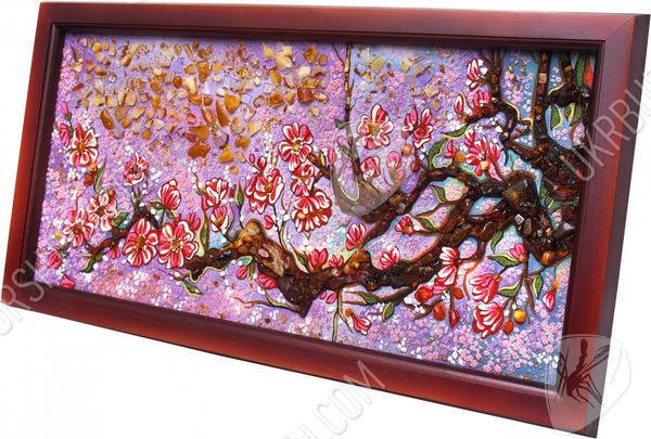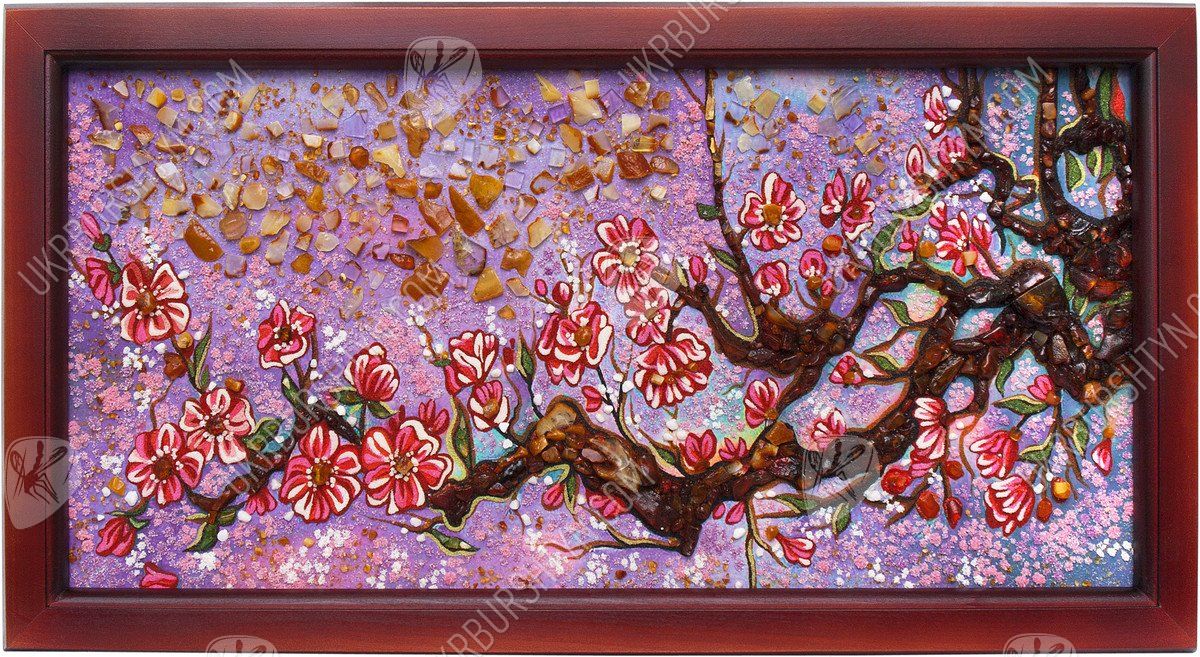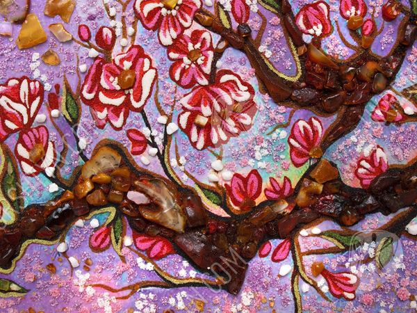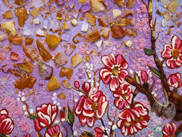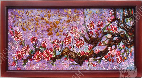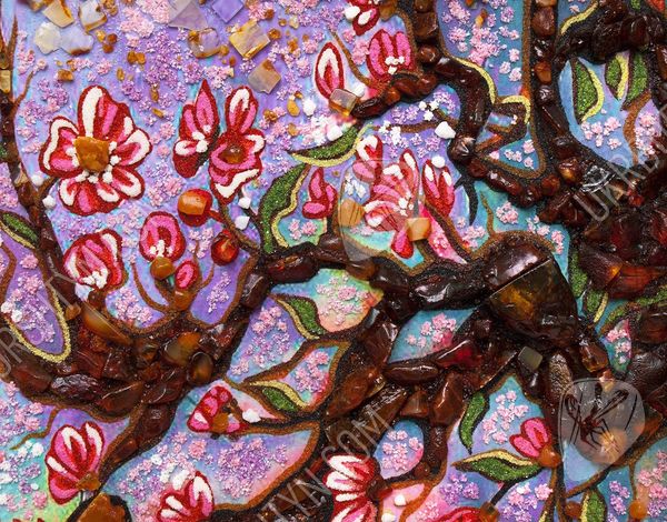Ваш ребёнок идёт в первый класс? Поздравьте его с этим знаменательным событием, приобретя новые картины в детскую. И одной из них может стать это авторское панно, изготовленное из натурального полесского янтаря. Золотистые, шафрановые, кремовые, розоватые тона каменной крошки, из которой сделаны нежные цветы, оттеняет ветка, выложенная из тёмно-коричневых и терракотовых самоцветов. Цельные кусочки окаменевшей смолы слегка выдаются над поверхностью работы, придавая ей рельефность, объём и реалистичность. А из-за того, что в Японии сакура в интерьере олицетворяет молодость, пробуждение, новое начало, удачу и красоту, подобный сюрприз будет не только оригинальным, но и символичным.