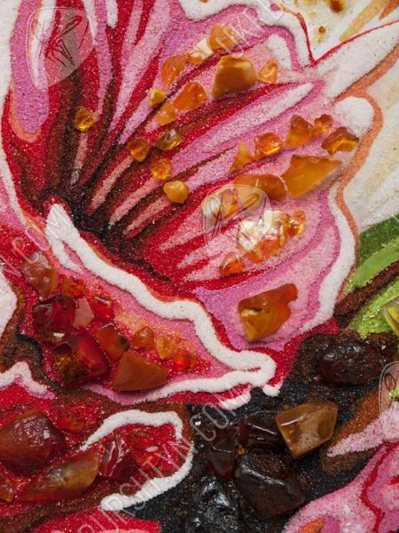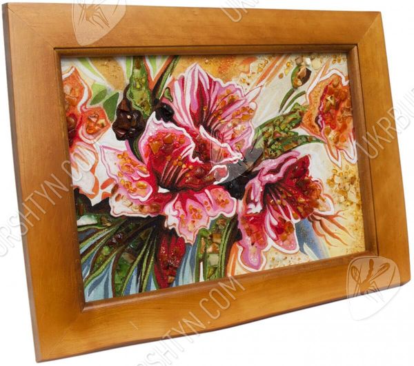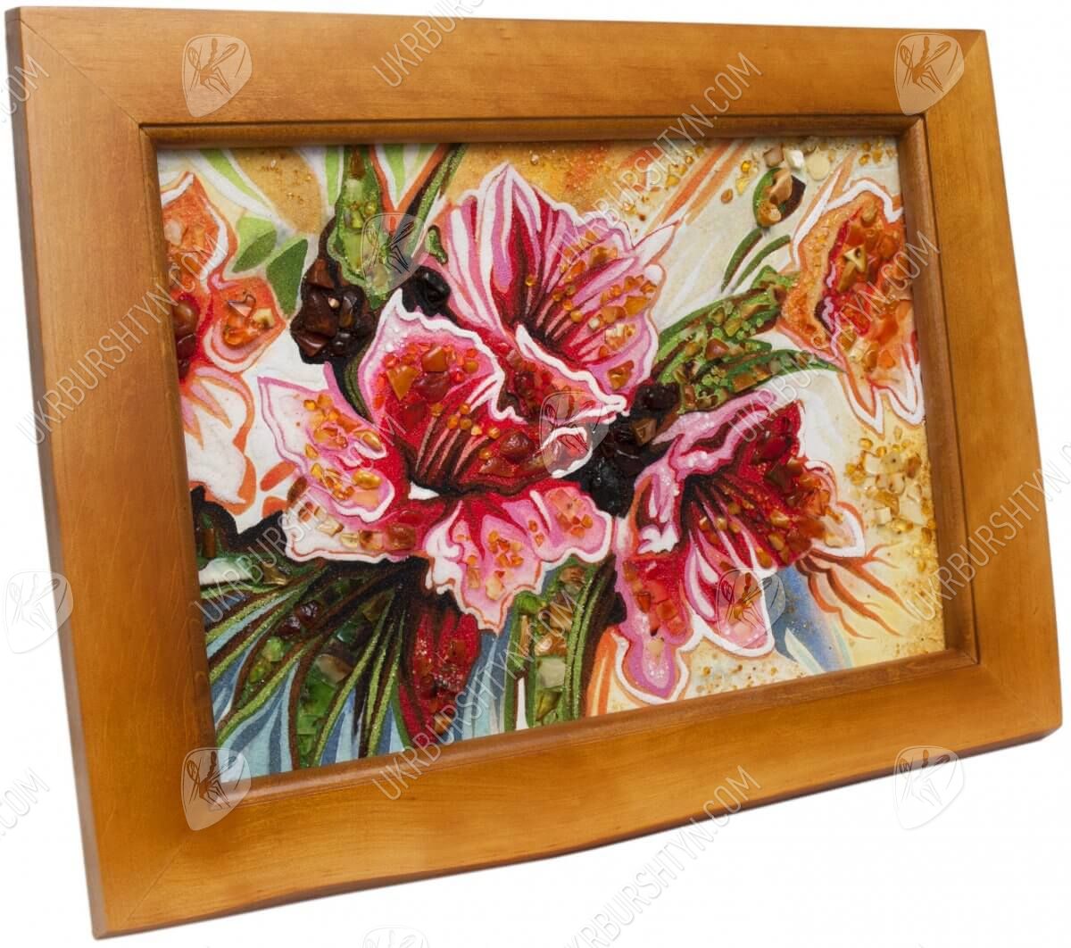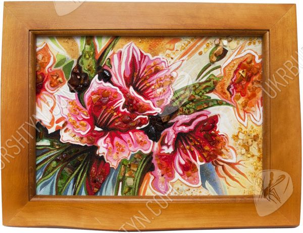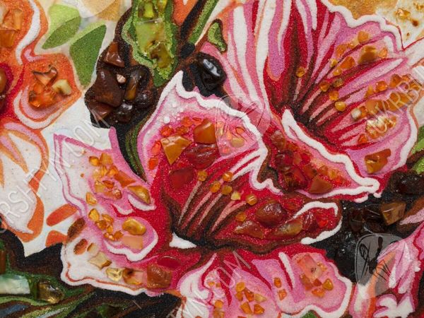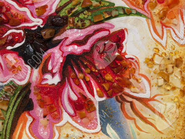К примеру, показанное здесь панно будет отличным дополнением к дизайну гостиной, столовой или спальни. Фантазийные цветы из каменной крошки сияют нежно-розовыми, багровыми, оранжевыми и золотистыми оттенками. Их лепестки и листья усыпаны крупными шафрановыми, алыми, изумрудными и терракотовыми кабошонами. Цельные драгоценные камни сверкают, точно капли росы! А светлый фон и такая же неброская рама позволяют в полной мере оценить насыщенные тона рисунка, не отвлекаясь на сторонние детали.