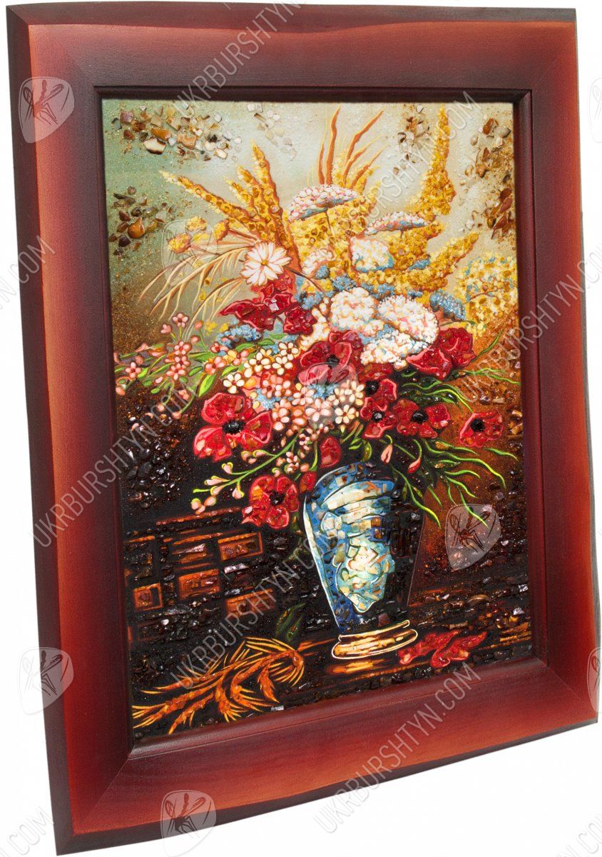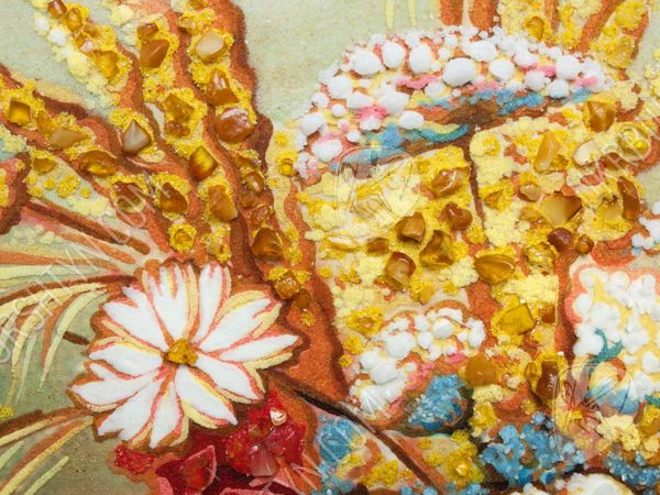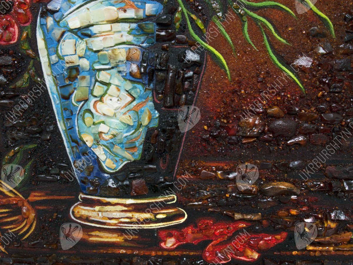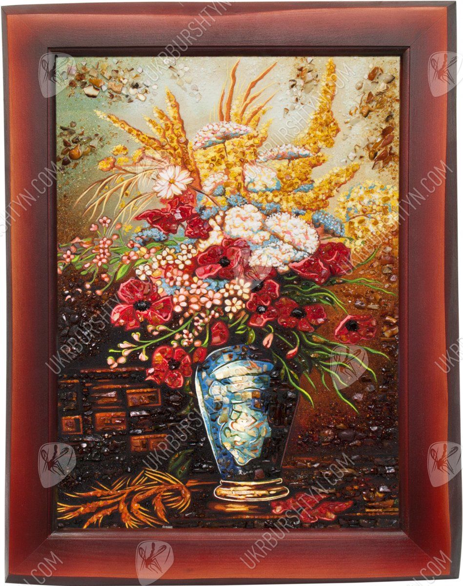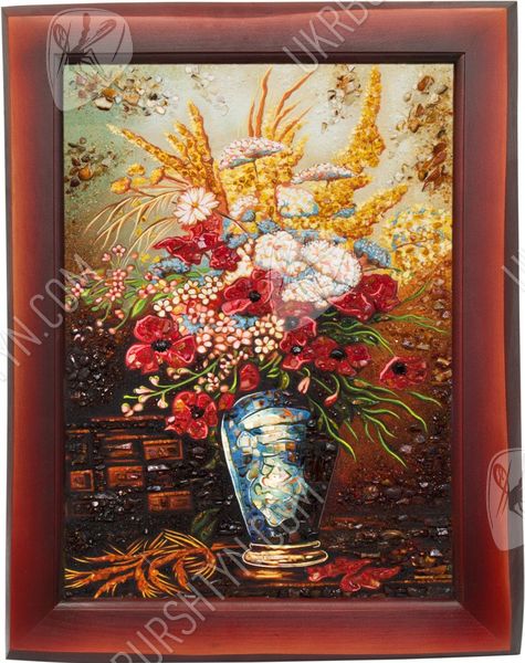 Сезонный декор – чудесная возможность преобразить поднадоевший интерьер, не затевая ремонта. В частности, готовясь к лету, Вам стоит заказать картину с цветами ручной работы – она привнесёт в дом атмосферу радости, уюта и тепла. И превосходным образчиком таких произведений является это оригинальное панно. Мастер запечатлел на нём полевые растения, старательно высыпав из лучистой янтарной крошки и пышные маки, и скромные ромашки, и золотые пшеничные колосья. Яркие тона букета подчёркивает изящная ваза, украшенная рельефными вставками из цельных кремовых, тёмно-коричневых и голубоватых самоцветов, а также фон, переливающийся терракотовыми, коньячными и шафраново-оранжевыми бликами.