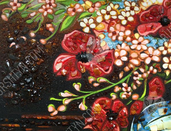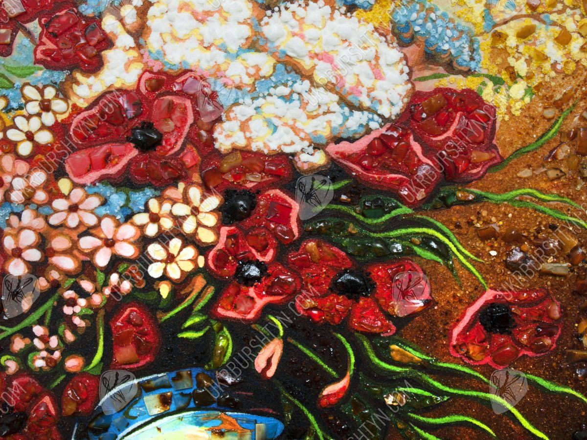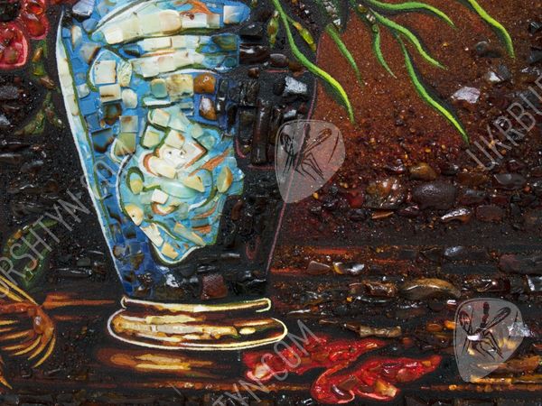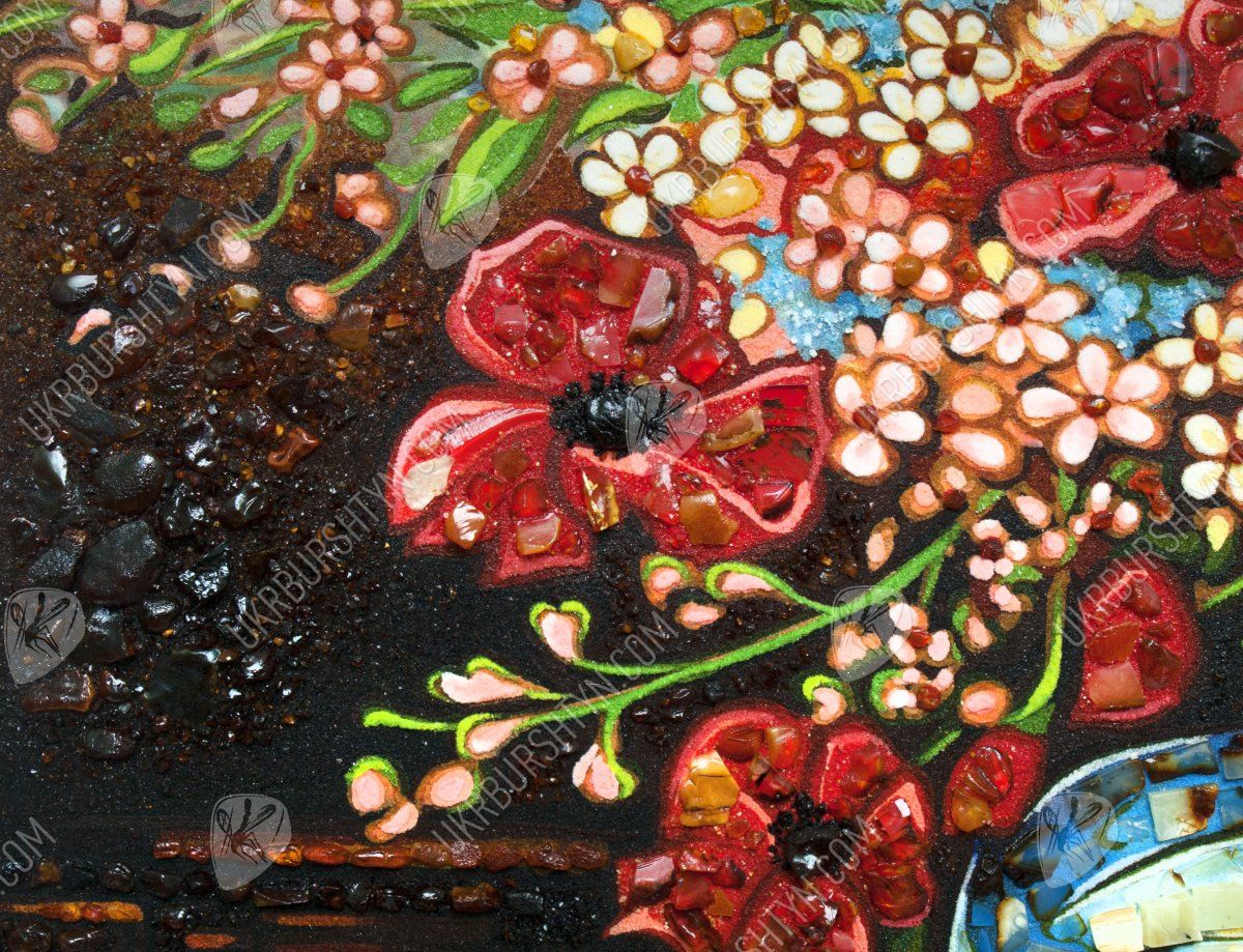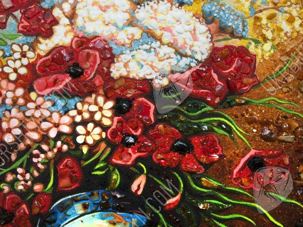 Сезонный декор – чудесная возможность преобразить поднадоевший интерьер, не затевая ремонта. В частности, готовясь к лету, Вам стоит заказать картину с цветами ручной работы – она привнесёт в дом атмосферу радости, уюта и тепла. И превосходным образчиком таких произведений является это оригинальное панно. Мастер запечатлел на нём полевые растения, старательно высыпав из лучистой янтарной крошки и пышные маки, и скромные ромашки, и золотые пшеничные колосья. Яркие тона букета подчёркивает изящная ваза, украшенная рельефными вставками из цельных кремовых, тёмно-коричневых и голубоватых самоцветов, а также фон, переливающийся терракотовыми, коньячными и шафраново-оранжевыми бликами.