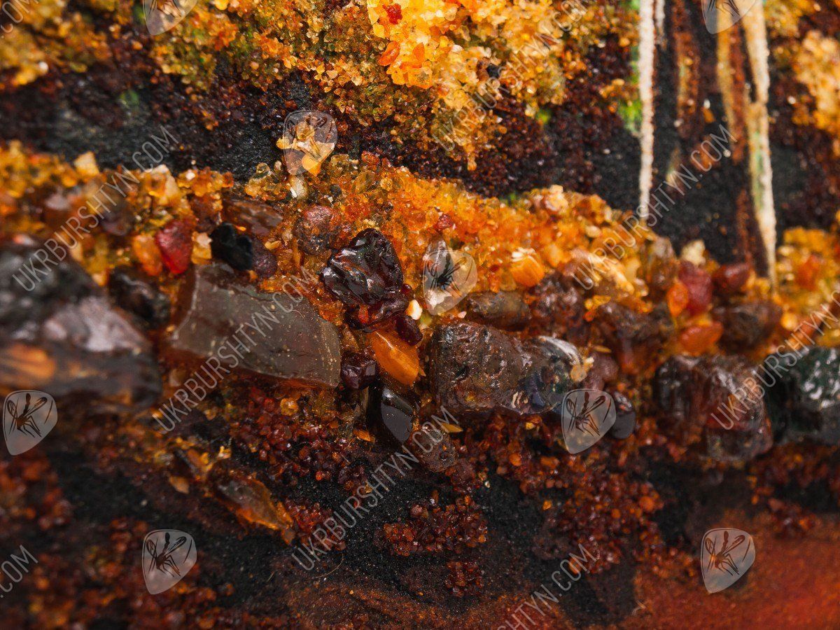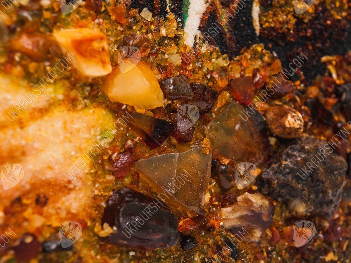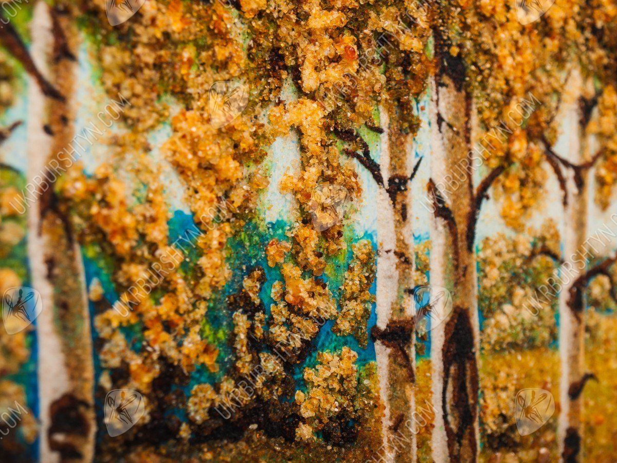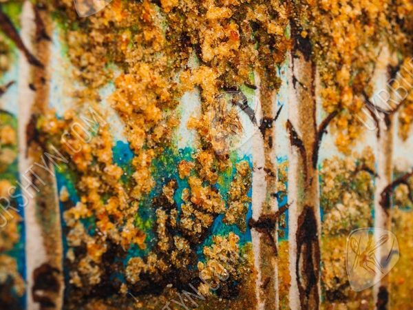 Картина изображает березовую рощу на берегу извилистой реки в летний солнечный день. Она насыщена яркими красками, переливающимися из зеленого, голубого в золотой. Сочная гамма цветов использована для того, чтобы подчеркнуть очарование березового леса и ковра из листвы. Невозможно поверить, но всю гамму оттенков картины смог передать янтарь, который украшает все изображение. Березовая роща воплощает образ русской природы, такой милой и родной. Картина поднимет настроение, и даст возможность прикоснуться к прекрасному.