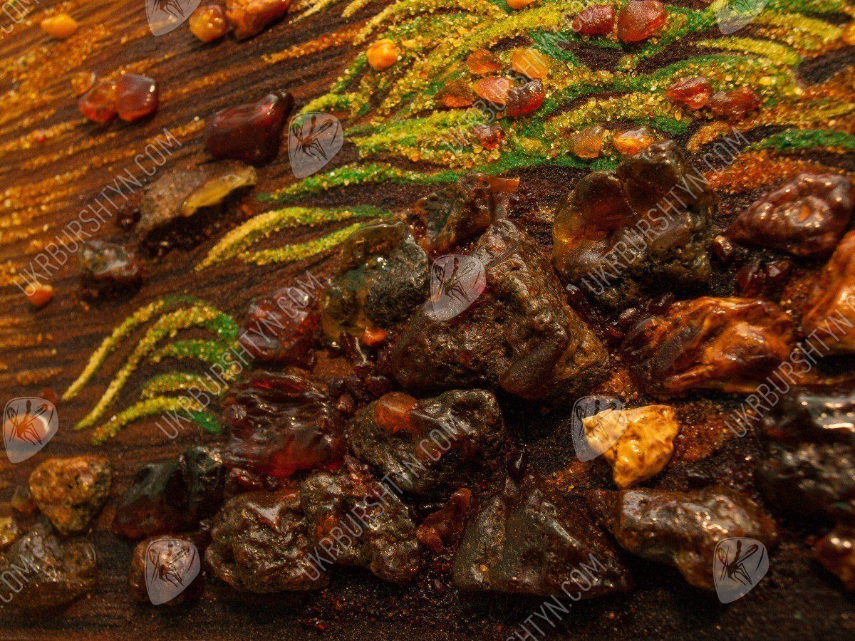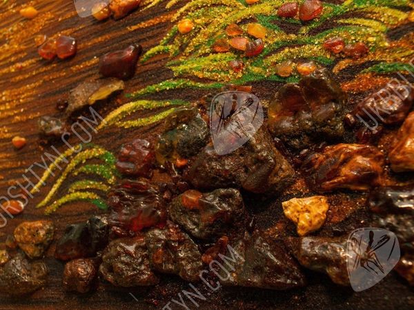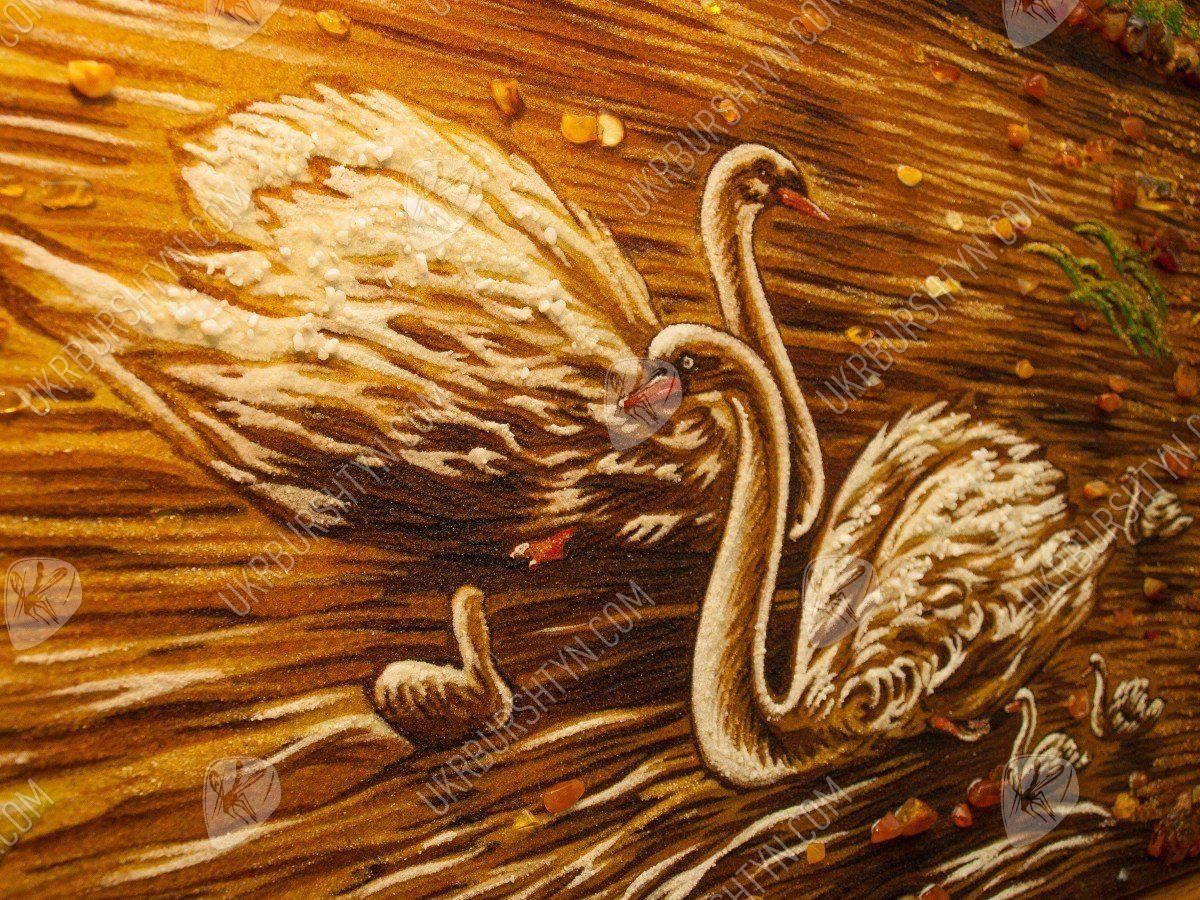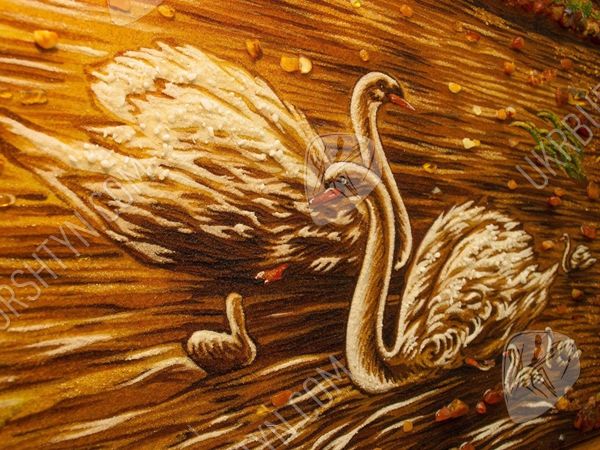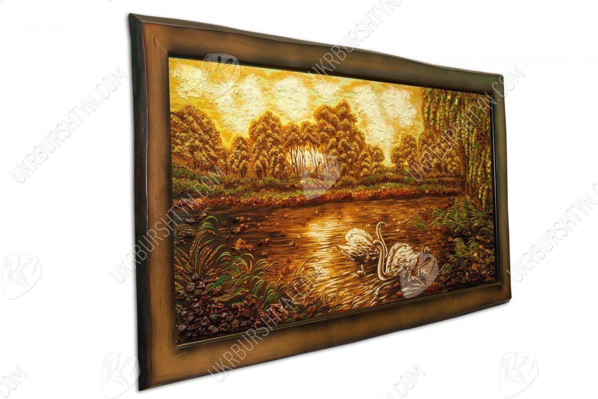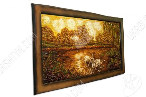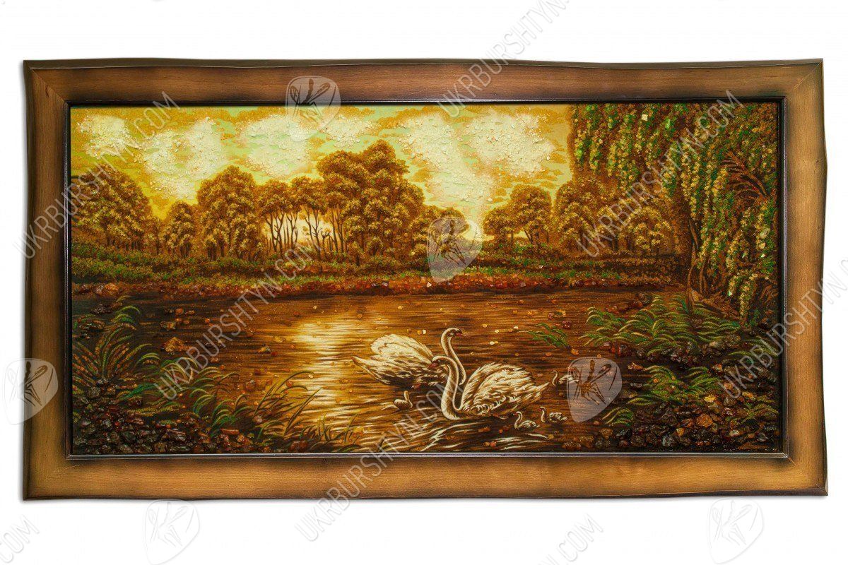 Пейзаж «Лебединое семейство на лесном пруду» соткан из теплых сочных тонов желтого, бежевого и светло-фиолетового цветов, усыпан янтарной крошкой и камнями. Представленный шедевр – картину из янтаря – можно подарить любимому человеку на венчание, ко Дню рождения, к юбилею свадьбы или по случаю другого знаменательного события в жизни.