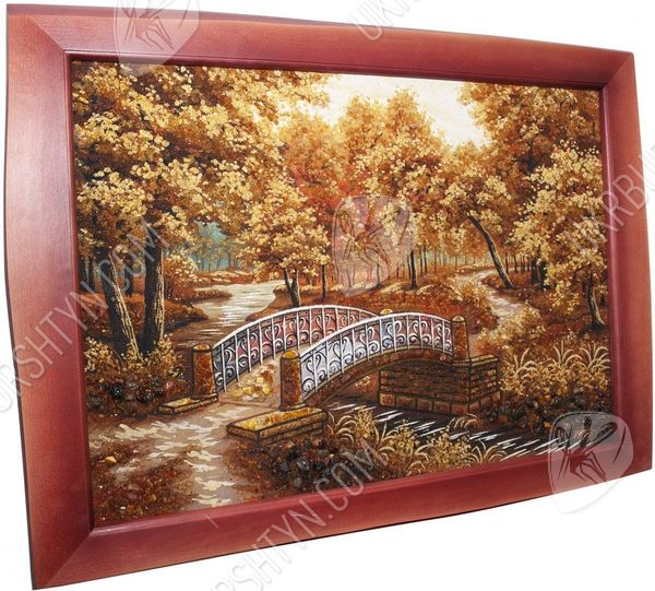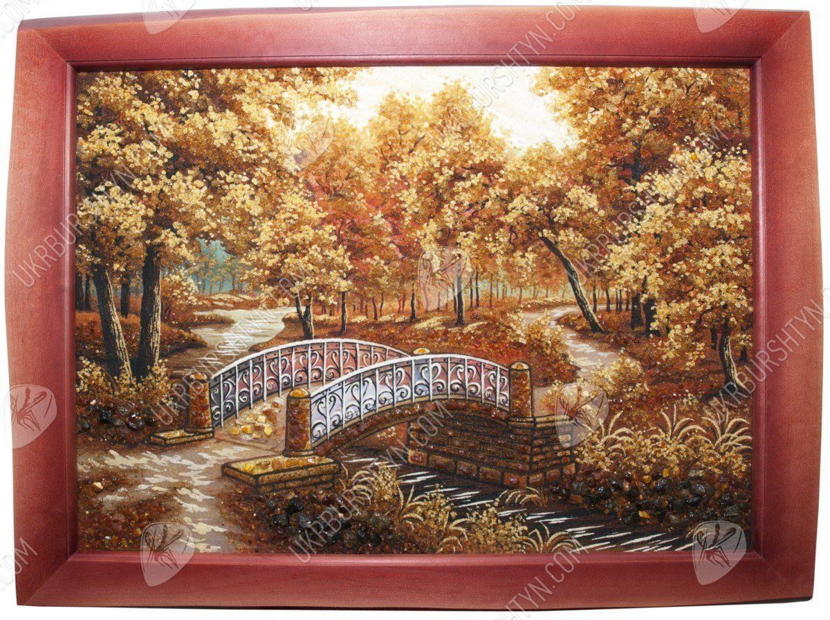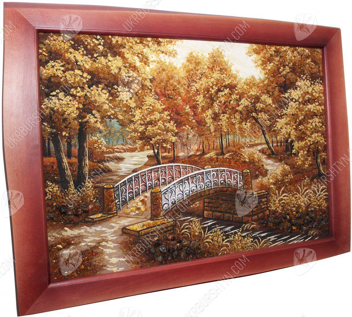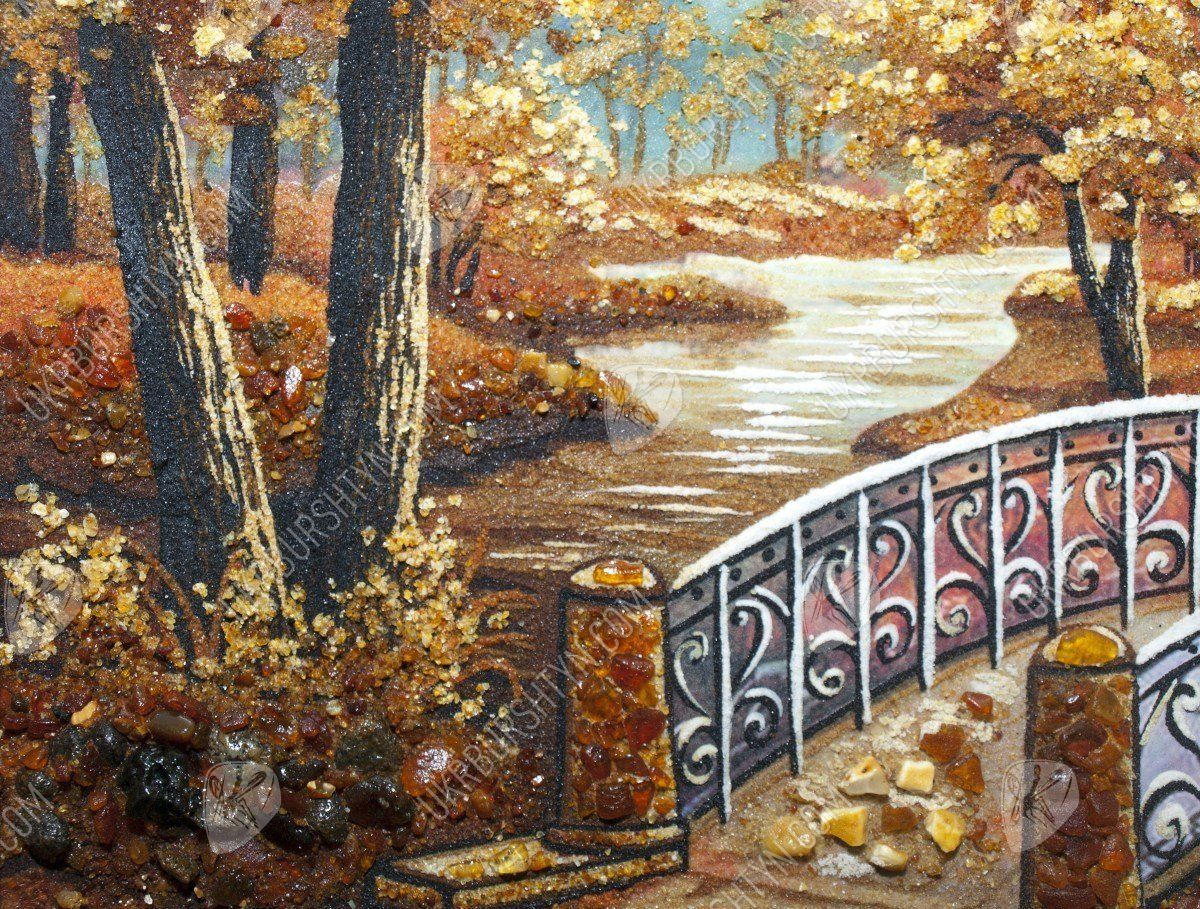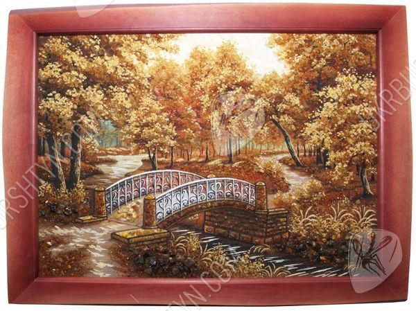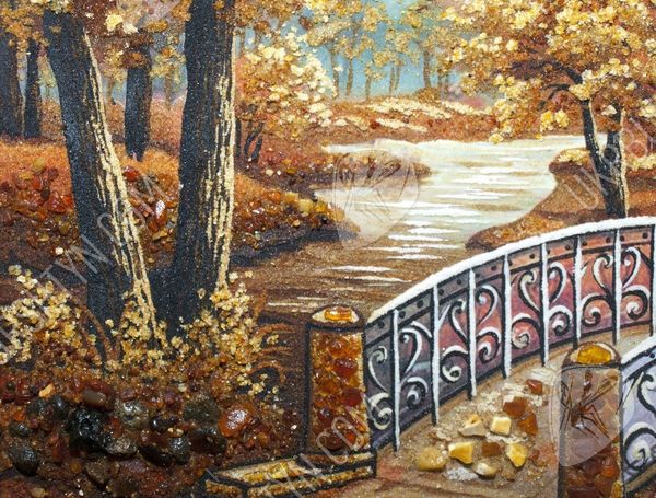 Осенний парк с ручейком, протекающим сквозь него и небольшим, но изящным мостиком в центре. Огненно-желтые деревья говорят о том, что осень в самом разгаре. Мостик по теории Фен-Шуй – прекрасный, положительный символ. Он означает переход из одной стадии в другую, начало перемен. Поэтому если вы хотите, чтобы в вашей жизни произошли перемены, какое-либо дело сдвинулось с мертвой точки, обязательно купите картину с мостом! Янтарный пейзаж, изображающий мост в парке, усыпанный янтарем удачный сюжет для дома. Он идеально впишется в любой интерьер и, благодаря теплым краскам, привнесет уют в помещение.