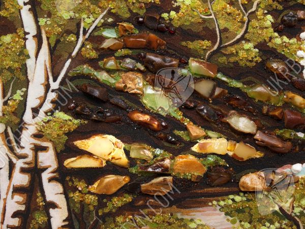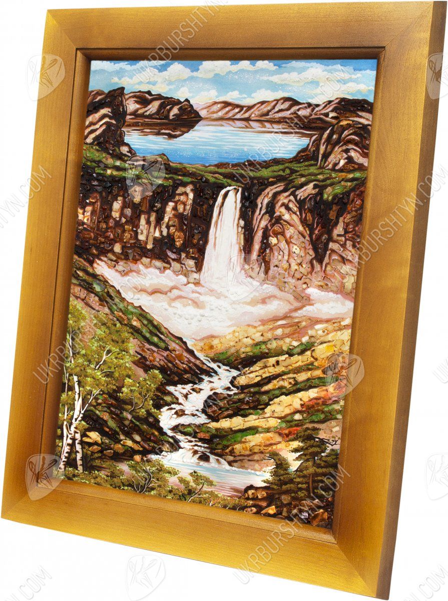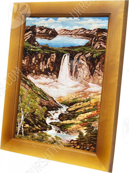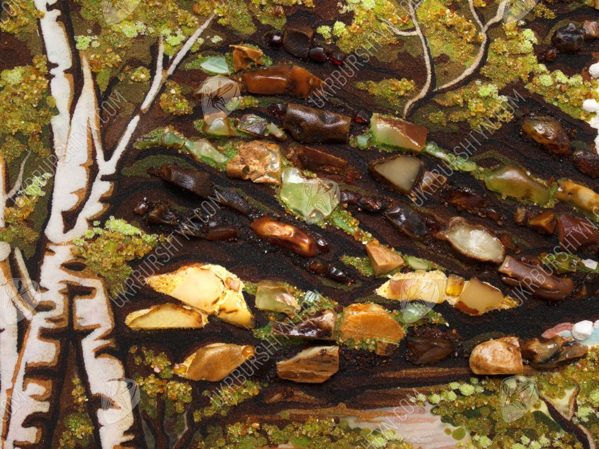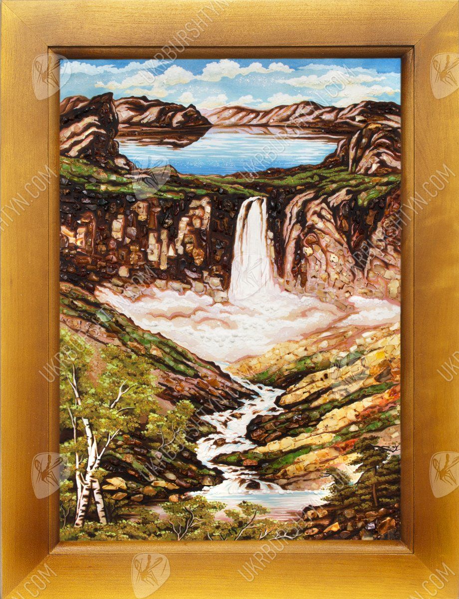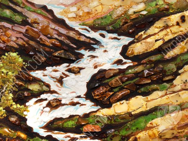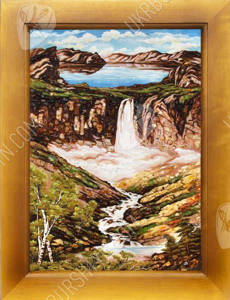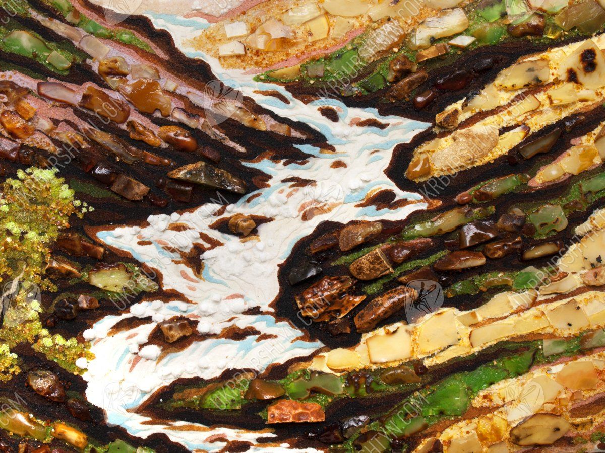 Мастер создал завораживающий горный пейзаж из цельных полесских самоцветов и мелкой каменной крошки. Отвесные склоны, по которым струятся небольшие водопады, ложбинки, где клубится туман, чистое, бескрайнее небо, отражающееся в горном озере, миниатюрные деревца, мох и лишайник на переднем плане и неприступные вершины на горизонте – чего только нет на этом изображении! А чтобы рассмотреть его более детально, Вам понадобится всего лишь купить картину в интернет-магазине.
