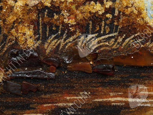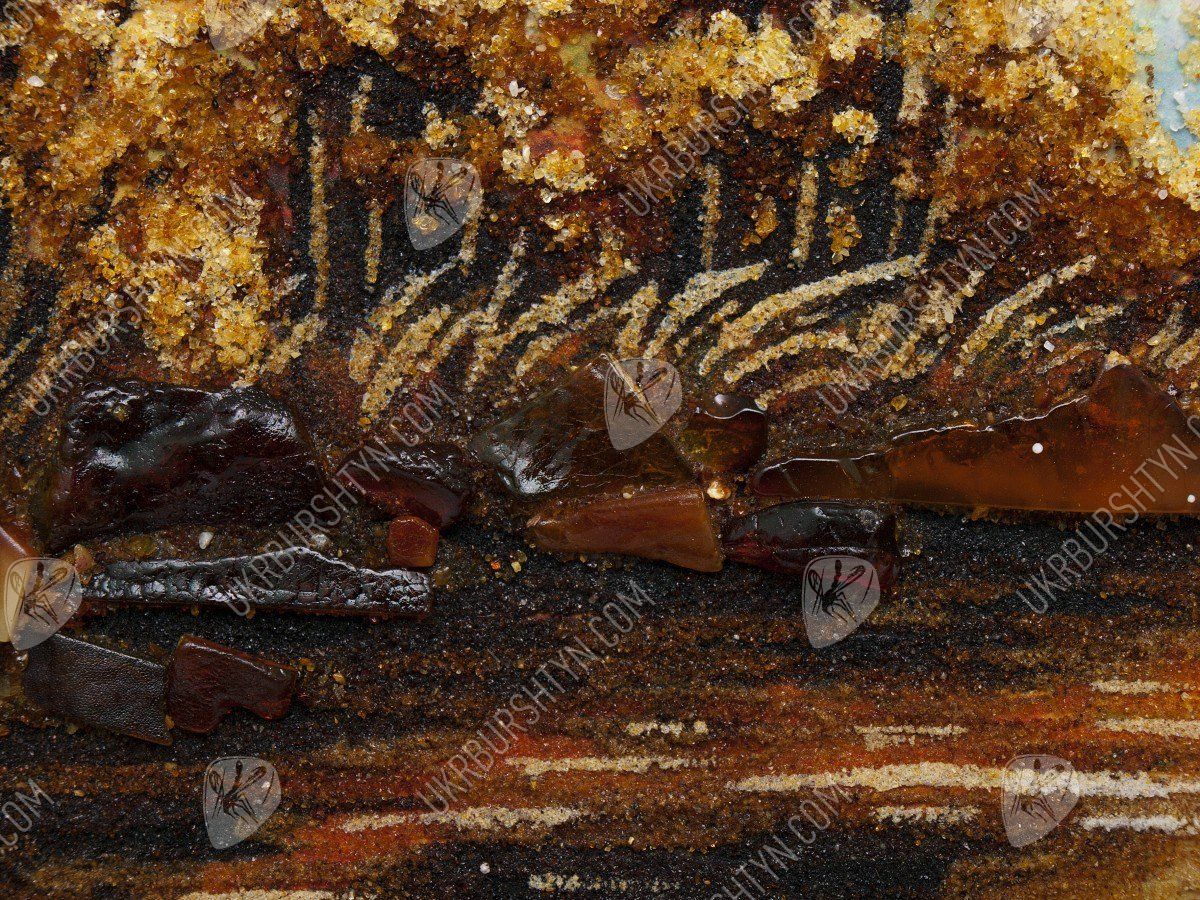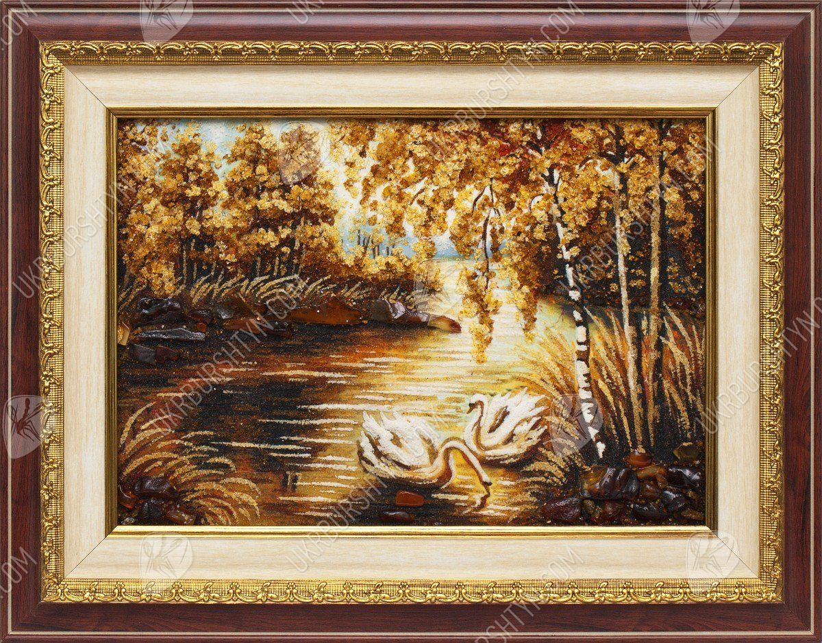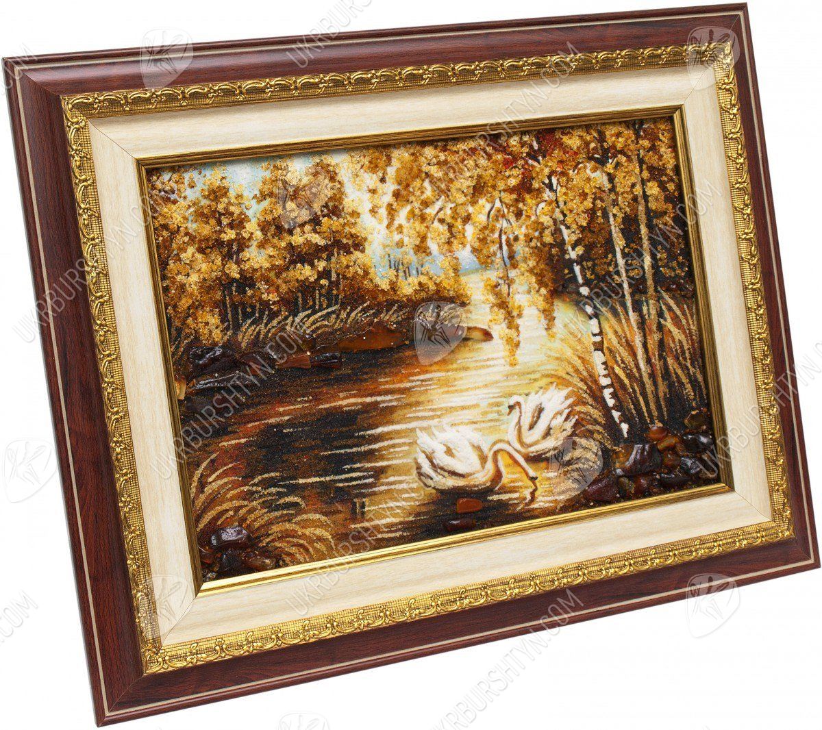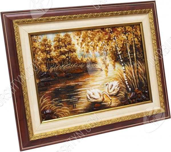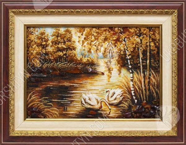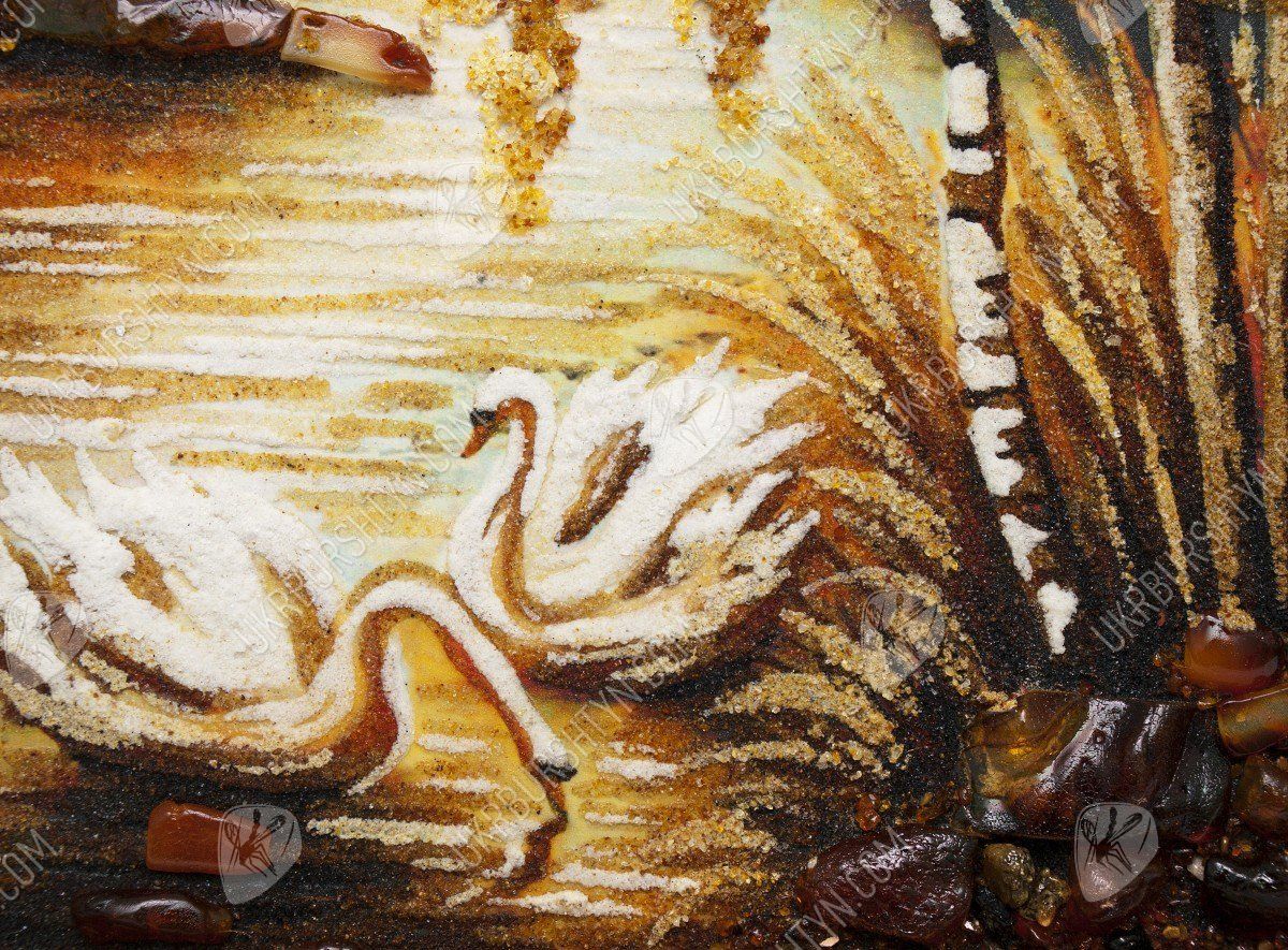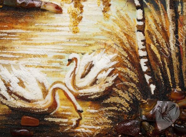 Каждая деталь картины усыпана крошкой и крупными камнями разных размеров. Янтарь придает всей композиции оригинальности и необычности. Над каждым таким пейзажем мастер работает вручную, делая его неповторимым. Изящность картины подчеркивает деревянная лакированная рамка с мелким узором.