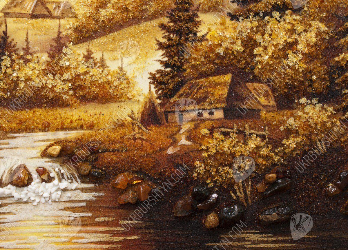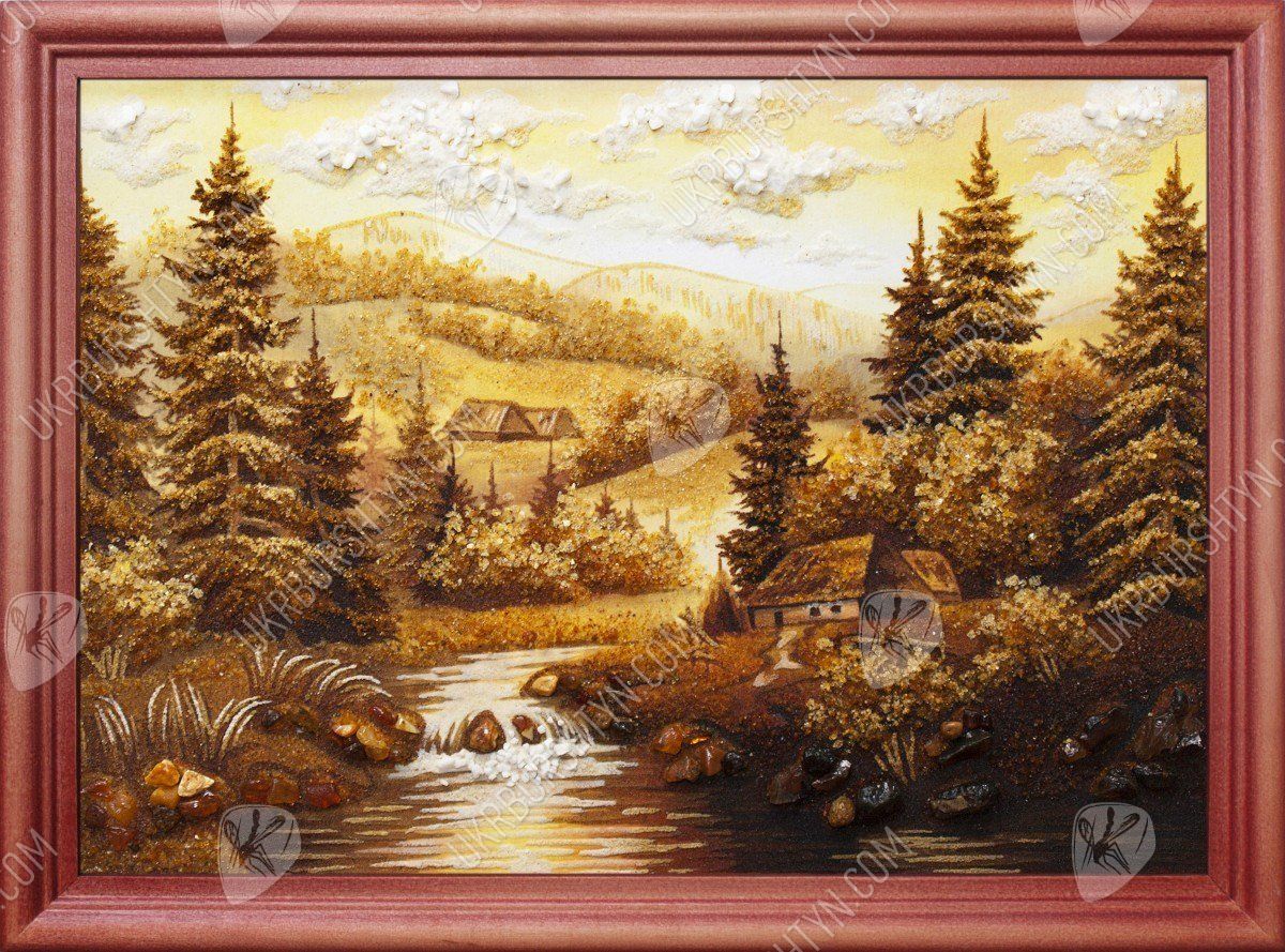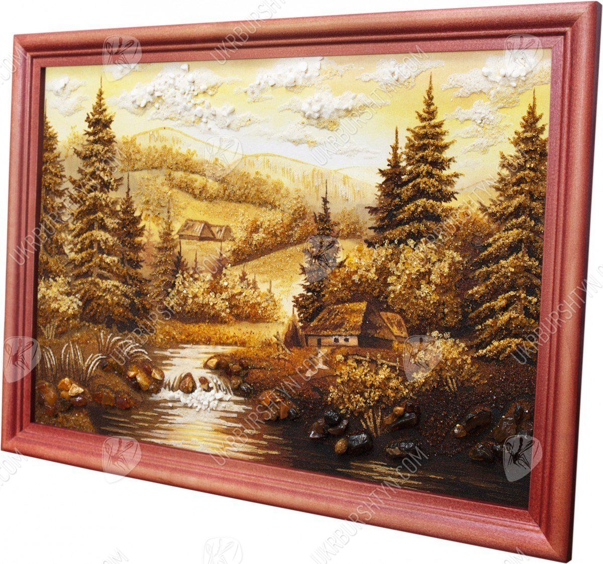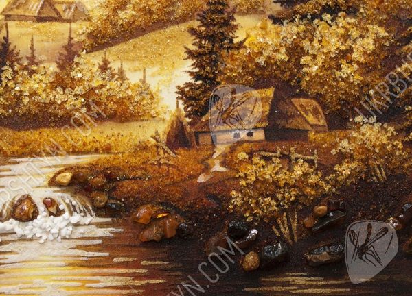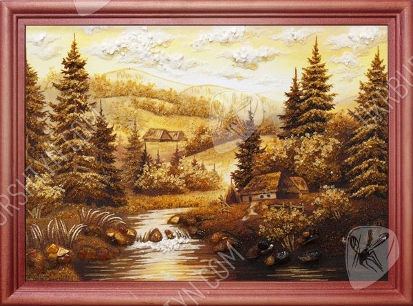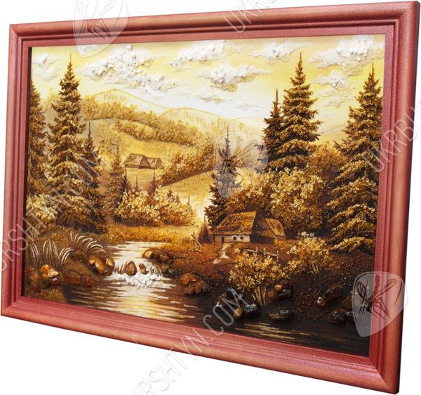 Если вы ищете хороший подарок на новоселье или другое торжественное событие, картина «Горный пейзаж» станет отличным выбором. На ней запечатлены далекие горы и низина, покрытая сосновым лесом, горный ручей и маленький уютный домик на его берегу. Для обрамления используется декоративная рамка из дерева. Покупатель может выбрать как маленькую, так и большую картину по своему желанию. Она будет изготовлена мастером вручную. Для каждой картины используются разные камни, поэтому всегда создается неповторимый пейзаж. Помимо камней, также применяется крошка – тот же янтарь, но в измельченном виде.
