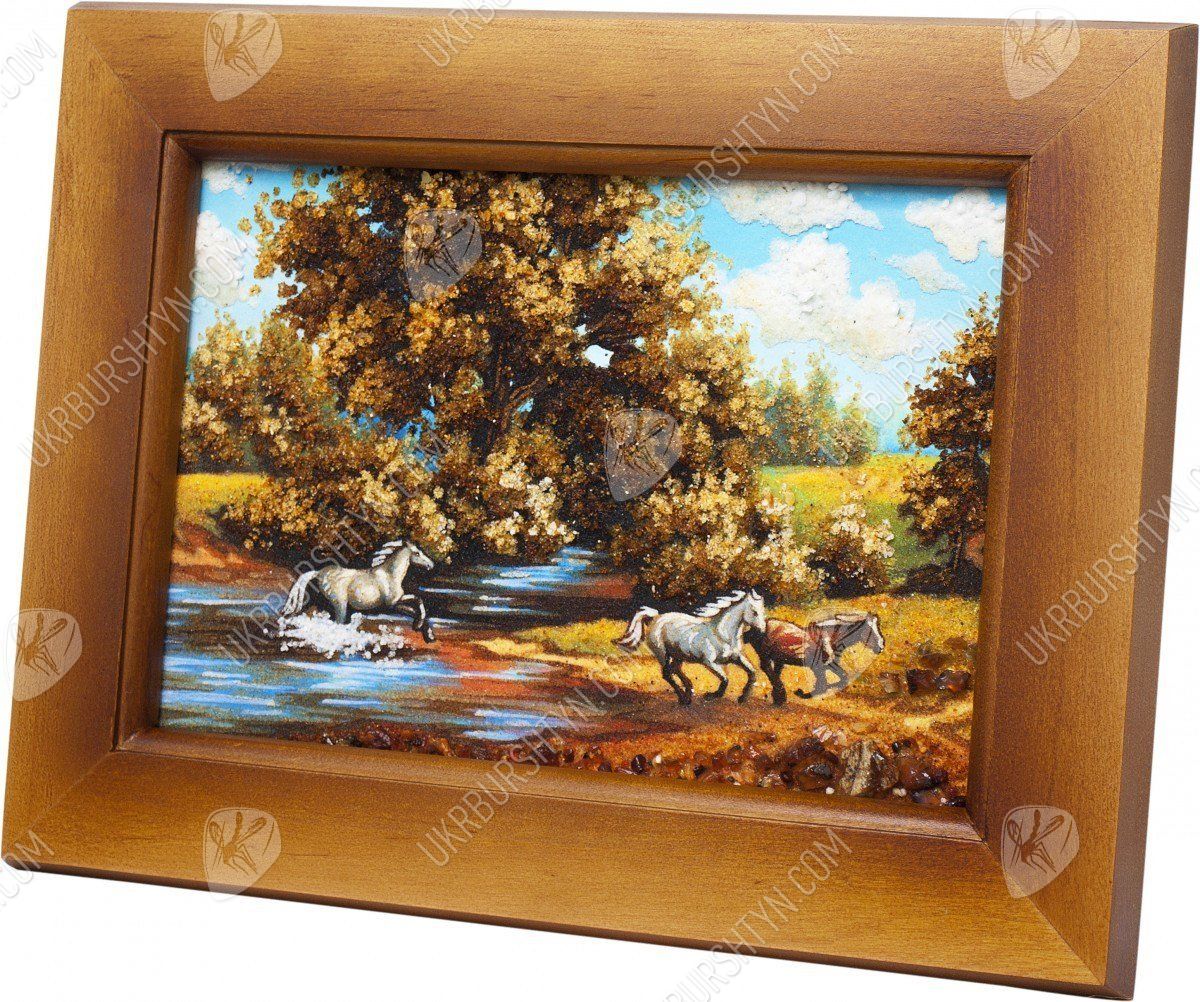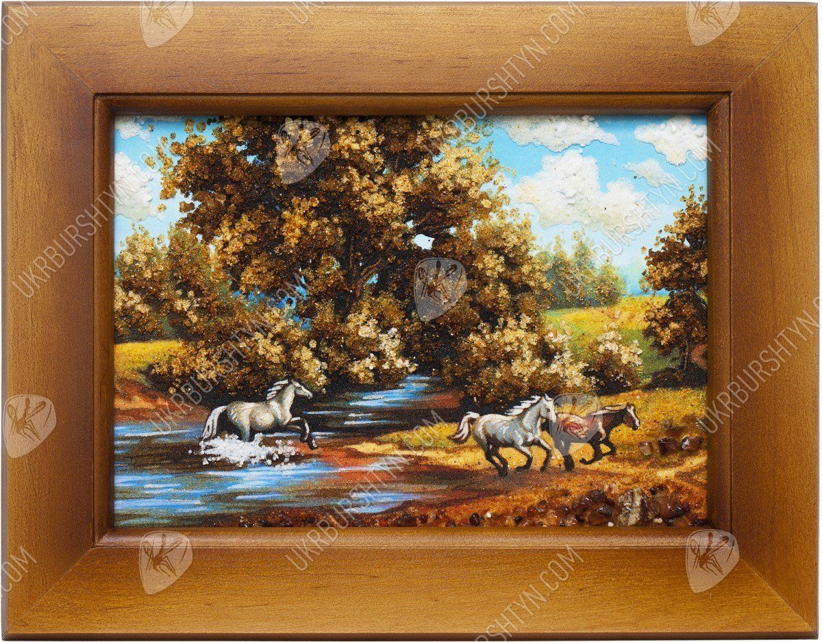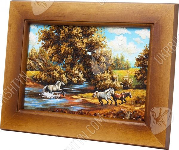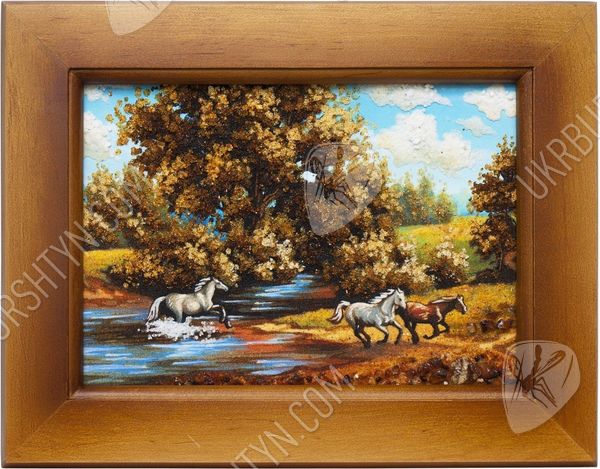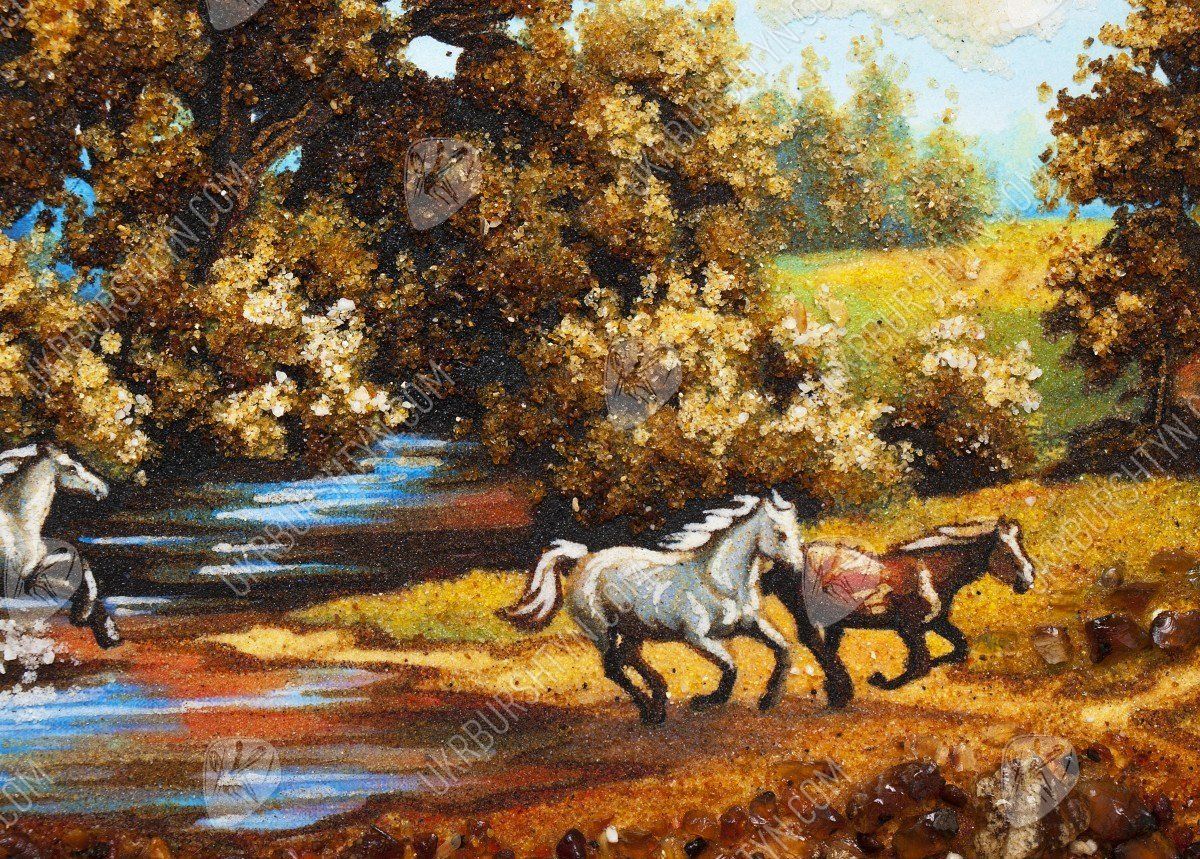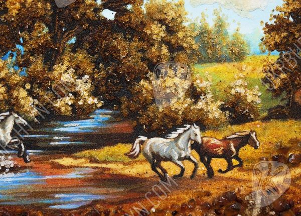 Все просто и одновременно очень красиво. Кажется, что любовь заняла все мысли, прижимающихся лошадей. Эта картина наполнена нежностью и любовью. Ее смело можно повесить в спальне, над кроватью. Это очень красивое панно было изготовлено из красивого и загадочного янтаря. С древних времен, янтарь был наделен магическими свойствами, он считался оберегом дома. Янтарные изделия часто дарили молодоженам на свадьбу. Талантливо нарисованная картина может стать в будущем ценностью, которое передается по наследству. За долгие годы картина не потеряет своей яркости и красочности. Чтобы приобрести такую янтарную картину нужно просто положить ее в корзину.