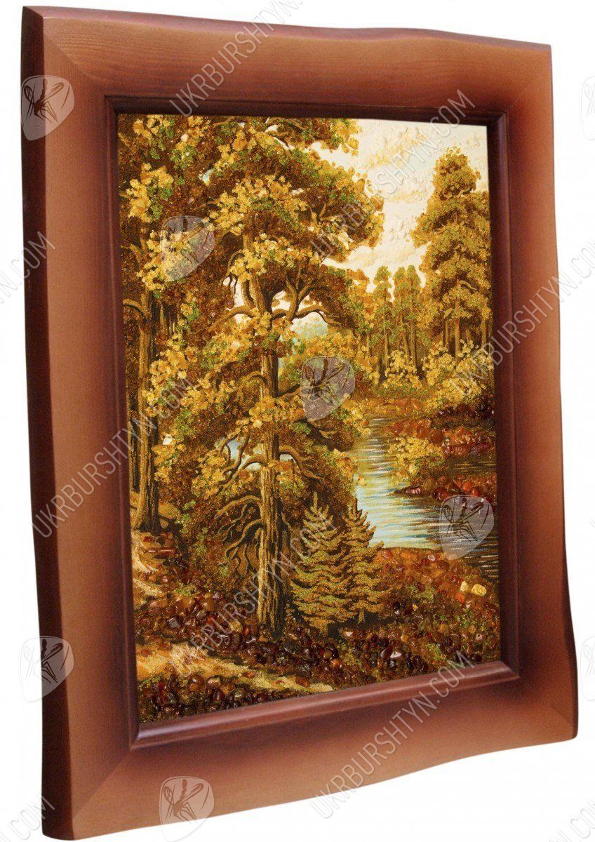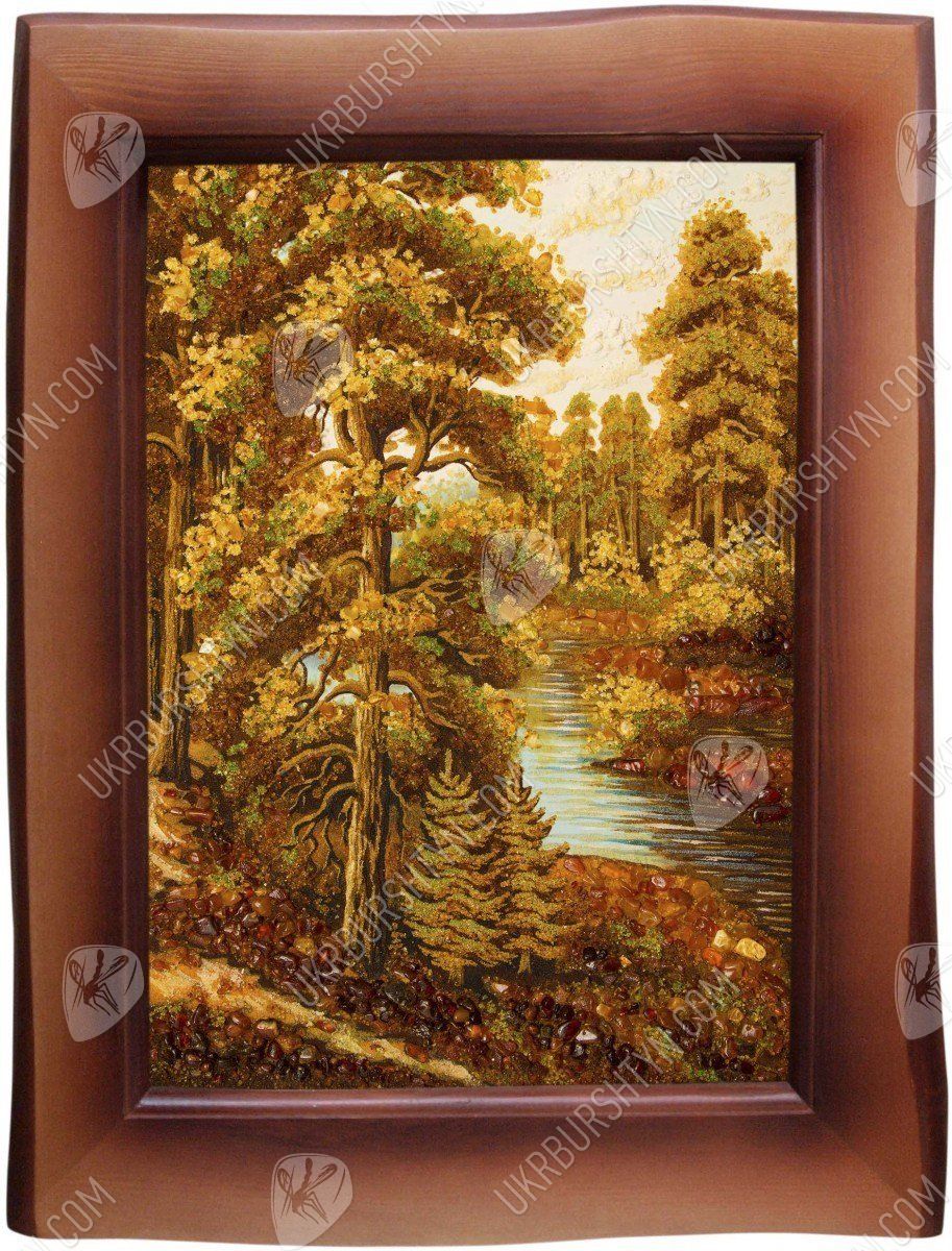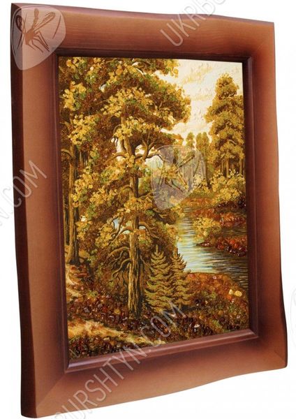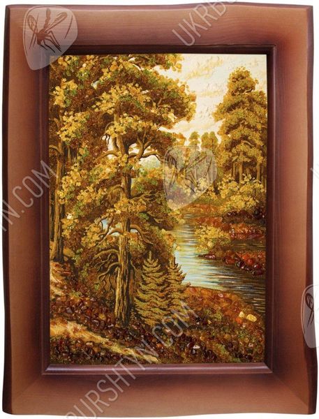 Желаете украсить свой дом панно? Наш интернет магазин картин для интерьера поможет подобрать произведения схожего размера, цветовой гаммы и тематики. А основой для коллекции может послужить эта работа. Бежевая, шафрановая и терракотовая янтарная крошка использована для передачи густой, освещённой полуденным солнцем хвои старых сосен. Из более тёмных самоцветов выложены узловатые стволы деревьев и глубокие тени у их корней. А россыпь светло-жёлтых и золотистых драгоценных камней имитирует игру света на поверхности спокойной лесной реки. Благодаря такому разнообразию тонов, а также тщательности, с которой выполнено изображение, оно непременно станет центральным элементом декора!