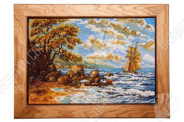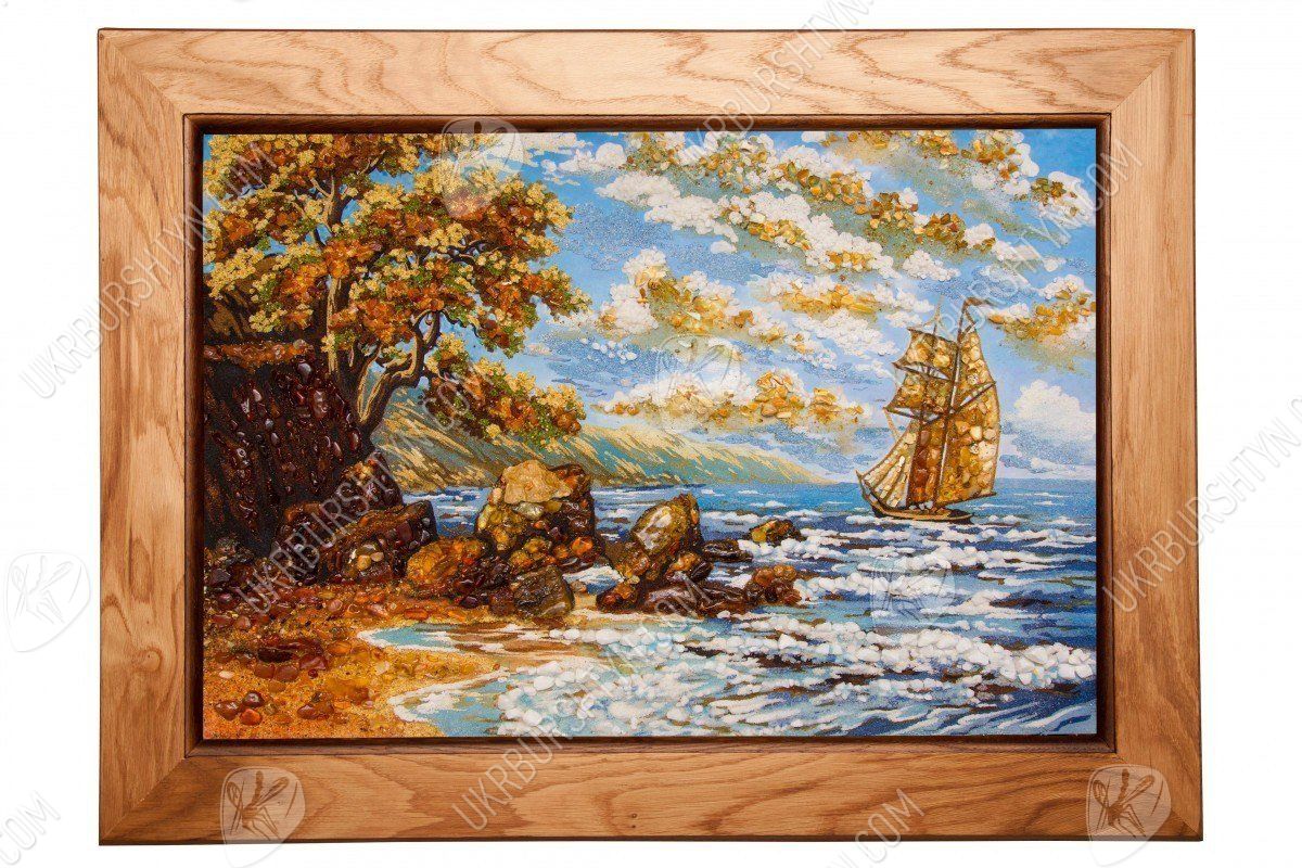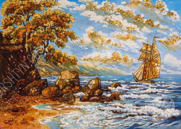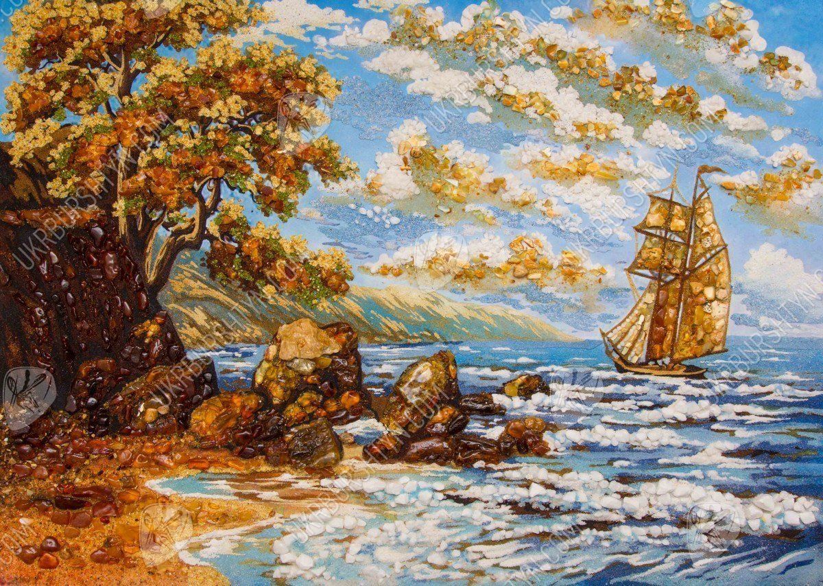 Пейзаж «Парусник» живописно высыпан янтарной крошкой и выложен самоцветами, напоминая о том, что человек рожден для мечты, для полета, для счастья! Картины природы всегда красочны, органичны и колоритны, их можно без труда заказать или купить в нашем интернет-магазине.