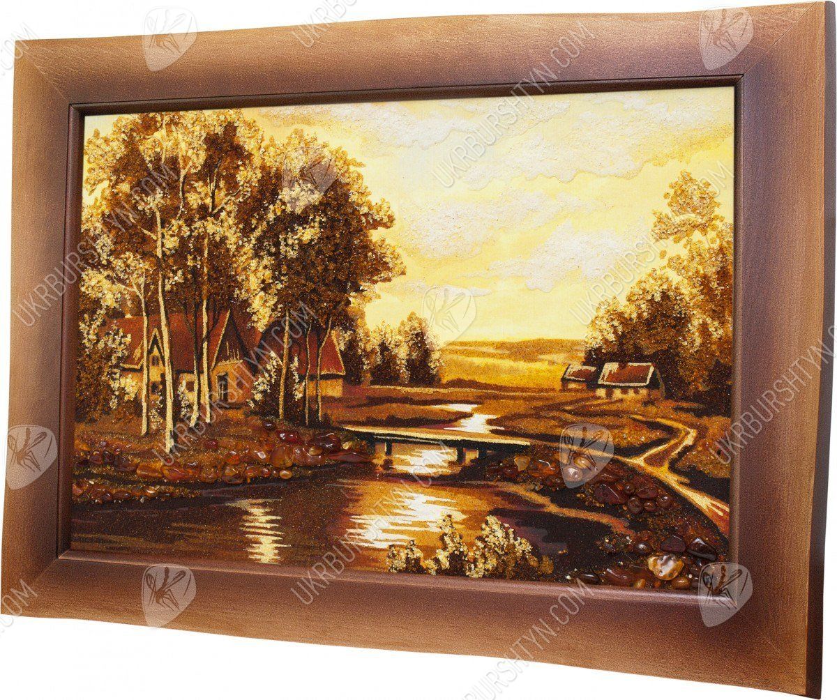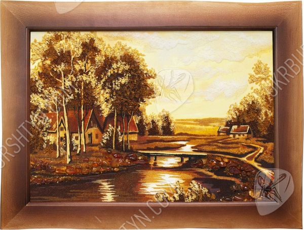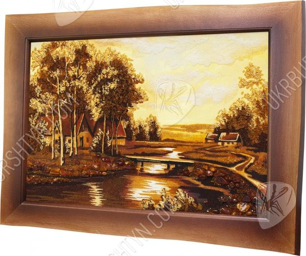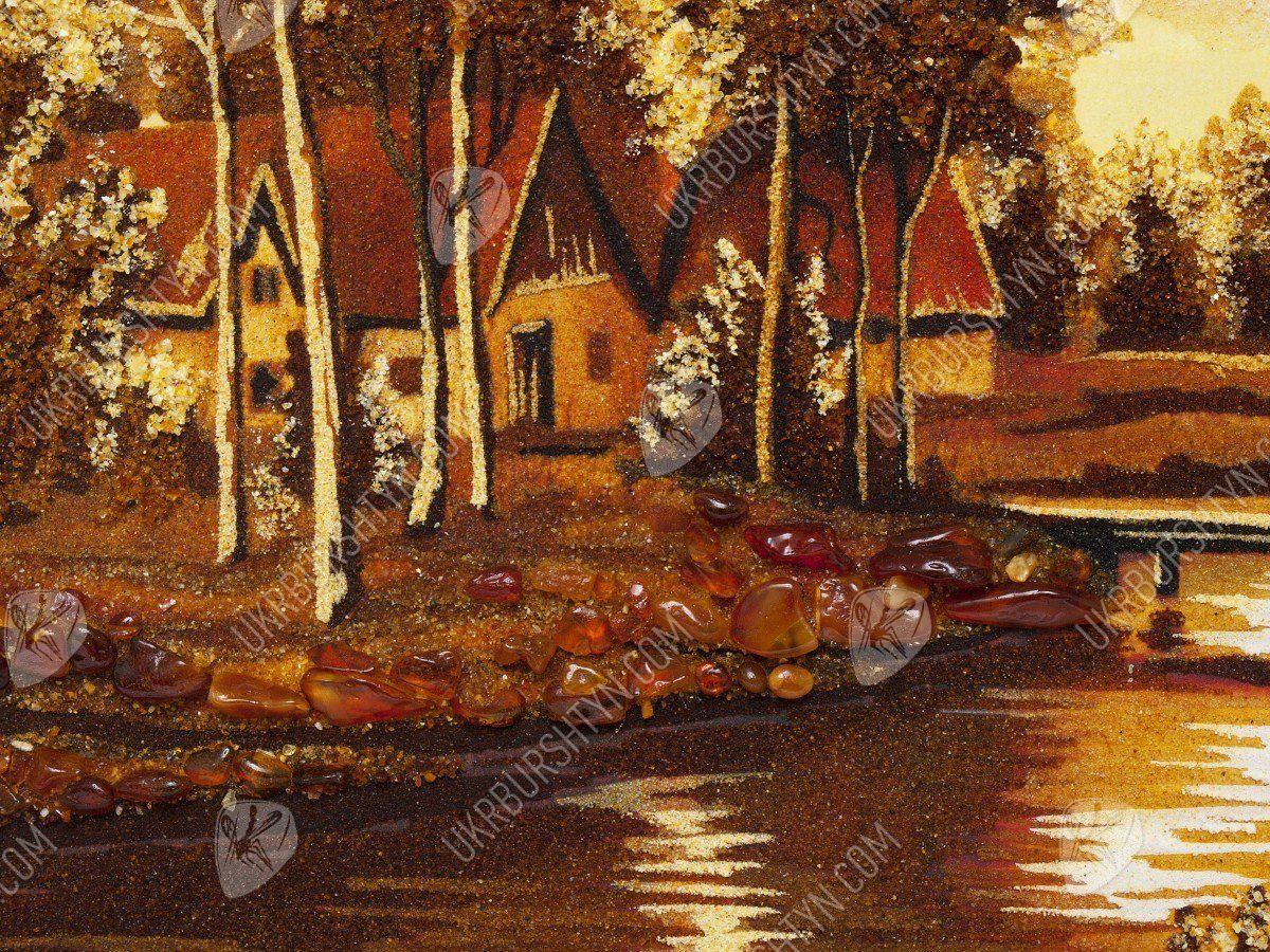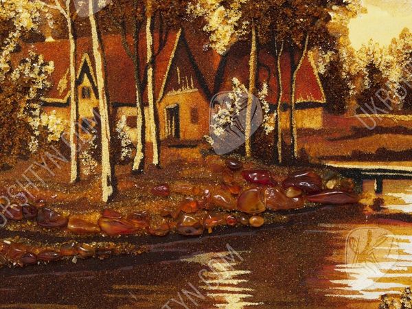 «Загородный пейзаж» изображает маленькую деревушку на опушке леса возле реки. При взгляде на эту картину легко представить такое уютное тихое место, где приятно отдохнуть от городской суеты. И если выбраться на природу не всегда хватает времени, загородный пейзаж поможет расслабиться и улучшить настроение даже в городской квартире. Янтарь – камень, положительно воздействующий на нервную систему. Такая картина – удачный подарок мужчине, женщине, друзьям, кому угодно. Для инкрустации используется только лучший украинский янтарь, добываемый на Полесья. Мастера отбирают для работы ровные камни с красивыми глубокими оттенками, придающими картине объемность.