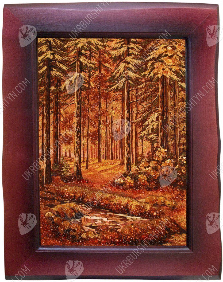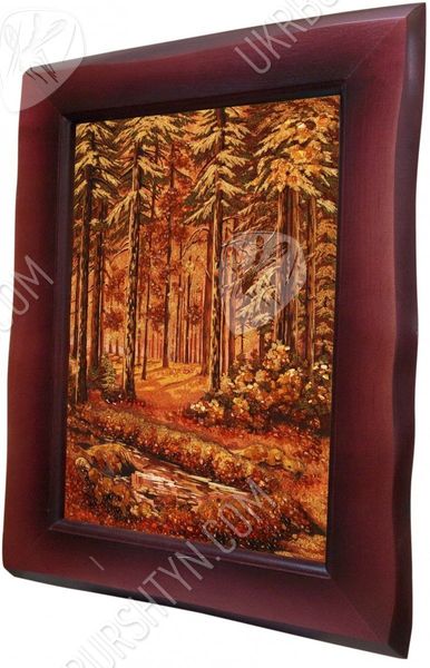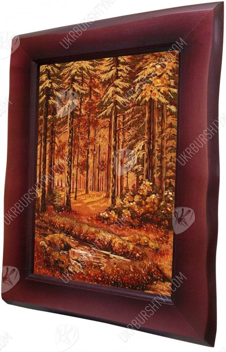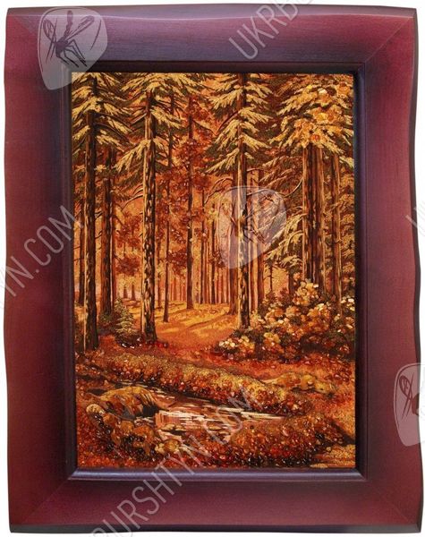Сосновый бор всегда пронизан светом, теплом, терпким запахом хвои. Кажется, будто величественные деревья достают до облаков – настолько они высоки и стройны. А теперь Вы можете купить пейзаж, который в точности воспроизводит колорит и атмосферу подобного места. То, что в работе использован полесский янтарь, только усиливает её реалистичность и достоверность. Из цельных золотистых, рыжеватых, коньячных и оранжевых самоцветов выложены берега небольшого озерца на переднем плане, залежи валежника, кусты и валуны у корней. А для изображения более мелких деталей мастер применил разноцветную каменную крошку – благодаря ей поверхность изображения переливается мириадами сверкающих искорок.