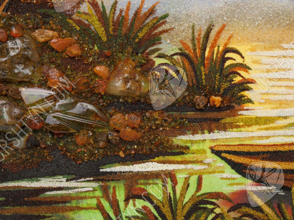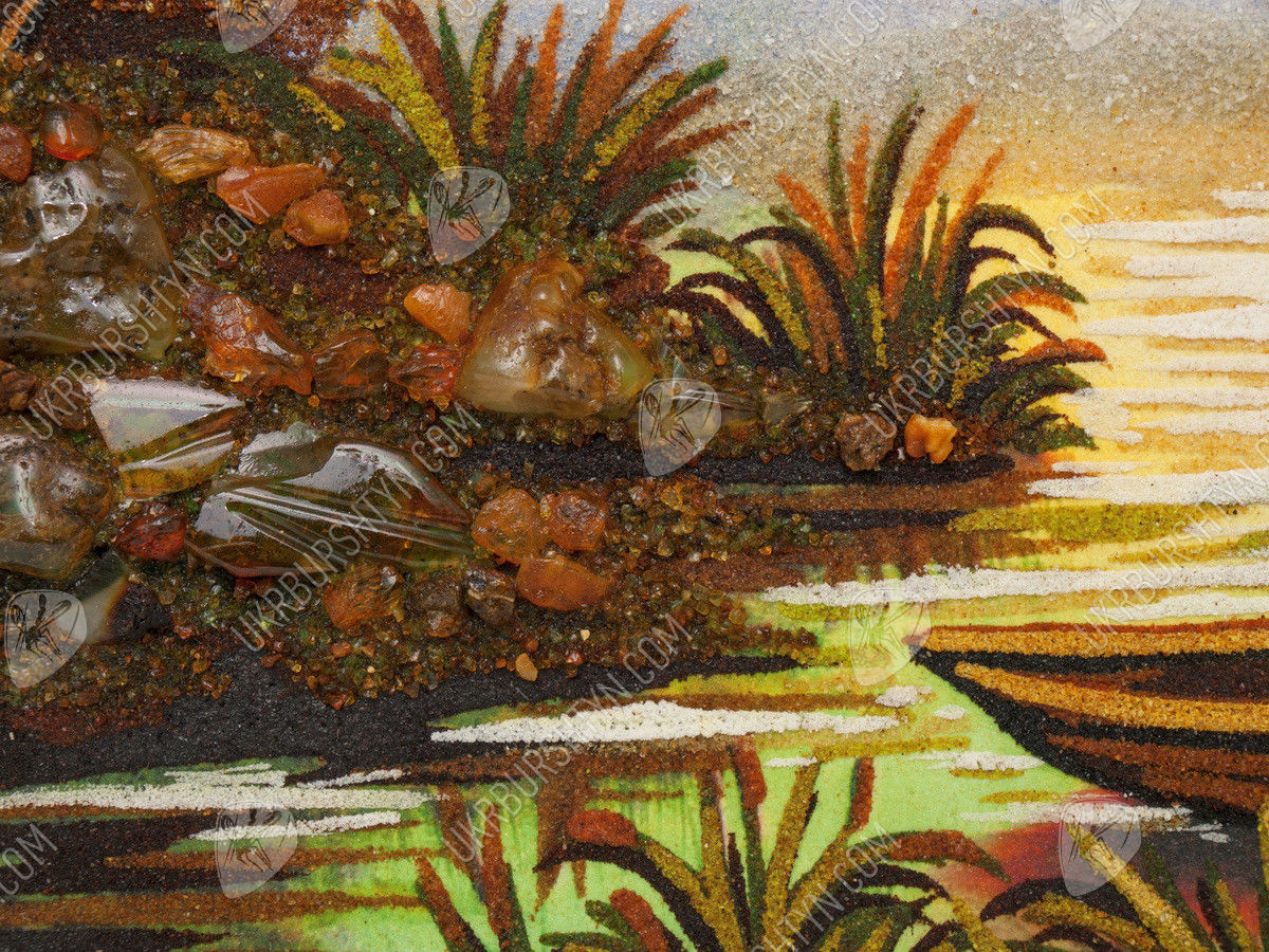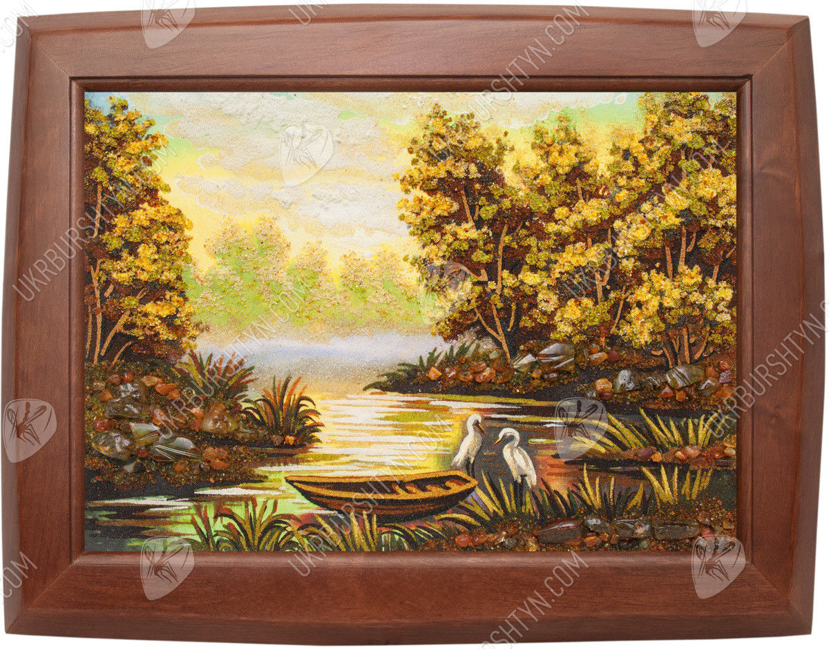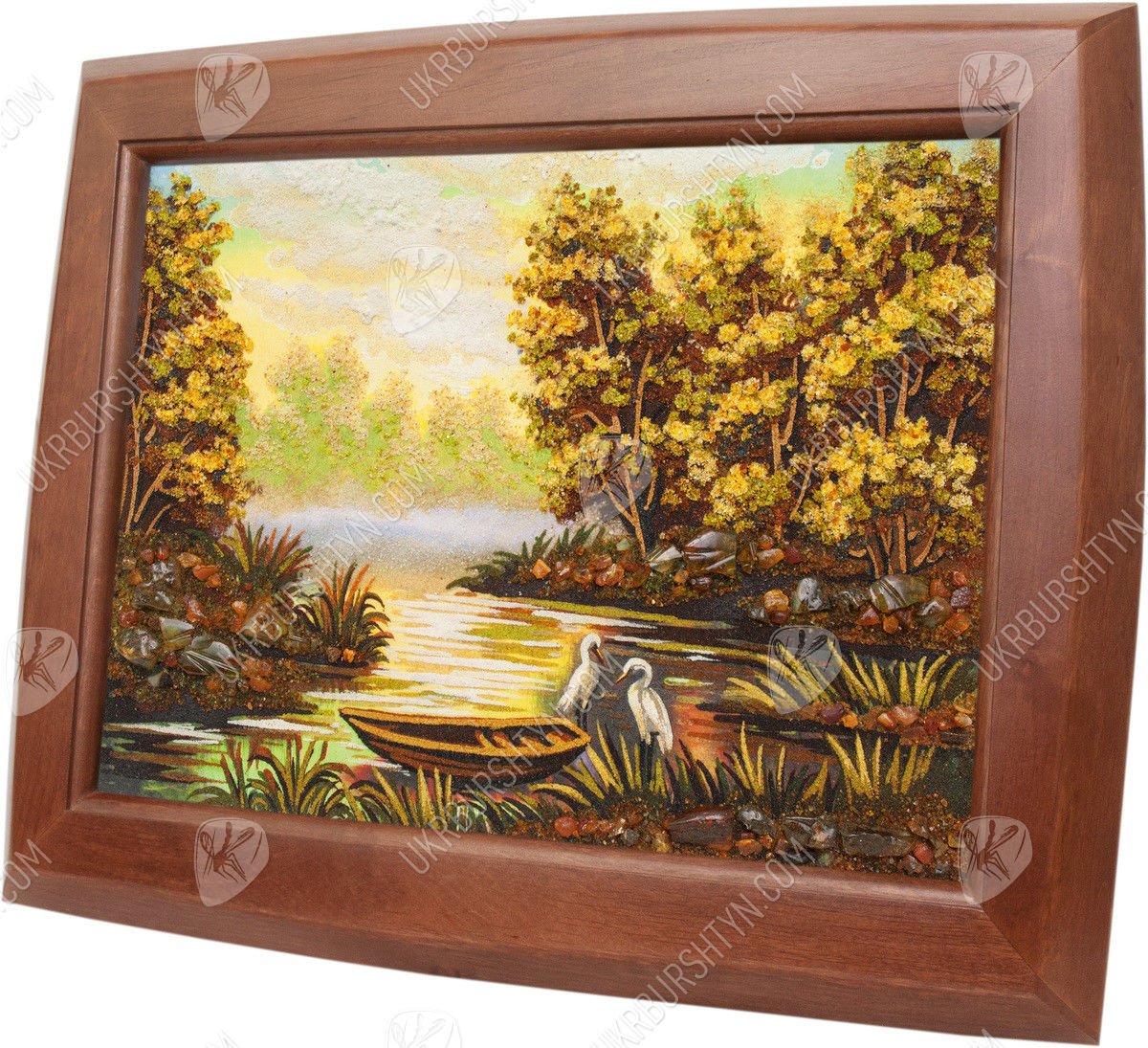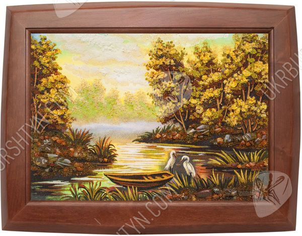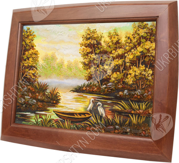 Близким людям хочется дарить только интересные и оригинальные подарки. В Киеве и других больших городах Украины придется хорошо потрудиться, чтобы найти нужную вещь. Но интернет-магазин «Янтарь Полесья» поможет вам выбрать презент, не выходя из дома. Авторская картина «Цапли» – это теплый летний пейзаж, на котором яркая зеленая листва покрыта светом закатного солнца. В вечерних лучах возле деревянной лодки греются две изящные птицы. Изображение наполнено уютом и свежестью. Опытные мастера дополнили его мелкими камушками светло-оранжевого янтаря, который игриво переливается на солнце. Картина станет прекрасным подарком лучшему другу или любимой маме, но также вполне сможет украсить интерьер и вашего дома.