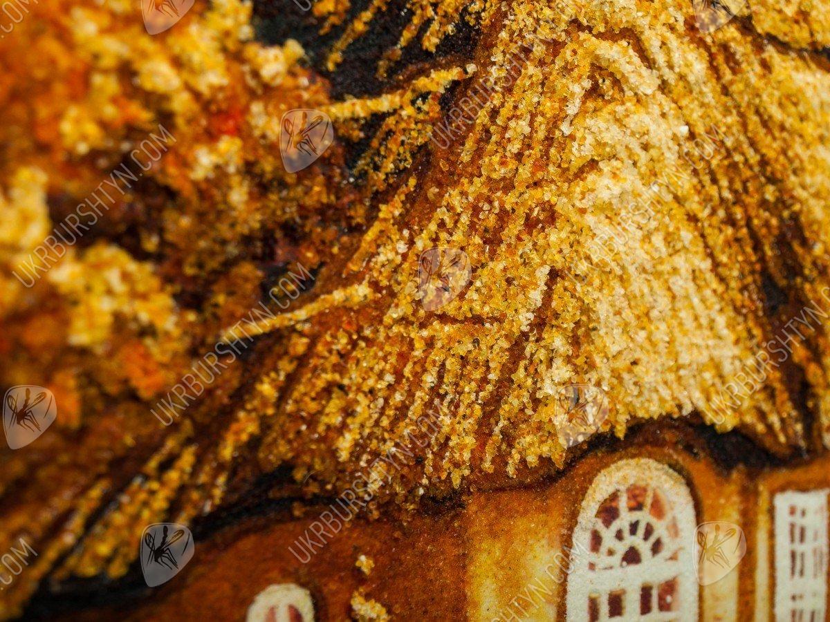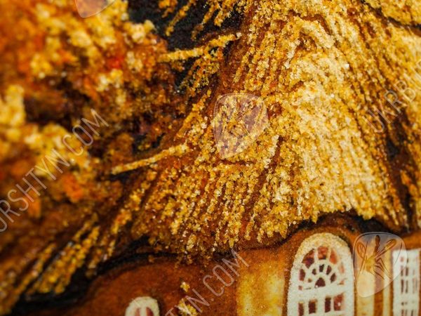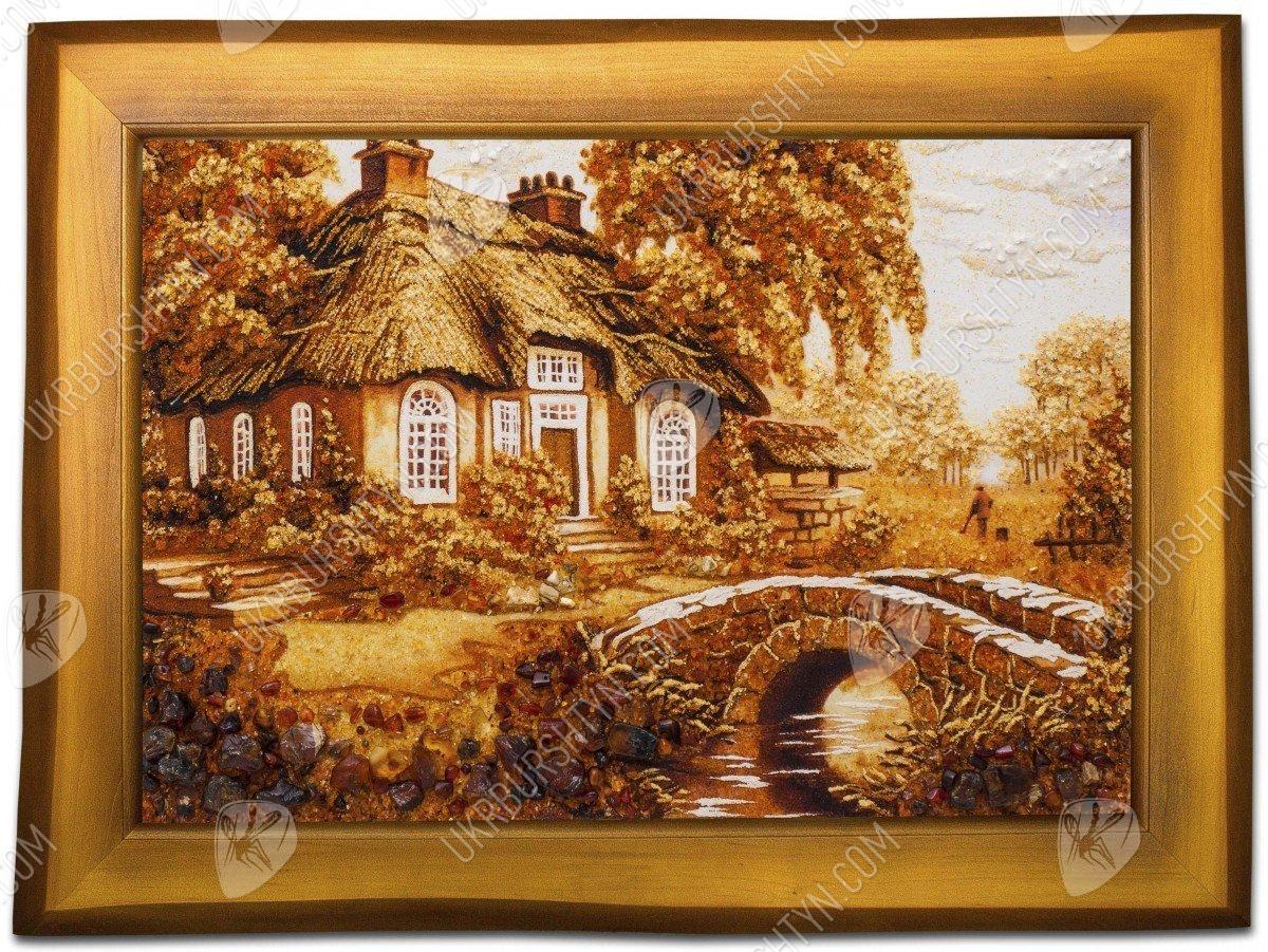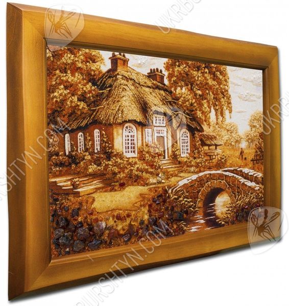 Бракосочетание Ваших друзей или близких родственников – отличный шанс подобрать оригинальные подарки на свадьбу, которые порадуют молодожёнов и помогут им обустроить совместный быт. Именно таково это авторское панно ручной работы. Используя золотистый, коричневатый, бежевый и шафрановый полесский янтарь, мастер изобразил уютную сельскую часовенку под соломенной крышей. Домик обсажен пышными розами, плющом и яблоньками, а ведущий к нему арочный мостик весь порос повиликой и вьюнком. Россыпь цельных самоцветов на переднем плане произведения придала ему реалистичность и объём. От картины так и веет уютом, теплом, добротой и тихой радостью – и те же чувства она привнесёт в дом молодой семьи!