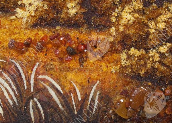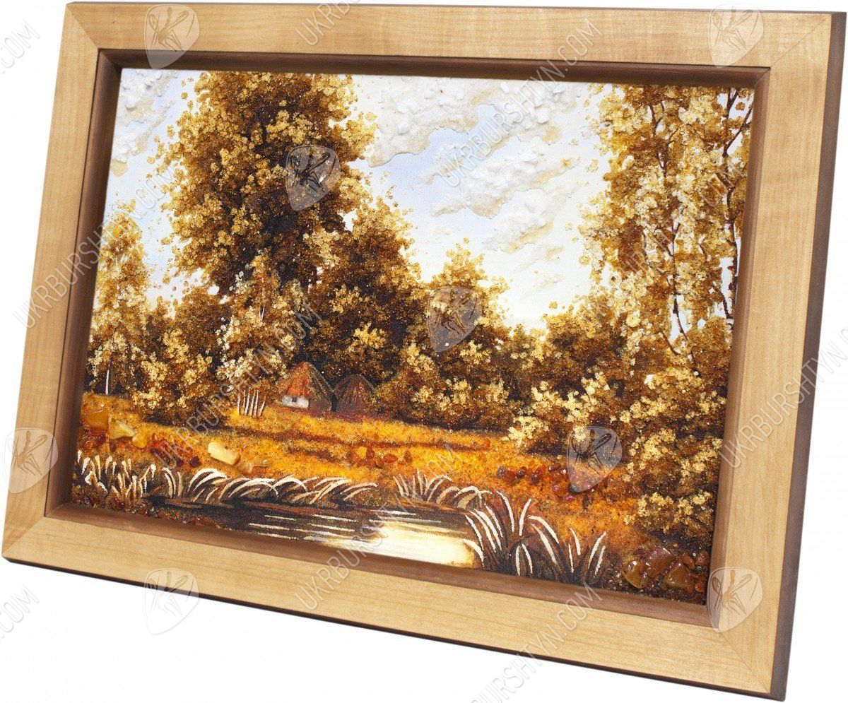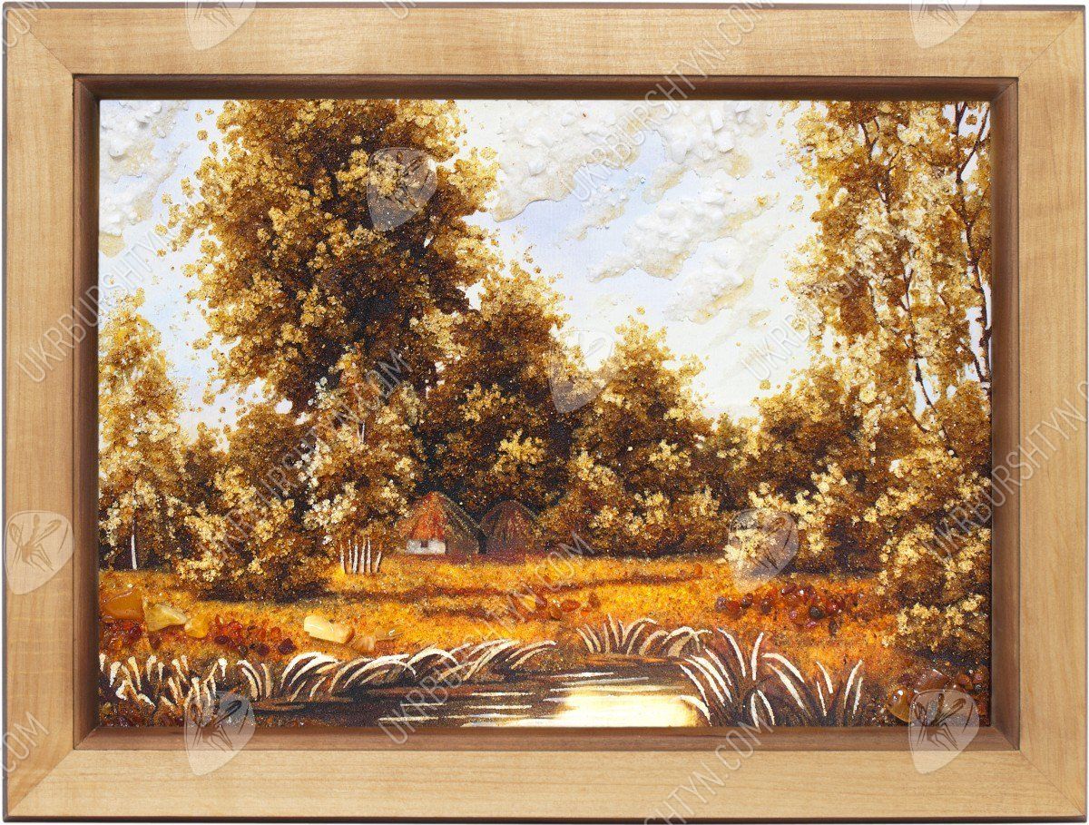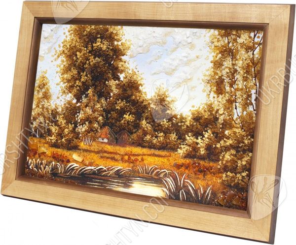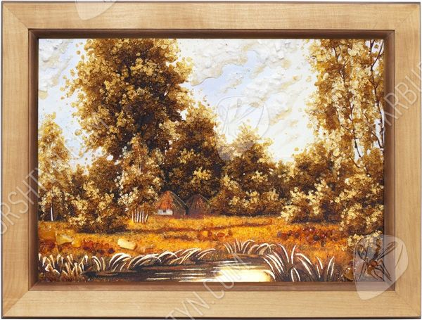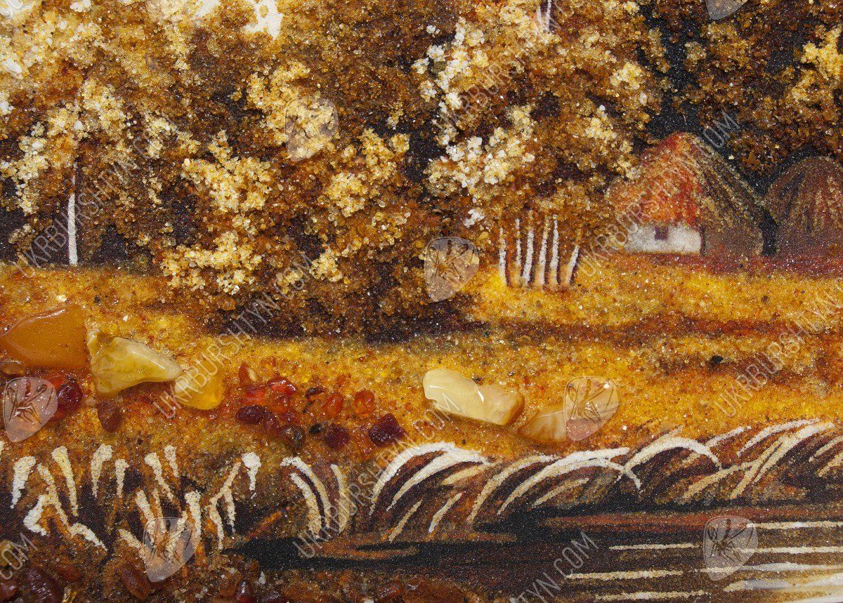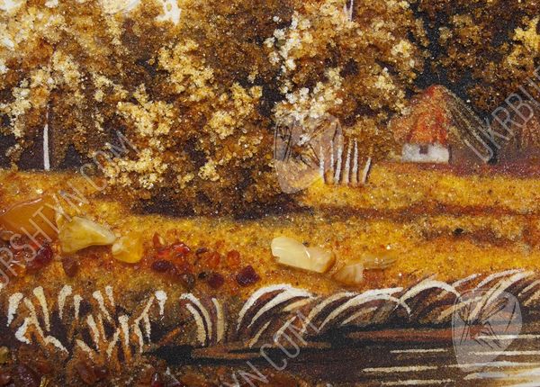 Отбирая стильные и привлекательные картины в спальню, стоит отдавать предпочтение красивым и безмятежным пейзажам – таким, как это панно из янтаря. Мастер запечатлел идиллический деревенский уголок – под сенью высоких деревьев притаился маленький, уютный домик, а возле него раскинулось небольшое озерцо, поросшее камышом и рогозом. Естественные, неяркие тона произведения помогут расслабиться после долгого, трудного дня. А благодаря тому, что изображение высыпано из мелкой каменной крошки и украшено цельными самоцветами, оно обрело объём и выразительность – поэтому, только взглянув на работу, Вы сможете мысленно перенестись в жаркий летний день, наполненный негой и спокойствием.