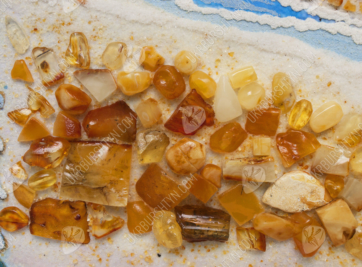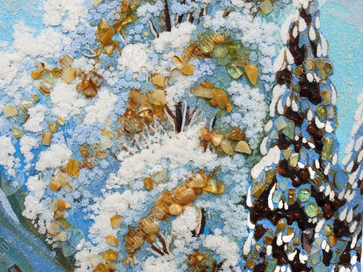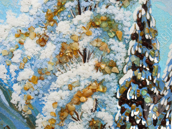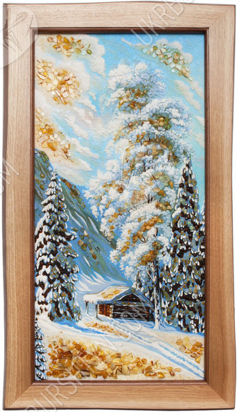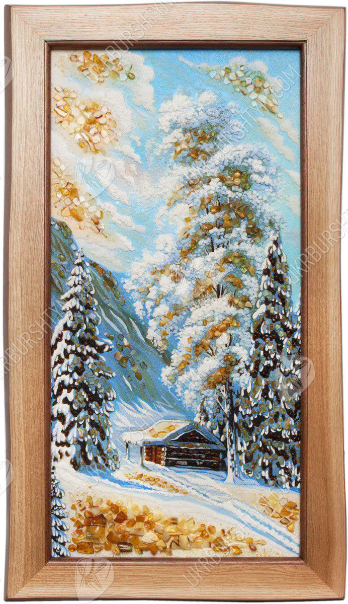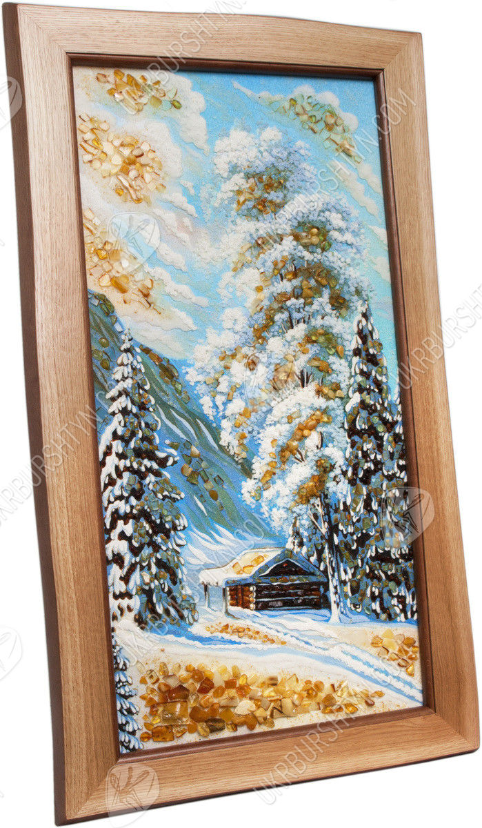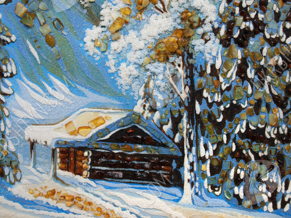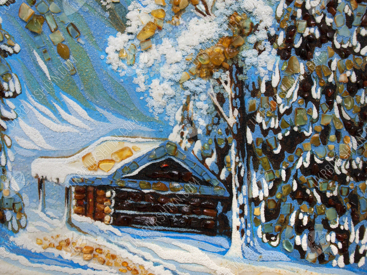 Зимний пейзаж – домик у подножия усыпанных снегом гор, над которым раскинулись заиндевевшие ветви вековых елей и стройной берёзы – дополнен инкрустацией из золотистых, кремовых, охровых драгоценных камней. Полесские самоцветы мерцают и переливаются, привнося в палитру разнообразие. А уж когда Вы разместите произведение на хорошо освещённой стене, оно буквально оживёт!